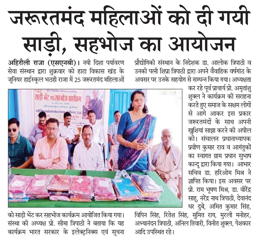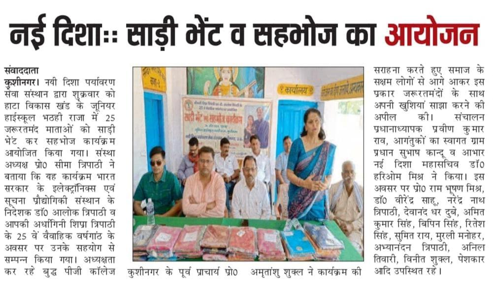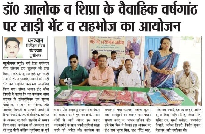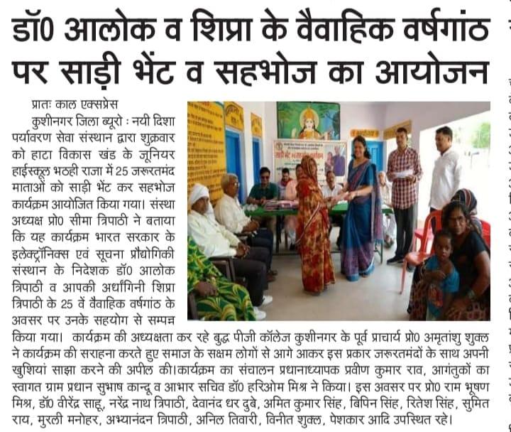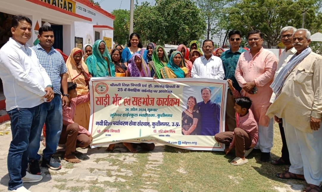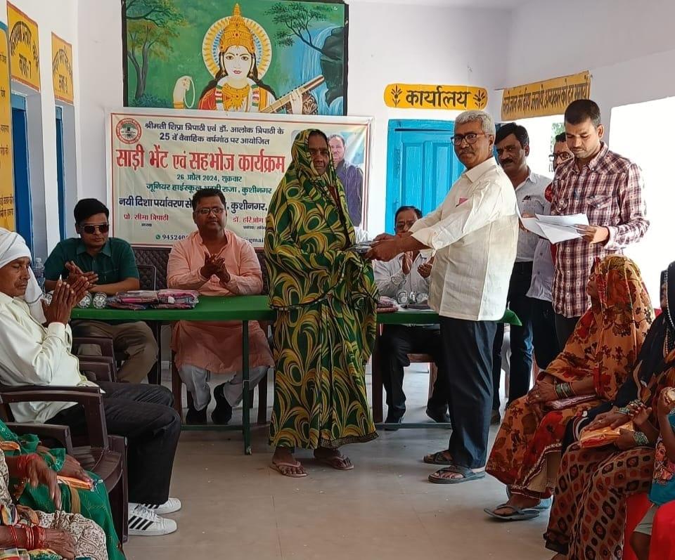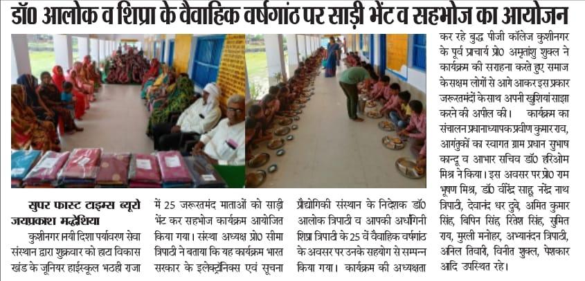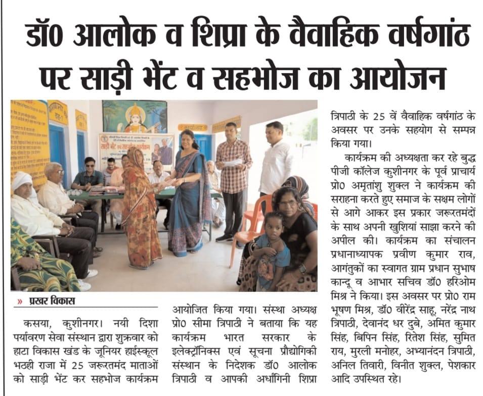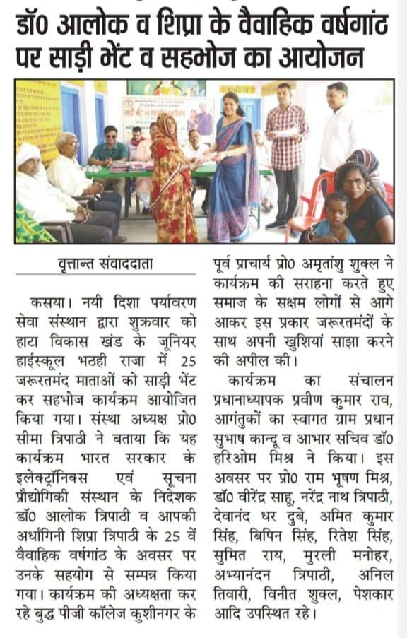 संस्थान द्वारा हाटा विकास खंड के जूनियर हाईस्कूल भठही राजा में भारत सरकार के इलेक्ट्रॉनिक्स एवं सूचना प्रौद्योगिकी संस्थान के निदेशक डॉ0 आलोक त्रिपाठी व आपकी अर्धांगिनी श्रीमती शिप्रा त्रिपाठी के 25 वें वैवाहिक वर्षगांठ के अवसर पर आपके सहयोग से 25 जरूरतमंद माताओं को साड़ी भेंट कर सहभोज किया गया।