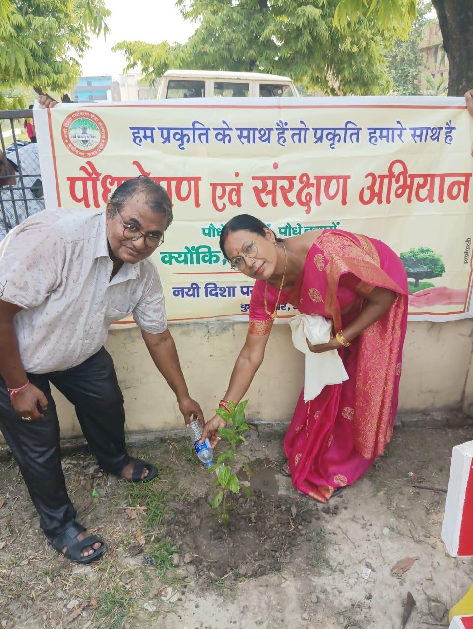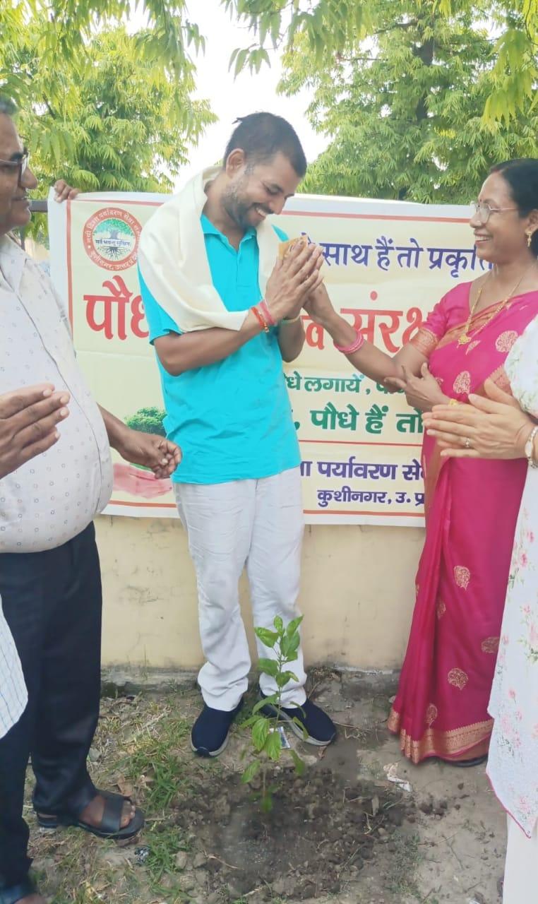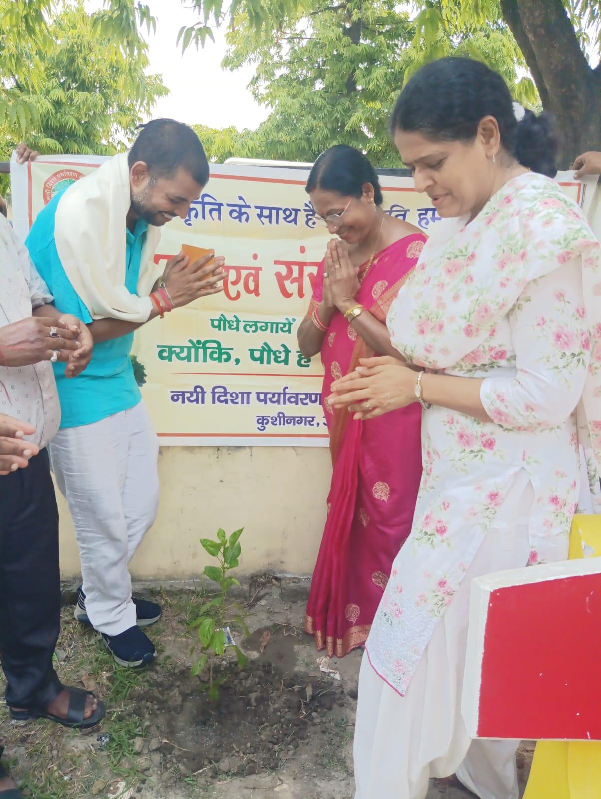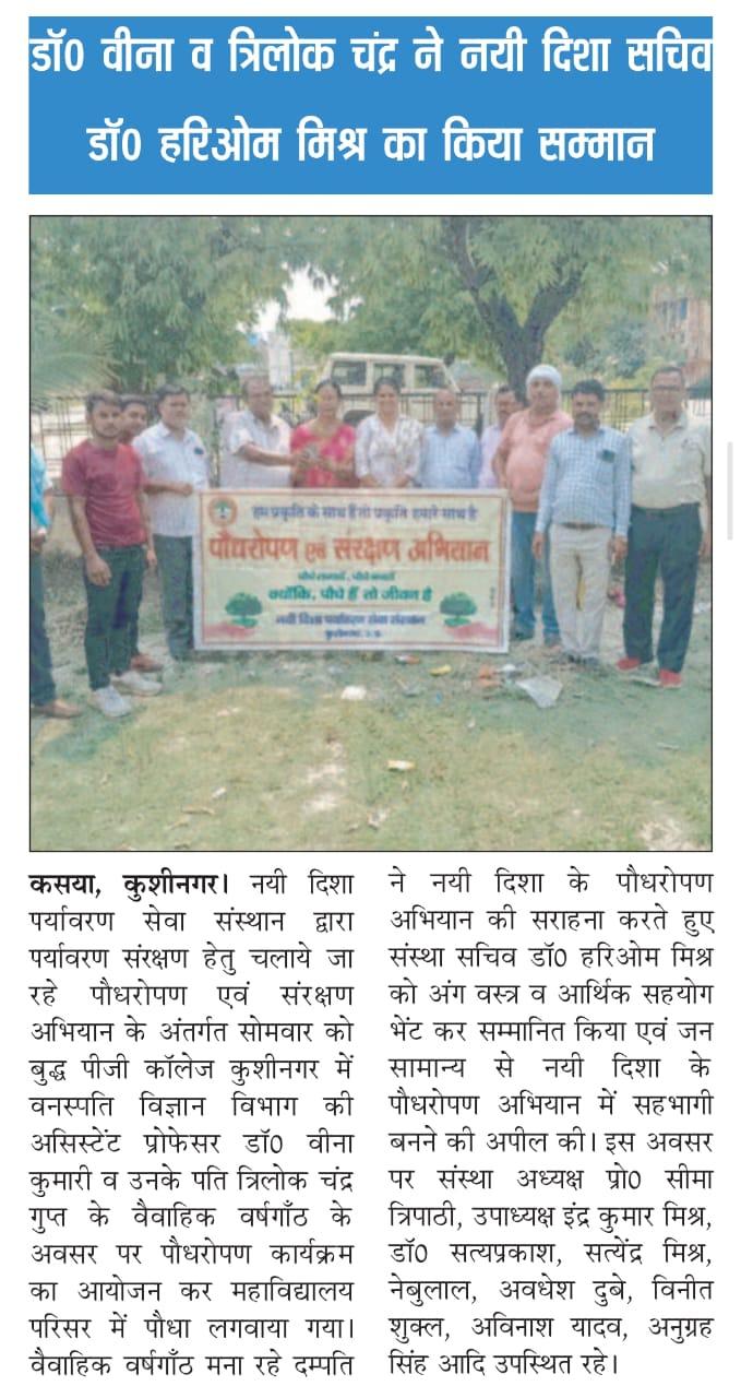 संस्थान द्वारा पर्यावरण संरक्षण हेतु चलाये जा रहे पौधरोपण अभियान के अंतर्गत बुद्ध पीजी कॉलेज कुशीनगर में वनस्पति विज्ञान विभाग की असिस्टेंट प्रोफेसर डॉ0 वीना कुमारी व आपके पति श्री त्रिलोक चंद्र गुप्ता के वैवाहिक वर्षगाँठ के सुअवसर पर महाविद्यालय परिसर में पौधरोपण कार्यक्रम आयोजित हुआ। वैवाहिक वर्षगाँठ मना रहे दम्पति ने नयी दिशा के पौधरोपण अभियान की सराहना करते हुए संस्था सचिव डॉ0 हरिओम मिश्र को अंग वस्त्र से सम्मानित कर आर्थिक सहयोग भी भेंट किया।