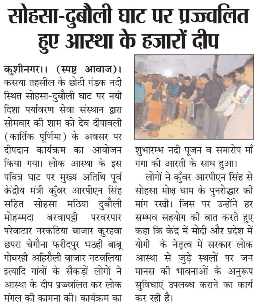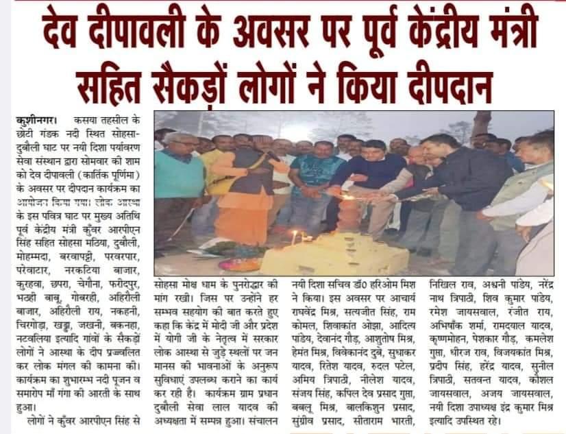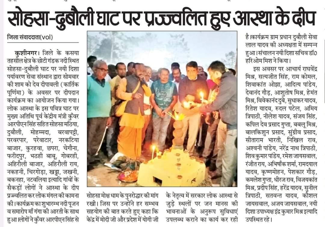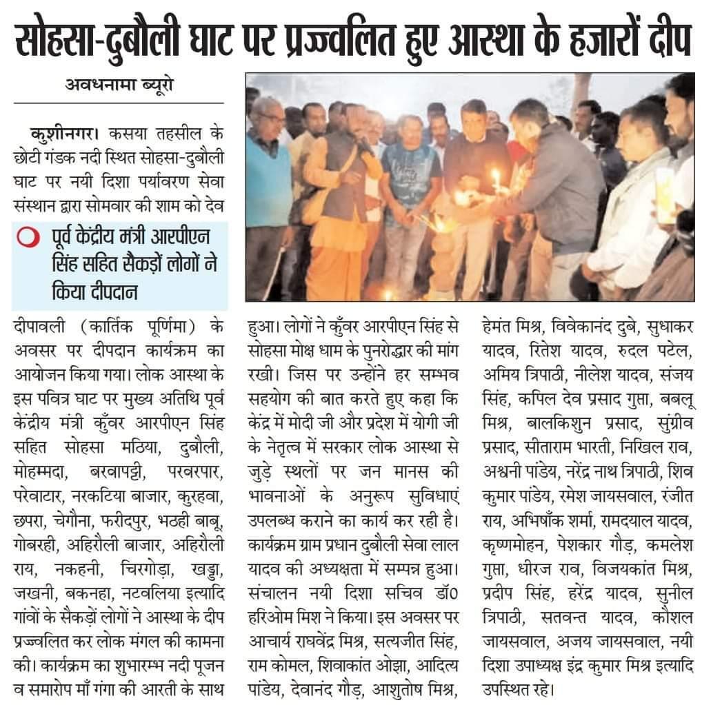 कुशीनगर जनपद के कसया तहसील स्थित छोटी गंडक नदी के सोहसा-दुबौली घाट पर संस्थान द्वारा देव दीपावली (कार्तिक पूर्णिमा) के सुअवसर पर दीपदान कार्यक्रम का आयोजन किया गया। लोक आस्था के इस पवित्र घाट पर मुख्य अतिथि पूर्व केंद्रीय मंत्री माननीय कुँवर आरपीएन सिंह जी सहित सोहसा मठिया, दुबौली, मोहम्मदा, बरवापट्टी, परवरपार, परेवाटार, नरकटिया बाजार, कुरहवा, छपरा, चेगौना, फरीदपुर, भठही बाबू, गोबरही, अहिरौली बाजार, अहिरौली राय, नकहनी, चिरगोड़ा, खड्डा, जखनी, बकनहा, नटवलिया इत्यादि दर्जनों गांवों के सैकड़ों लोगों ने आस्था के हजारों दीप प्रज्ज्वलित कर लोक मंगल की कामना की। कार्यक्रम का शुभारम्भ नदी पूजन व समारोप माँ गंगा की आरती के साथ हुआ।