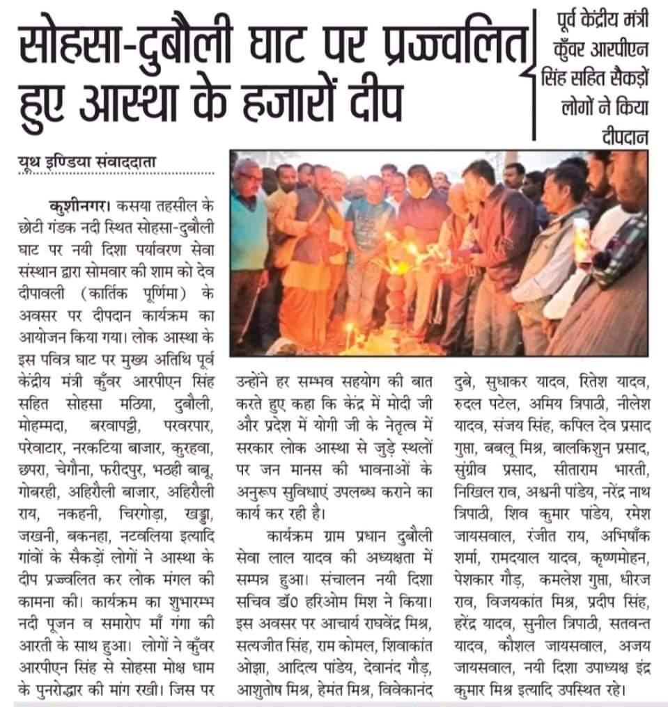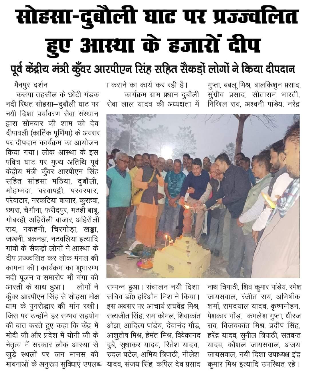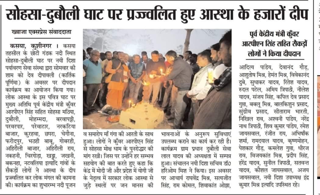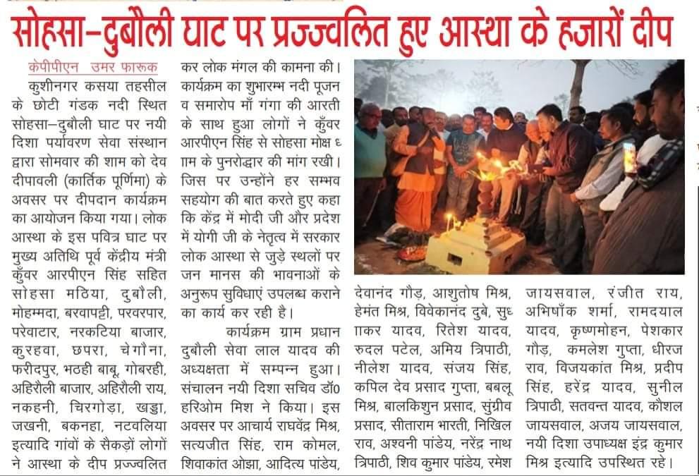 कुशीनगर जनपद के कसया तहसील स्थित छोटी गंडक नदी के सोहसा-दुबौली घाट पर संस्थान द्वारा देव दीपावली (कार्तिक पूर्णिमा) के सुअवसर पर दीपदान कार्यक्रम का आयोजन किया गया। लोक आस्था के इस पवित्र घाट पर मुख्य अतिथि पूर्व केंद्रीय मंत्री माननीय कुँवर आरपीएन सिंह जी सहित सोहसा मठिया, दुबौली, मोहम्मदा, बरवापट्टी, परवरपार, परेवाटार, नरकटिया बाजार, कुरहवा, छपरा, चेगौना, फरीदपुर, भठही बाबू, गोबरही, अहिरौली बाजार, अहिरौली राय, नकहनी, चिरगोड़ा, खड्डा, जखनी, बकनहा, नटवलिया इत्यादि दर्जनों गांवों के सैकड़ों लोगों ने आस्था के हजारों दीप प्रज्ज्वलित कर लोक मंगल की कामना की। कार्यक्रम का शुभारम्भ नदी पूजन व समारोप माँ गंगा की आरती के साथ हुआ।