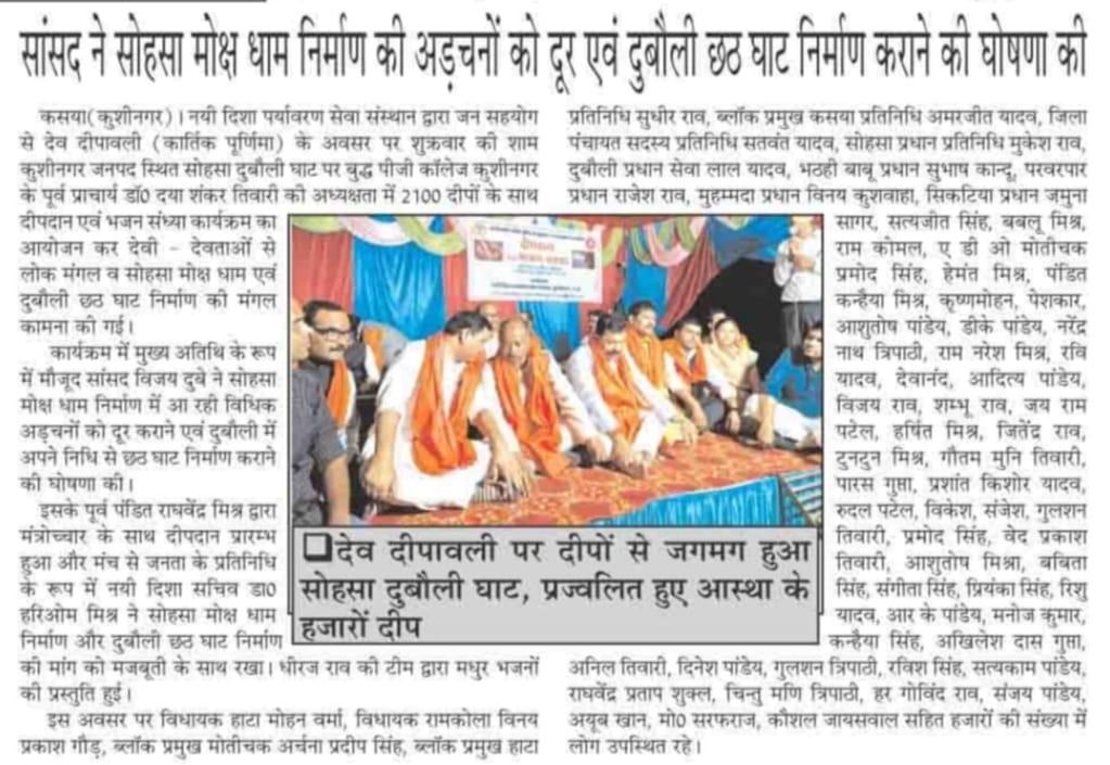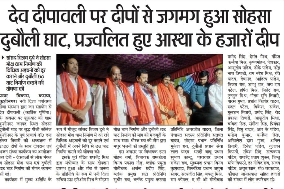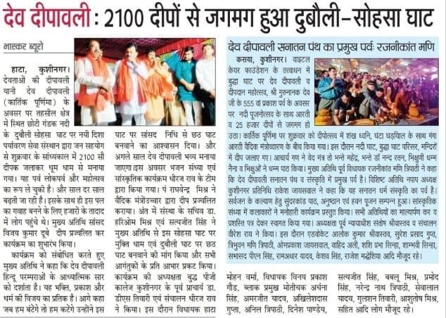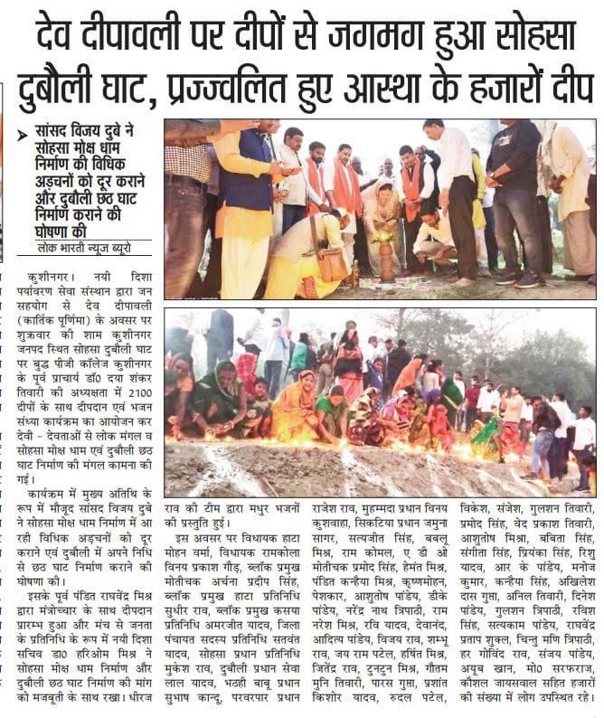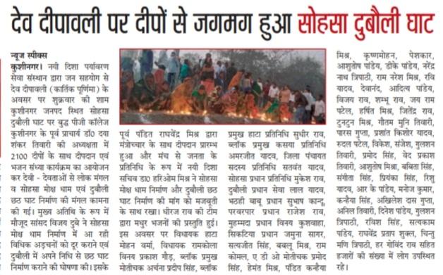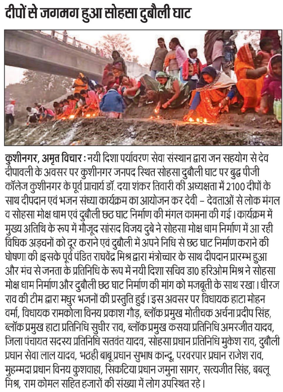 संस्थान द्वारा देव दीपावली (कार्तिक पूर्णिमा) के सुअवसर पर जन सहयोग से कुशीनगर जनपद स्थित सोहसा दुबौली घाट पर बुद्ध पीजी कॉलेज कुशीनगर के पूर्व प्राचार्य गुरुवर डॉ0 दया शंकर तिवारी की अध्यक्षता में 2100 दीपों के साथ दीपदान एवं भजन संध्या कार्यक्रम का आयोजन कर देवी - देवताओं से लोक मंगल व सोहसा मोक्ष धाम एवं दुबौली छठ घाट निर्माण की मंगल कामना की गई।