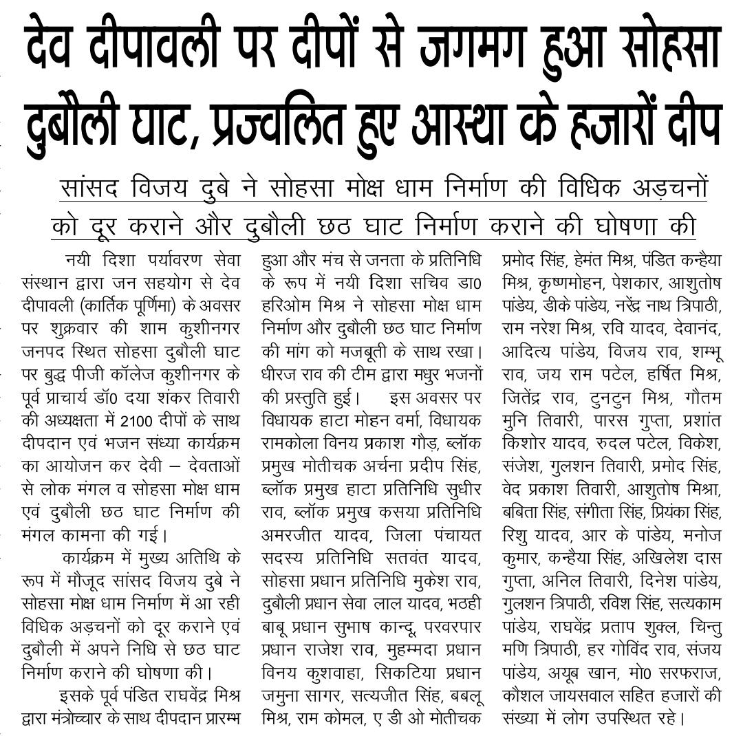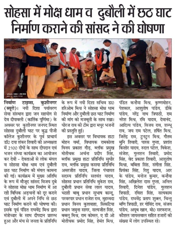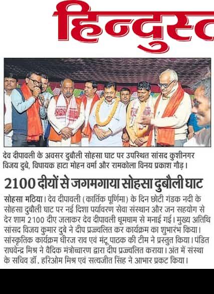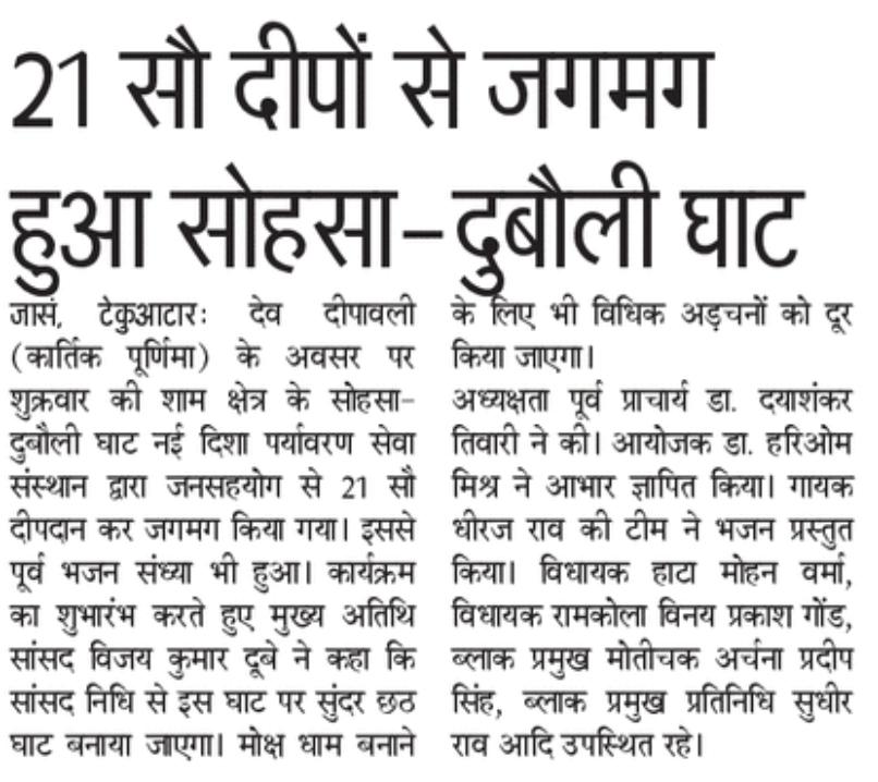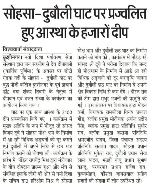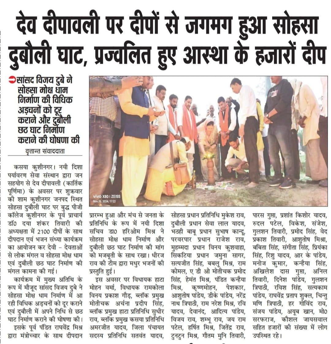 संस्थान द्वारा देव दीपावली (कार्तिक पूर्णिमा) के सुअवसर पर जन सहयोग से कुशीनगर जनपद स्थित सोहसा दुबौली घाट पर बुद्ध पीजी कॉलेज कुशीनगर के पूर्व प्राचार्य गुरुवर डॉ0 दया शंकर तिवारी की अध्यक्षता में 2100 दीपों के साथ दीपदान एवं भजन संध्या कार्यक्रम का आयोजन कर देवी - देवताओं से लोक मंगल व सोहसा मोक्ष धाम एवं दुबौली छठ घाट निर्माण की मंगल कामना की गई।