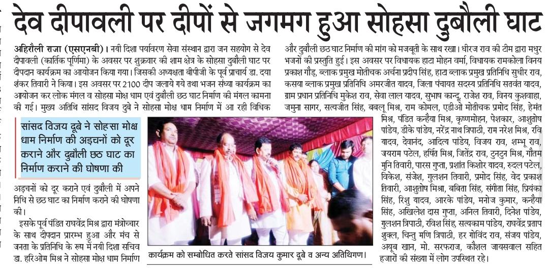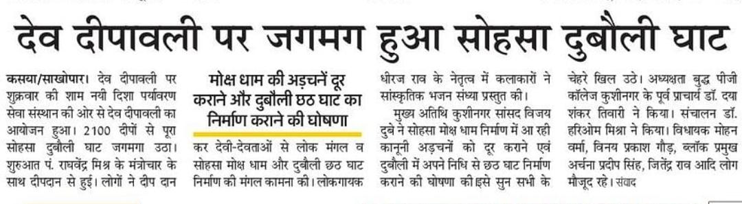 मंच से जनता की आवाज के रूप में सोहसा मोक्ष धाम और दुबौली छठ घाट निर्माण की बात को संस्था द्वारा मजबूती से रखा गया और मा0 सांसद श्री विजय दुबे ने जनता के समक्ष इन दोनों मांगो को पूर्ण कराने की बात कही।