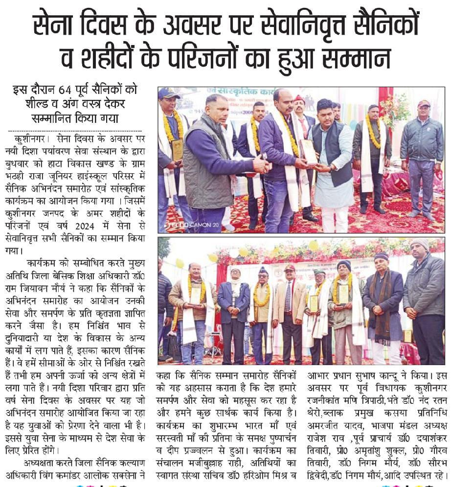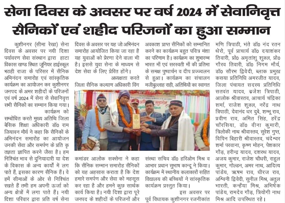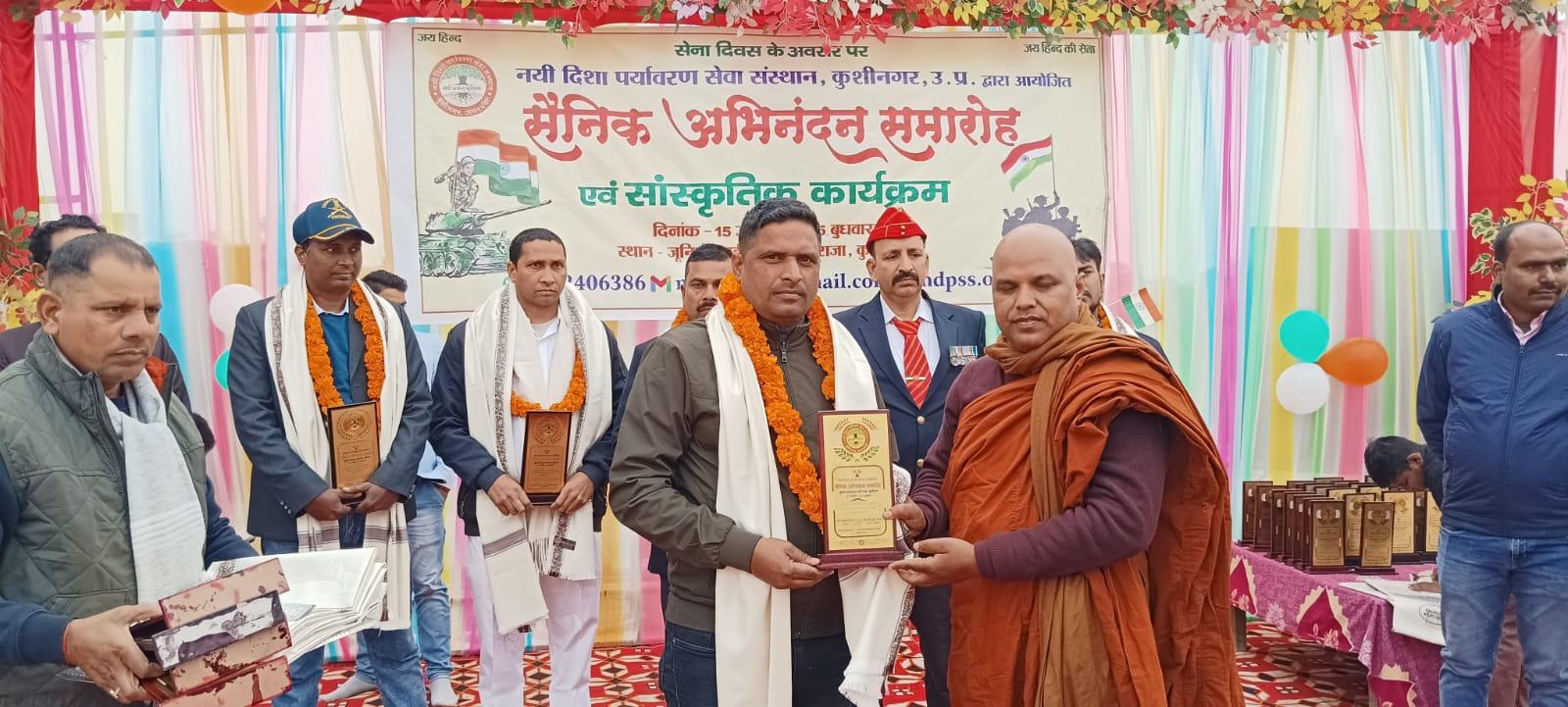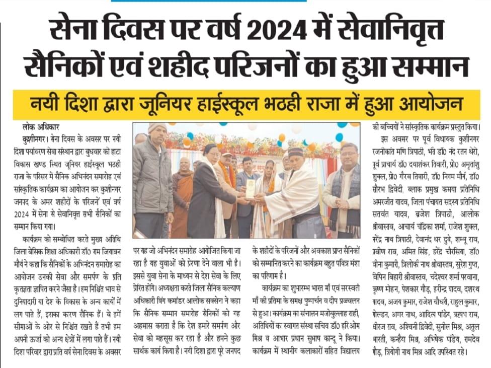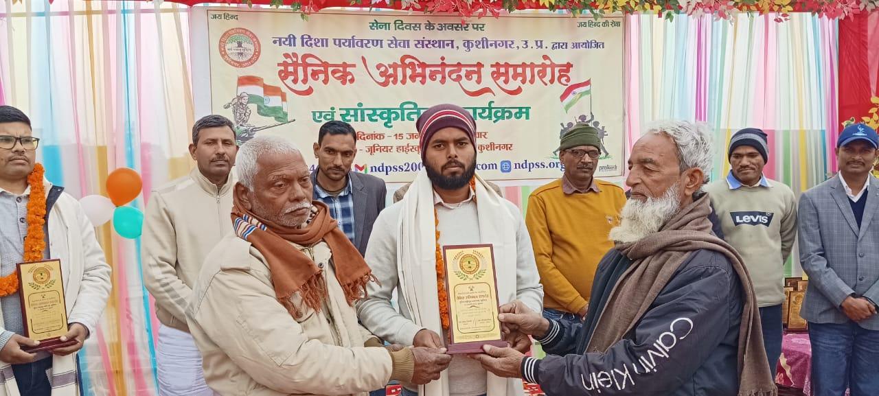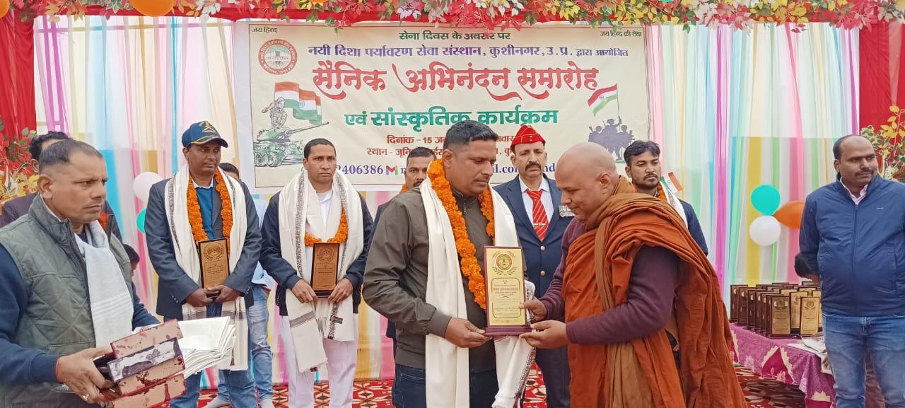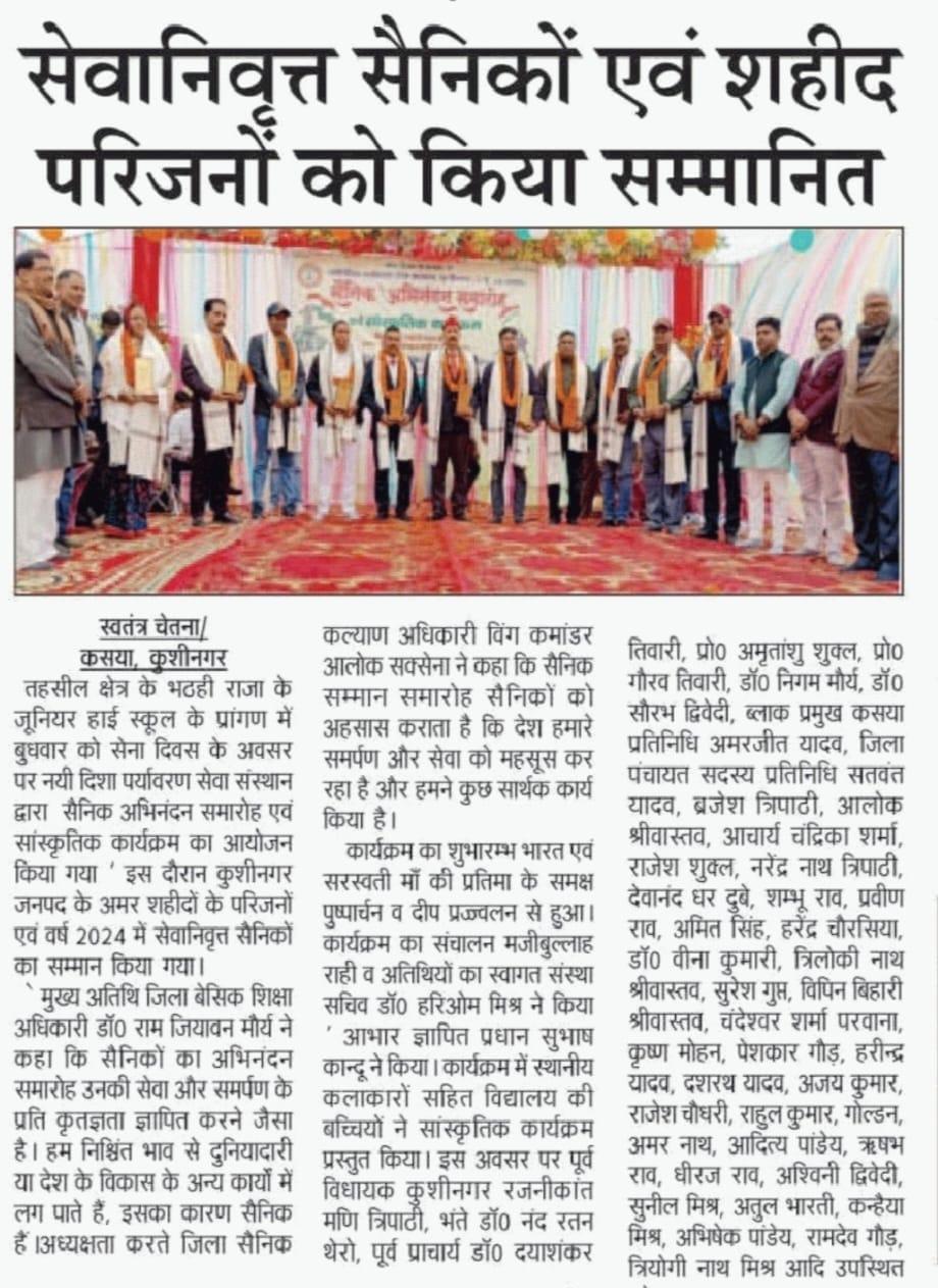 सेना दिवस के अवसर पर संस्थान द्वारा जूनियर हाईस्कूल भठही राजा, कुशीनगर के परिसर में सैनिक अभिनंदन समारोह एवं सांस्कृतिक कार्यक्रम का आयोजन कर कुशीनगर जनपद के अमर शहीदों के परिजनों एवं वर्ष 2024 में सेना से सेवानिवृत्त सभी सैनिकों का सम्मान किया गया।