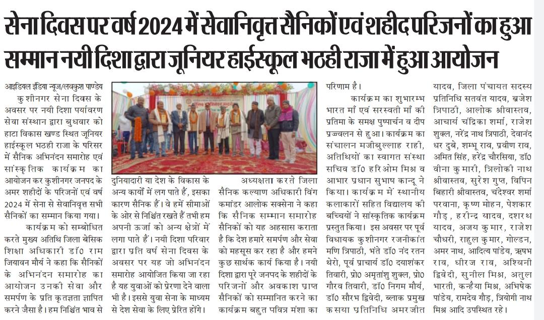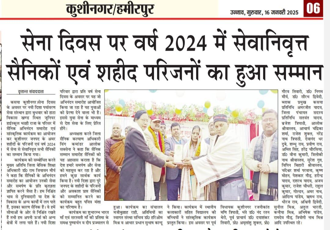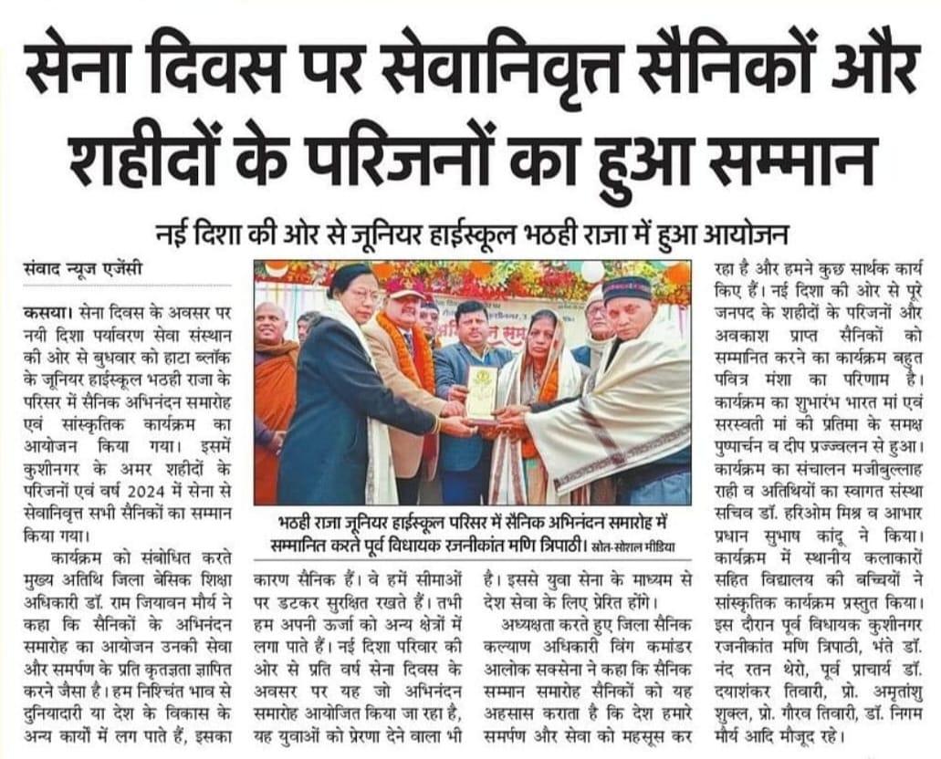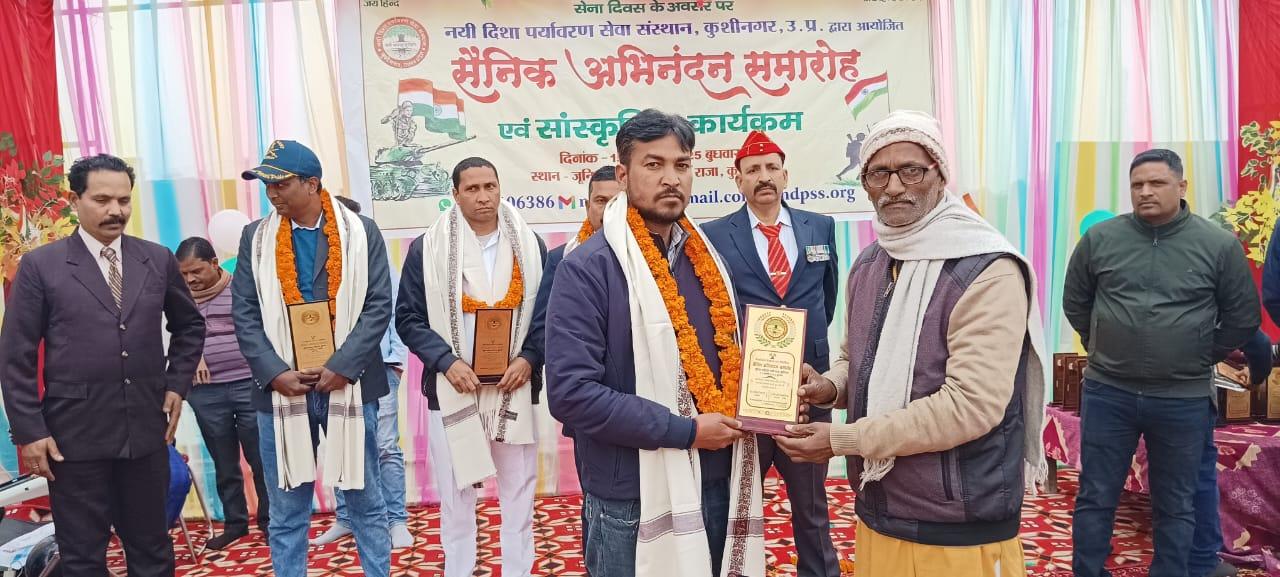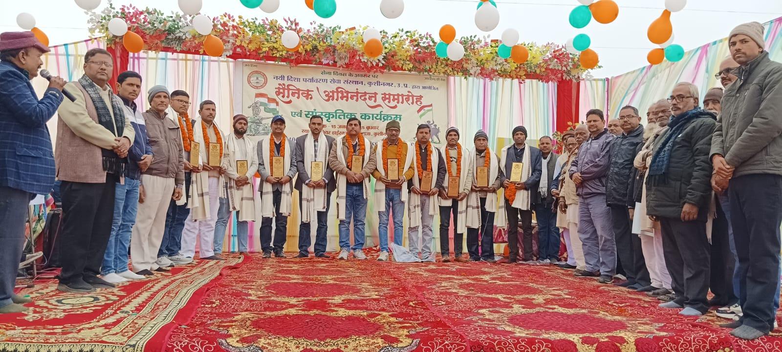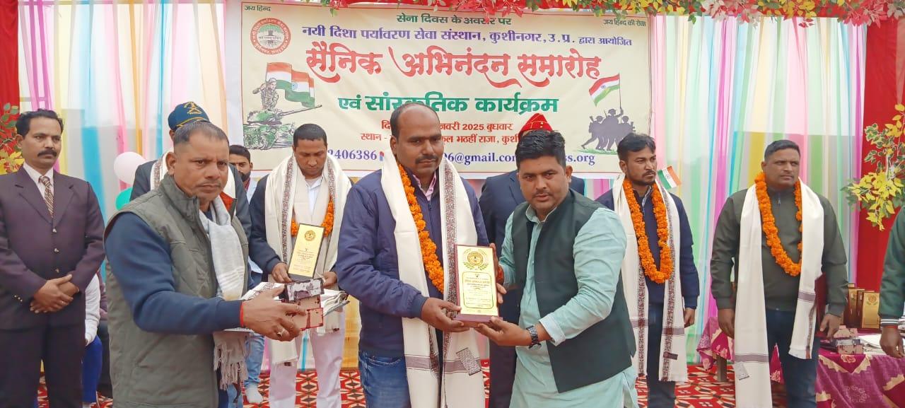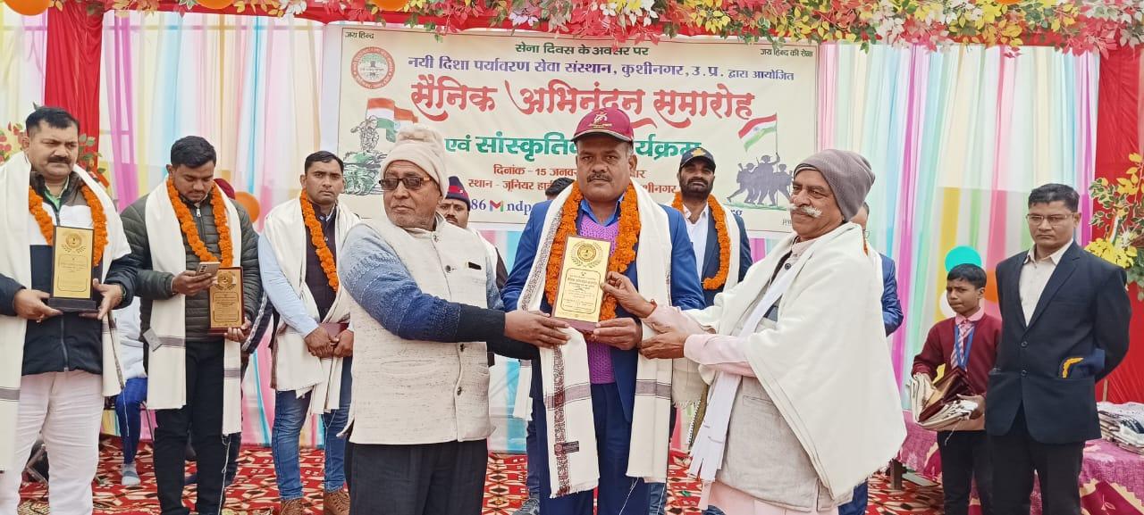 सेना दिवस के अवसर पर संस्थान द्वारा जूनियर हाईस्कूल भठही राजा, कुशीनगर के परिसर में सैनिक अभिनंदन समारोह एवं सांस्कृतिक कार्यक्रम का आयोजन कर कुशीनगर जनपद के अमर शहीदों के परिजनों एवं वर्ष 2024 में सेना से सेवानिवृत्त सभी सैनिकों का सम्मान किया गया।