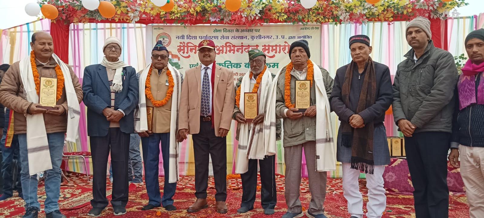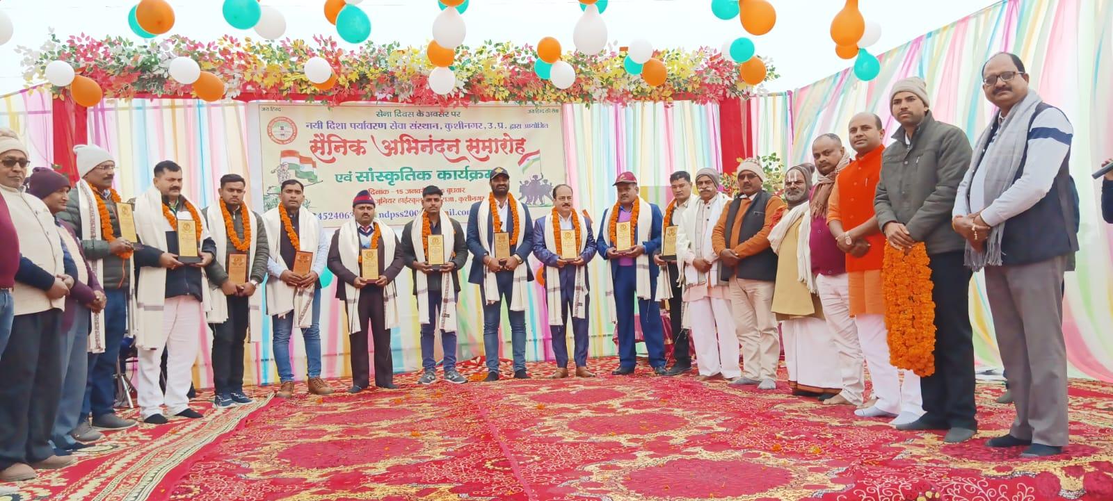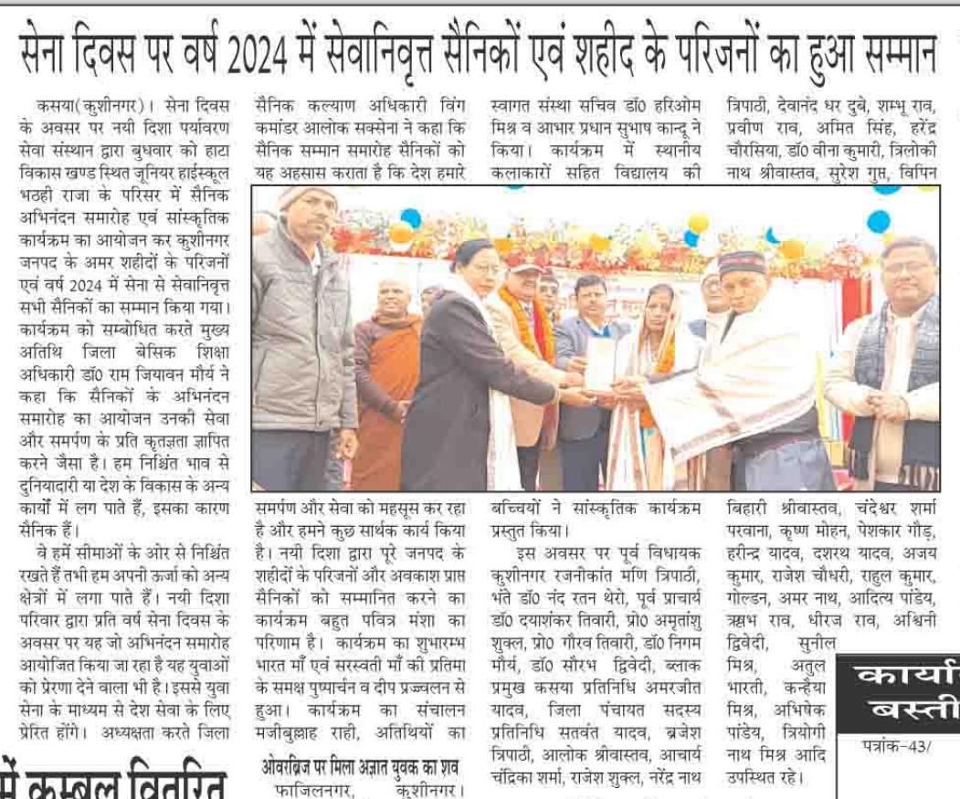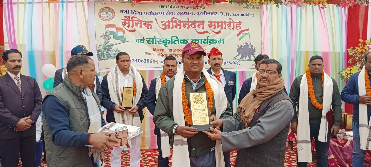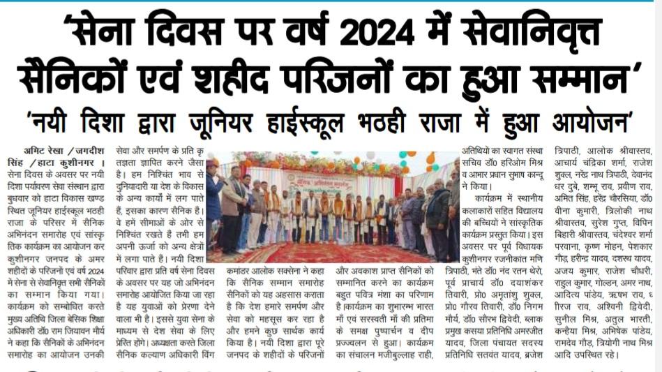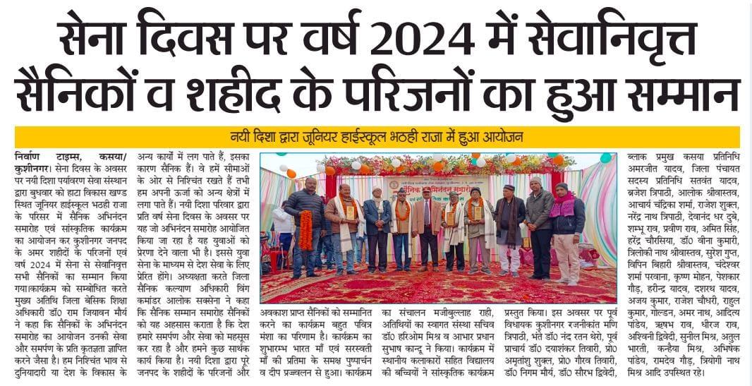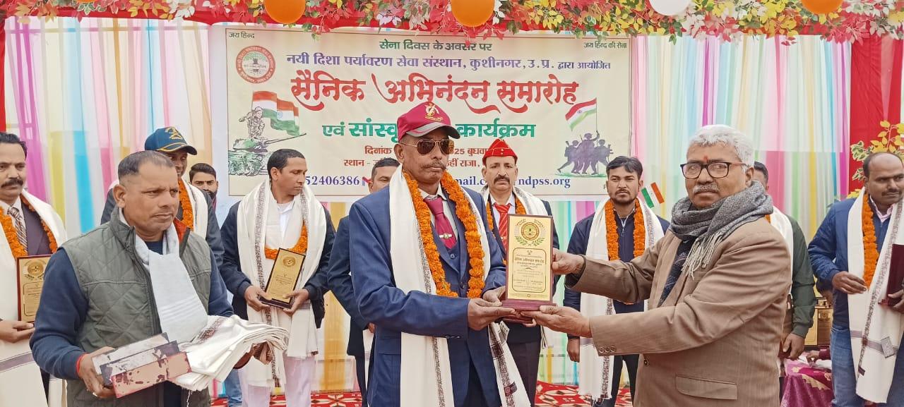 सेना दिवस के अवसर पर संस्थान द्वारा जूनियर हाईस्कूल भठही राजा, कुशीनगर के परिसर में सैनिक अभिनंदन समारोह एवं सांस्कृतिक कार्यक्रम का आयोजन कर कुशीनगर जनपद के अमर शहीदों के परिजनों एवं वर्ष 2024 में सेना से सेवानिवृत्त सभी सैनिकों का सम्मान किया गया।