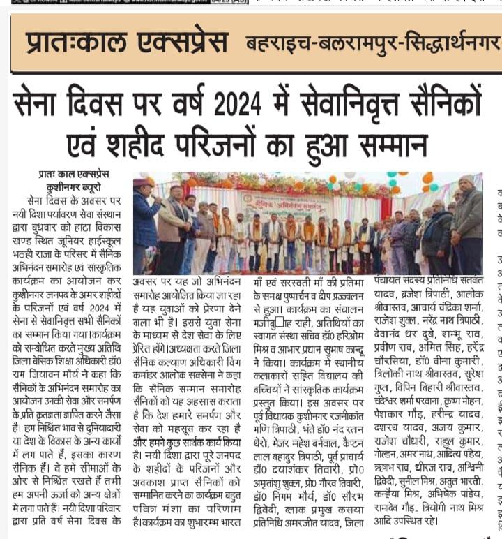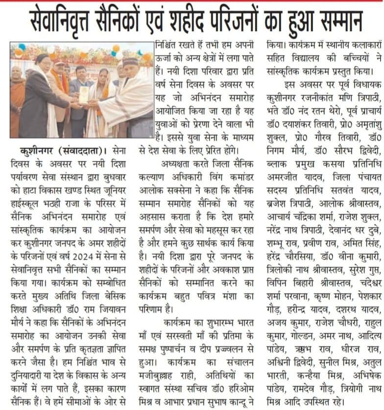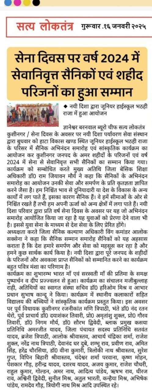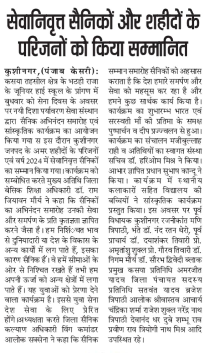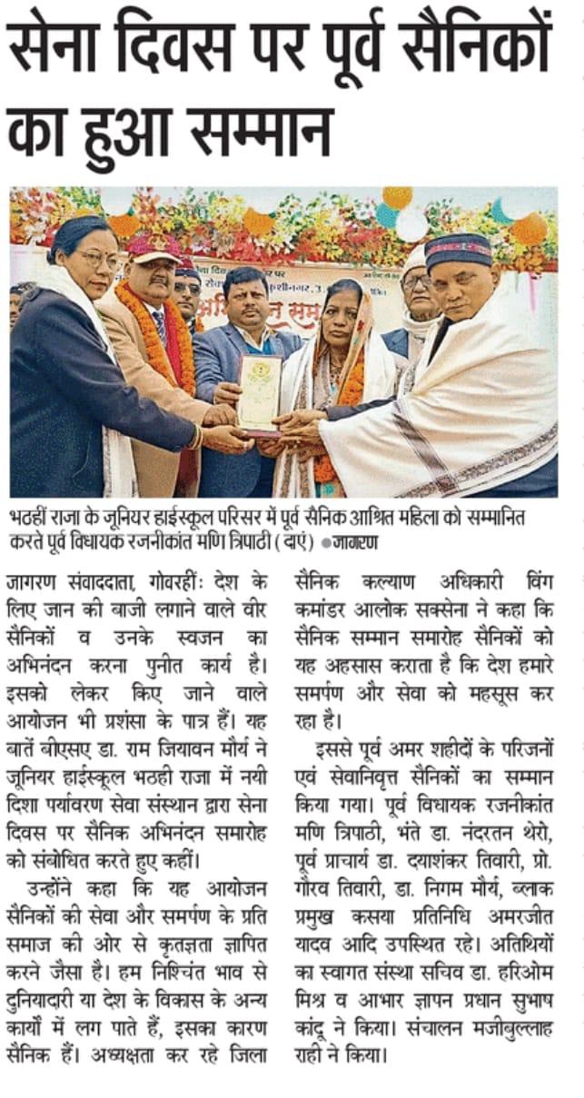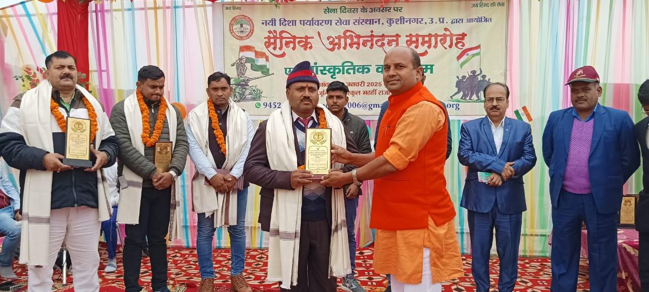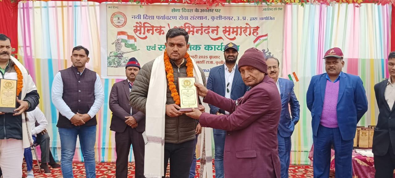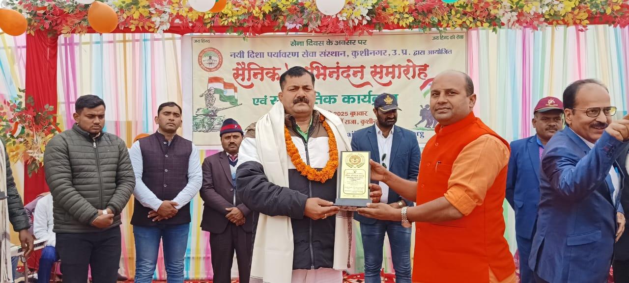 सेना दिवस के अवसर पर संस्थान द्वारा जूनियर हाईस्कूल भठही राजा, कुशीनगर के परिसर में सैनिक अभिनंदन समारोह एवं सांस्कृतिक कार्यक्रम का आयोजन कर कुशीनगर जनपद के अमर शहीदों के परिजनों एवं वर्ष 2024 में सेना से सेवानिवृत्त सभी सैनिकों का सम्मान किया गया।