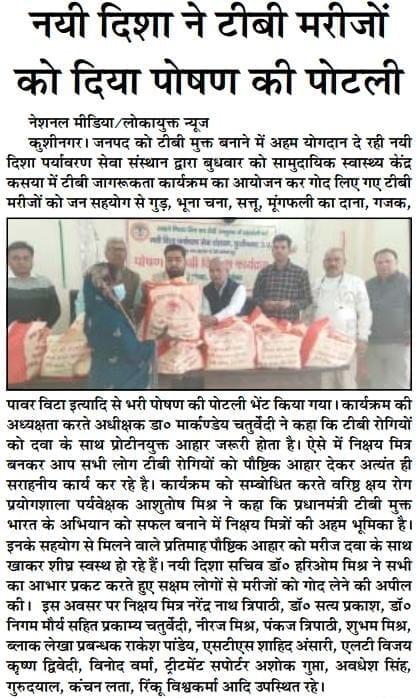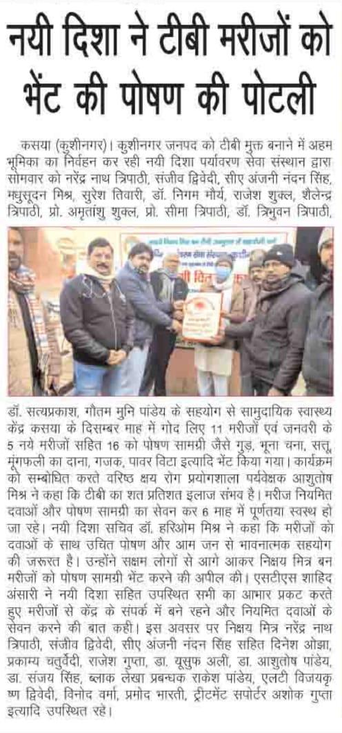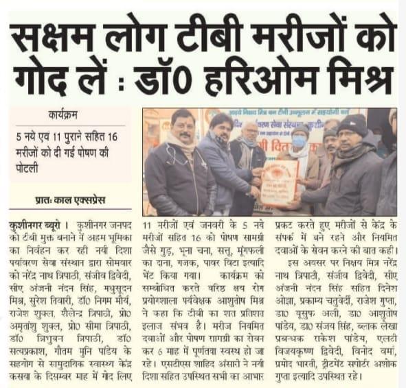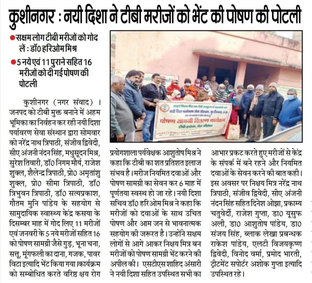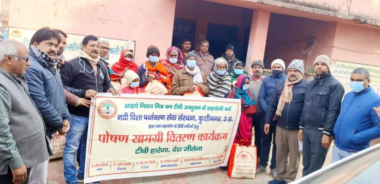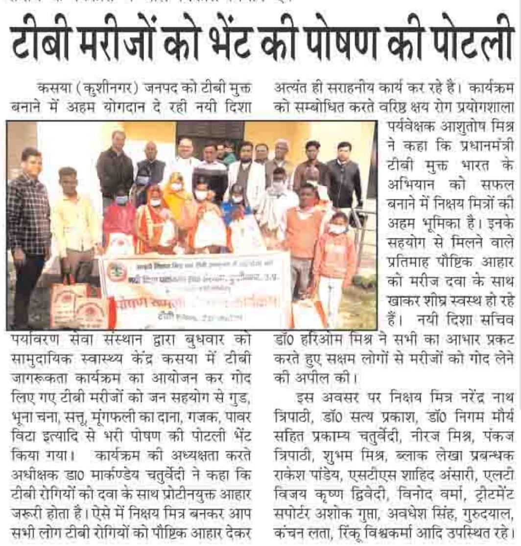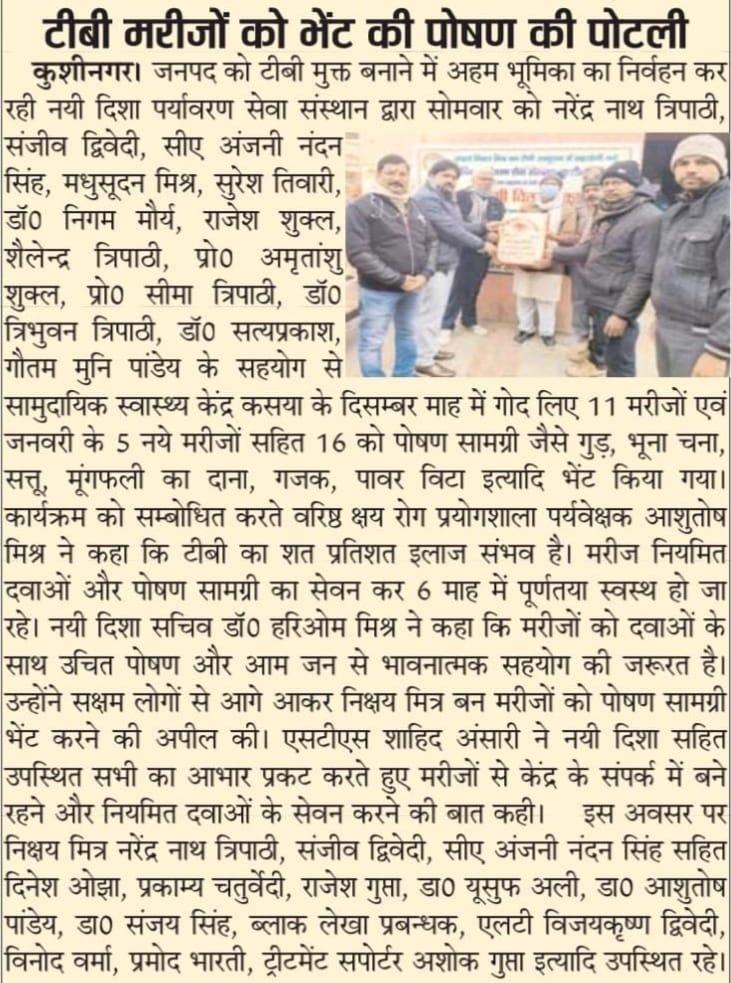 कुशीनगर जनपद को टीबी मुक्त बनाने के प्रयास में संस्थान द्वारा जन सहयोग से सामुदायिक स्वास्थ्य केंद्र कसया के दिसम्बर माह में गोद लिए 11 मरीजों एवं जनवरी के 5 नये मरीजों सहित 16 को पोषण सामग्री जैसे गुड़, भूना चना, सत्तू, मूंगफली का दाना, गजक, पावर विटा इत्यादि भेंट किया गया। निक्षय मित्र बन संस्थान को पोषण सामग्री उपलब्ध कराने वालों में श्री नरेंद्र नाथ त्रिपाठी, श्री संजीव द्विवेदी, सीए श्री अंजनी नंदन सिंह, श्री मधुसूदन मिश्र, श्री सुरेश तिवारी, डॉ0 निगम मौर्य, श्री राजेश शुक्ल, श्री शैलेन्द्र त्रिपाठी, प्रो0 अमृतांशु शुक्ल, प्रो0 सीमा त्रिपाठी, डॉ0 त्रिभुवन त्रिपाठी, डॉ0 सत्यप्रकाश, श्री गौतम मुनि पांडेय इत्यादि शामिल रहे।