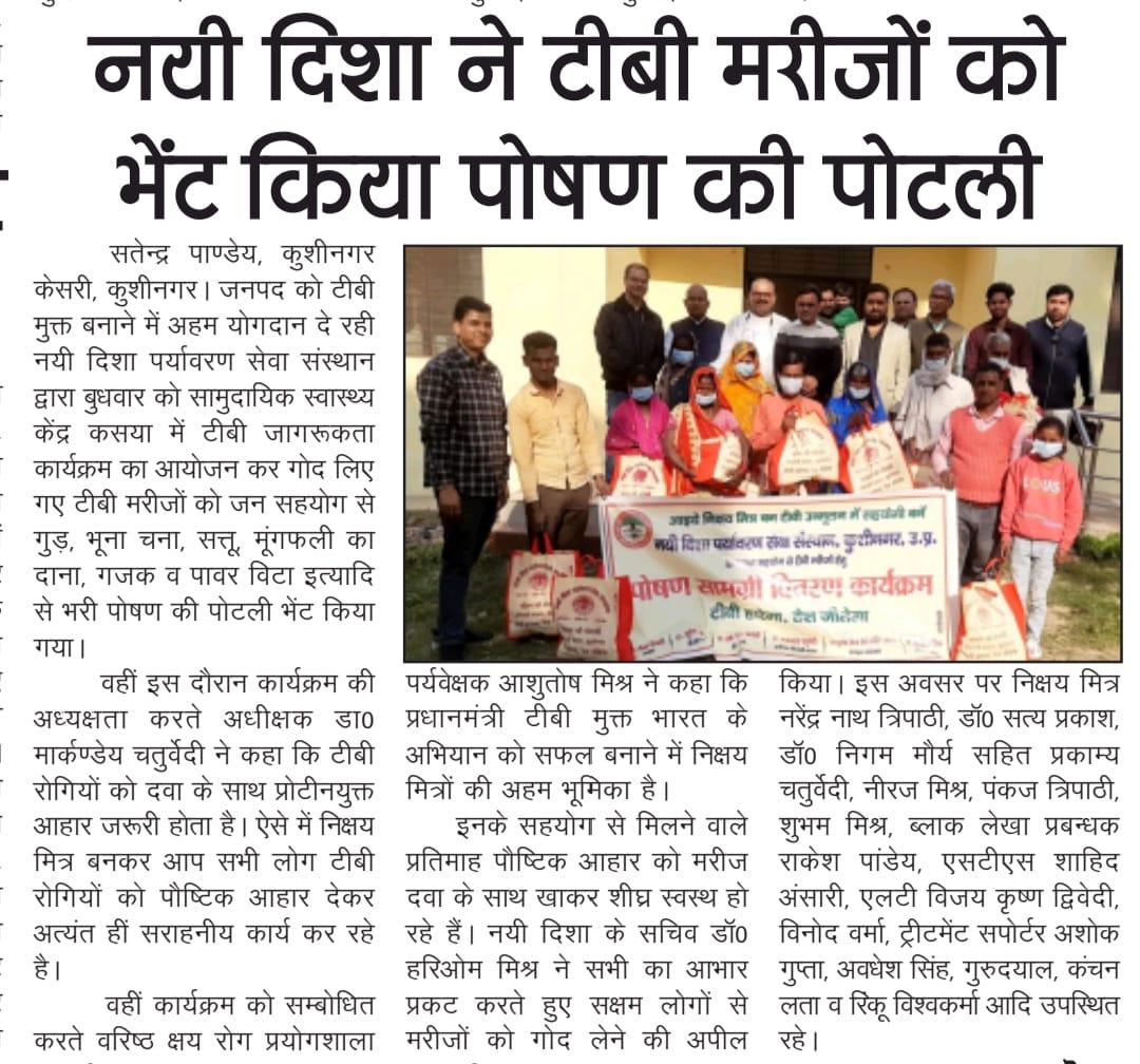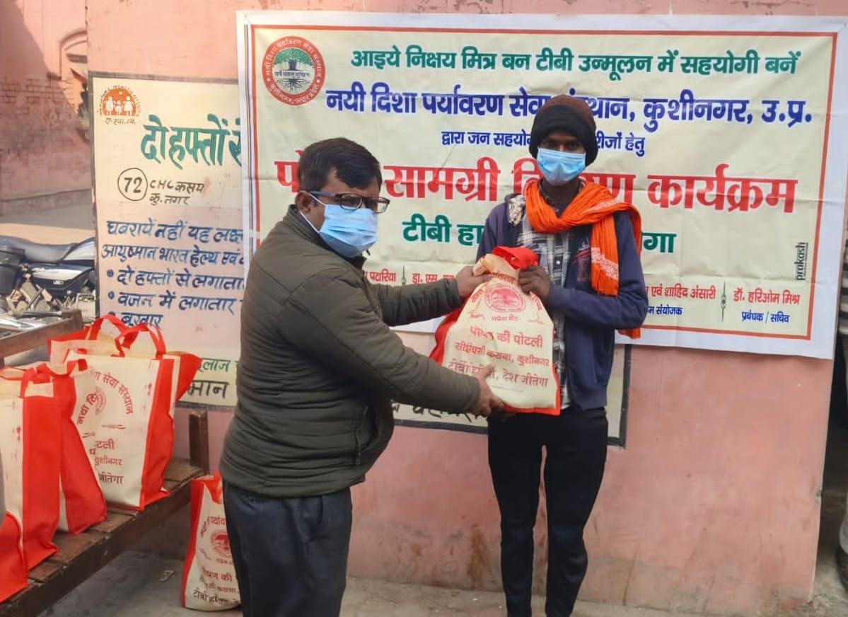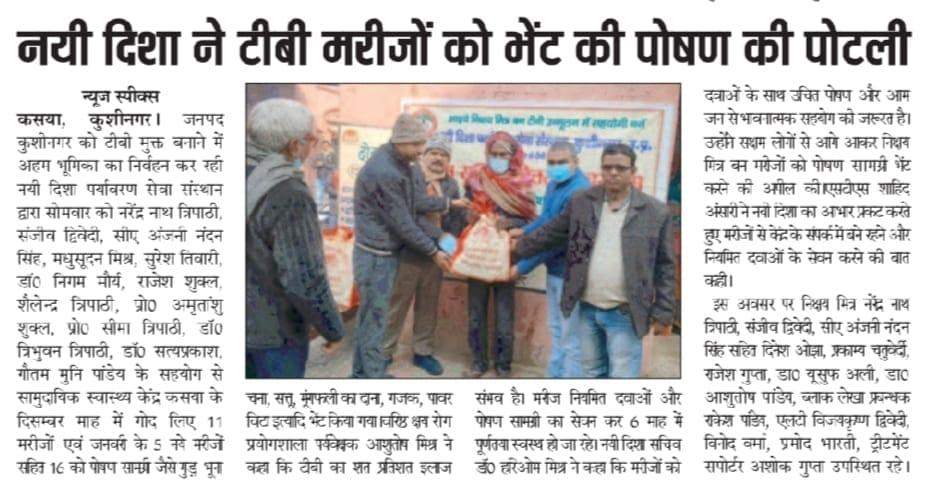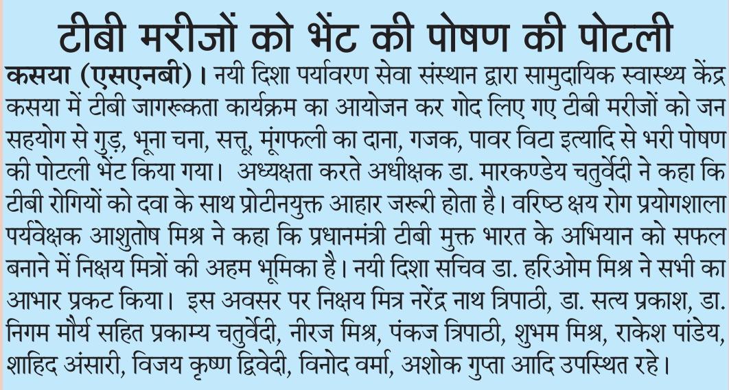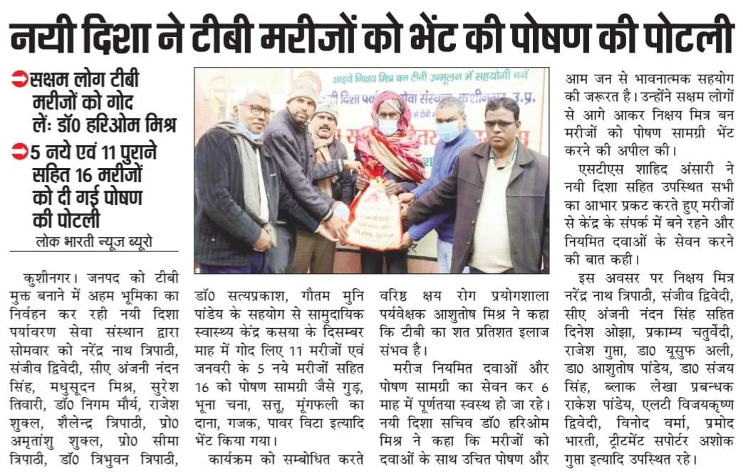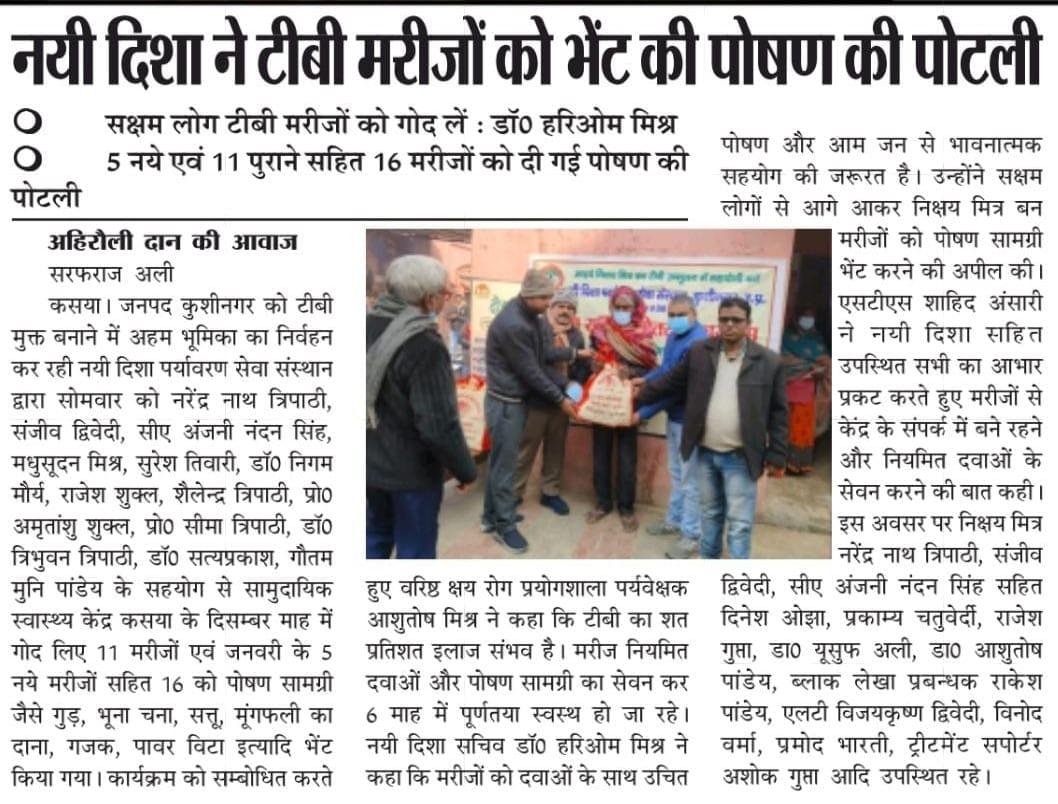 कुशीनगर जनपद को टीबी मुक्त बनाने के प्रयास में संस्थान द्वारा जन सहयोग से सामुदायिक स्वास्थ्य केंद्र कसया के दिसम्बर माह में गोद लिए 11 मरीजों एवं जनवरी के 5 नये मरीजों सहित 16 को पोषण सामग्री जैसे गुड़, भूना चना, सत्तू, मूंगफली का दाना, गजक, पावर विटा इत्यादि भेंट किया गया। निक्षय मित्र बन संस्थान को पोषण सामग्री उपलब्ध कराने वालों में श्री नरेंद्र नाथ त्रिपाठी, श्री संजीव द्विवेदी, सीए श्री अंजनी नंदन सिंह, श्री मधुसूदन मिश्र, श्री सुरेश तिवारी, डॉ0 निगम मौर्य, श्री राजेश शुक्ल, श्री शैलेन्द्र त्रिपाठी, प्रो0 अमृतांशु शुक्ल, प्रो0 सीमा त्रिपाठी, डॉ0 त्रिभुवन त्रिपाठी, डॉ0 सत्यप्रकाश, श्री गौतम मुनि पांडेय इत्यादि शामिल रहे।