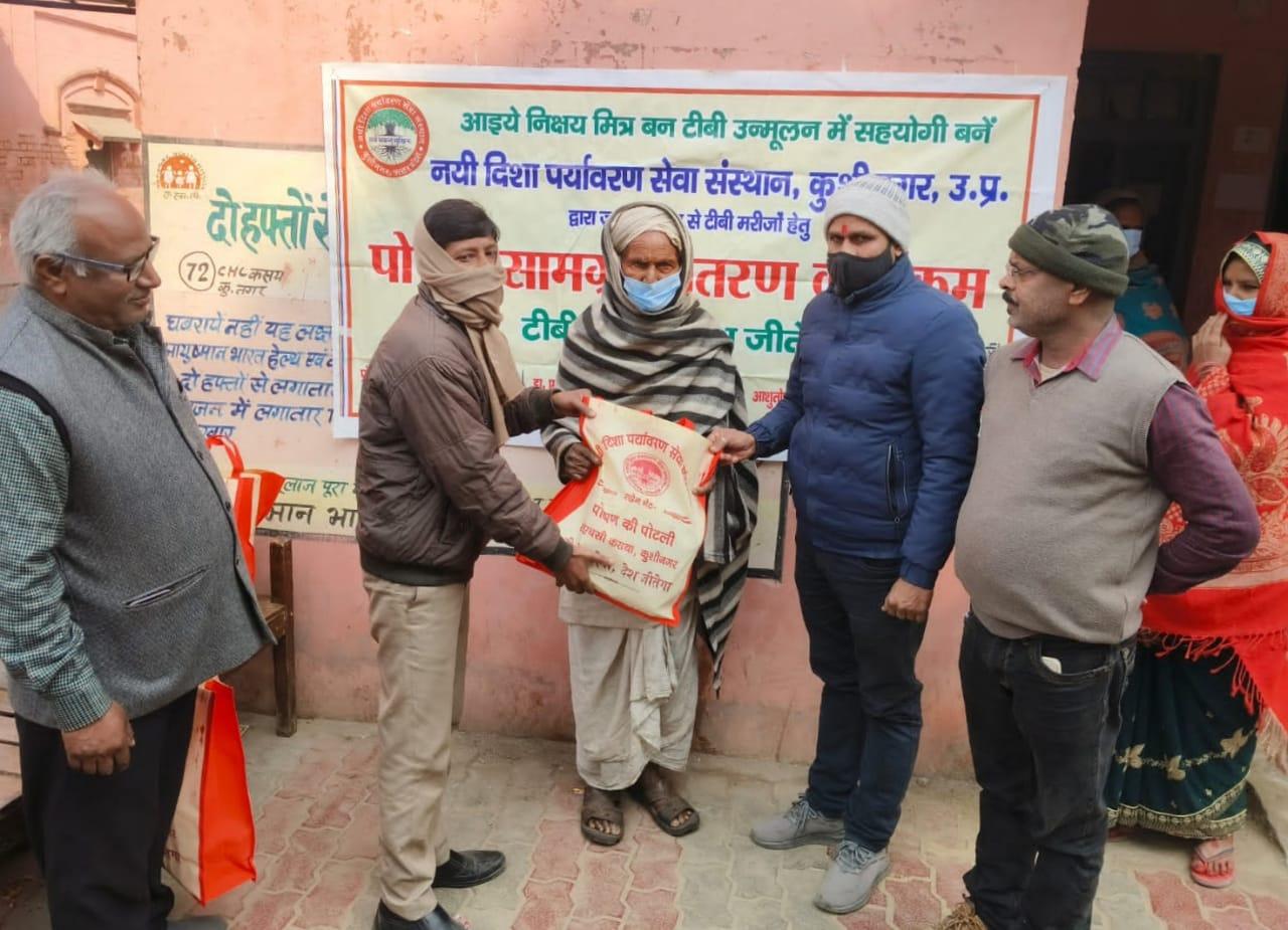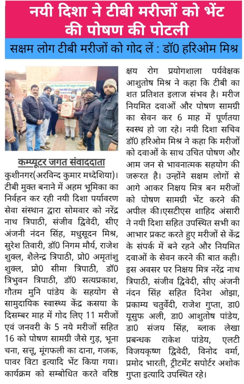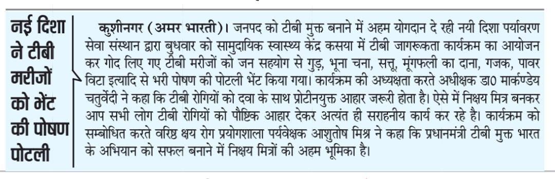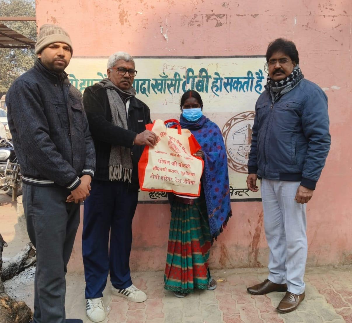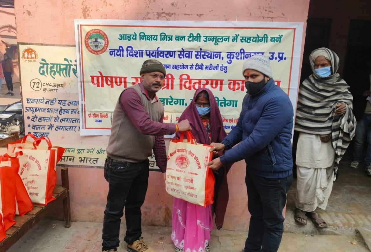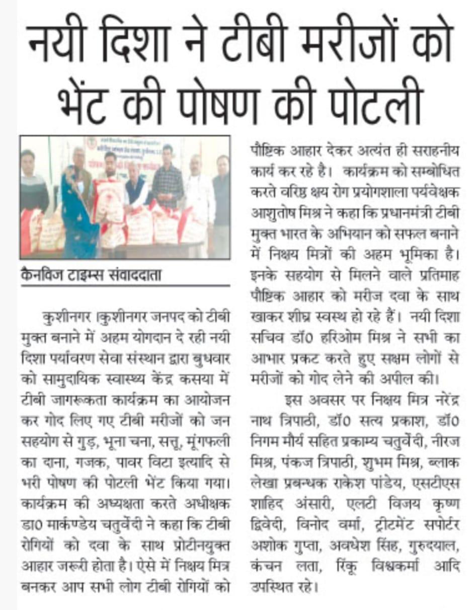 कुशीनगर जनपद को टीबी मुक्त बनाने के प्रयास में संस्थान द्वारा जन सहयोग से सामुदायिक स्वास्थ्य केंद्र कसया के दिसम्बर माह में गोद लिए 11 मरीजों एवं जनवरी के 5 नये मरीजों सहित 16 को पोषण सामग्री जैसे गुड़, भूना चना, सत्तू, मूंगफली का दाना, गजक, पावर विटा इत्यादि भेंट किया गया। निक्षय मित्र बन संस्थान को पोषण सामग्री उपलब्ध कराने वालों में श्री नरेंद्र नाथ त्रिपाठी, श्री संजीव द्विवेदी, सीए श्री अंजनी नंदन सिंह, श्री मधुसूदन मिश्र, श्री सुरेश तिवारी, डॉ0 निगम मौर्य, श्री राजेश शुक्ल, श्री शैलेन्द्र त्रिपाठी, प्रो0 अमृतांशु शुक्ल, प्रो0 सीमा त्रिपाठी, डॉ0 त्रिभुवन त्रिपाठी, डॉ0 सत्यप्रकाश, श्री गौतम मुनि पांडेय इत्यादि शामिल रहे।