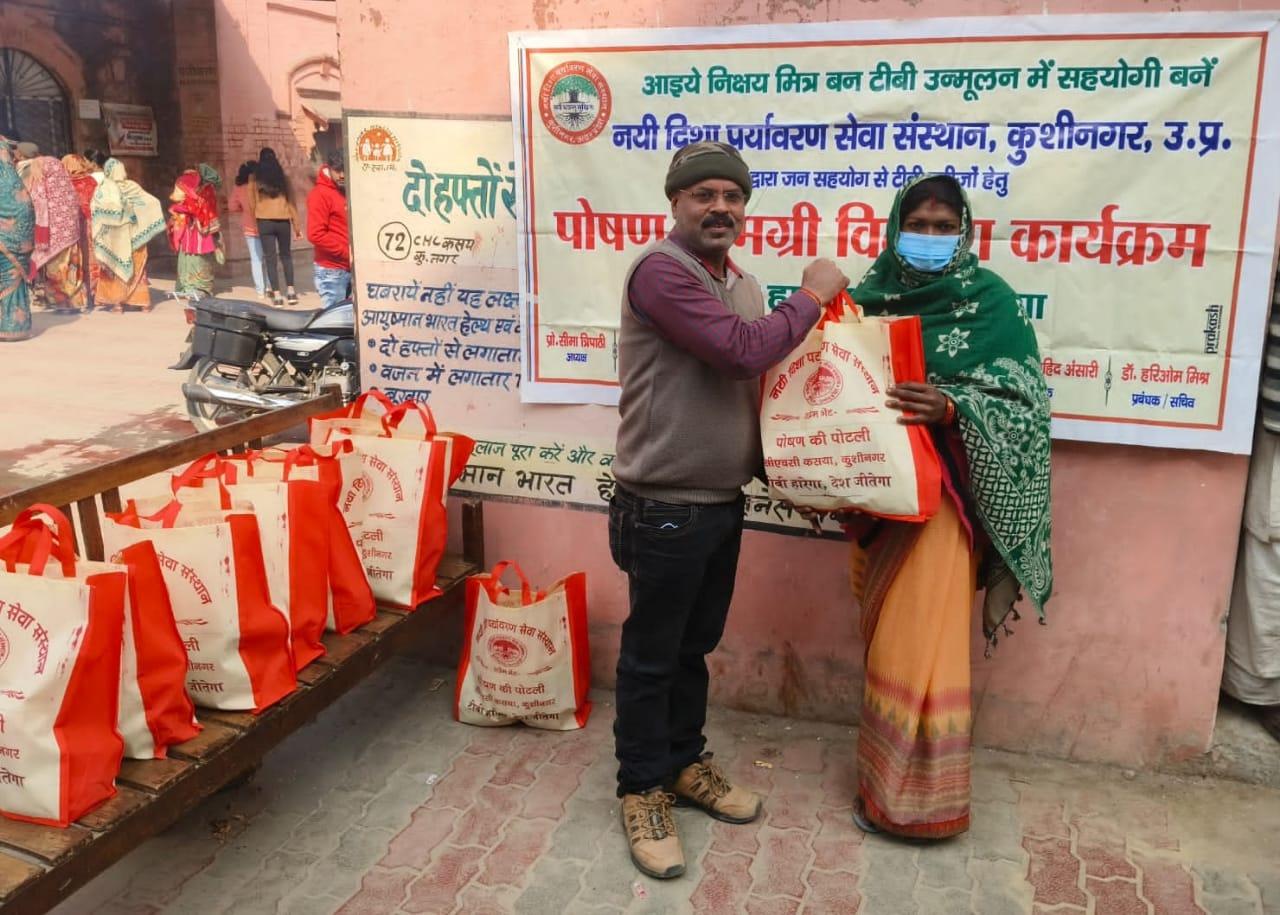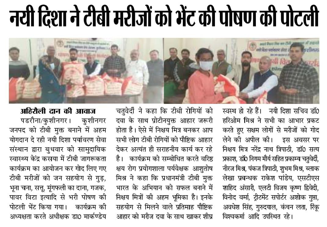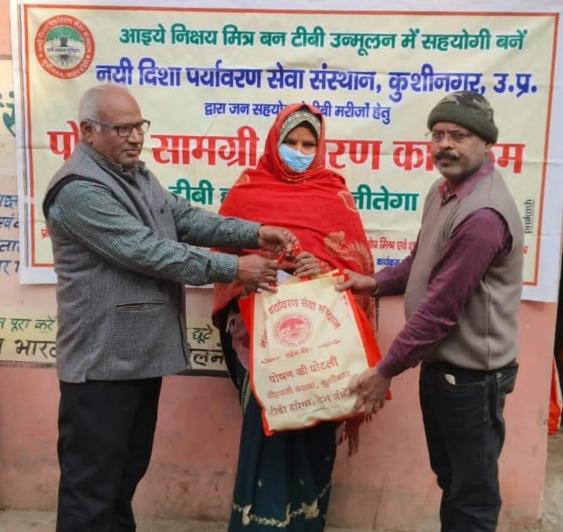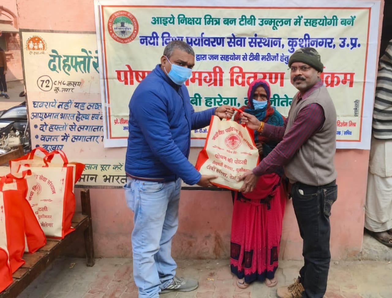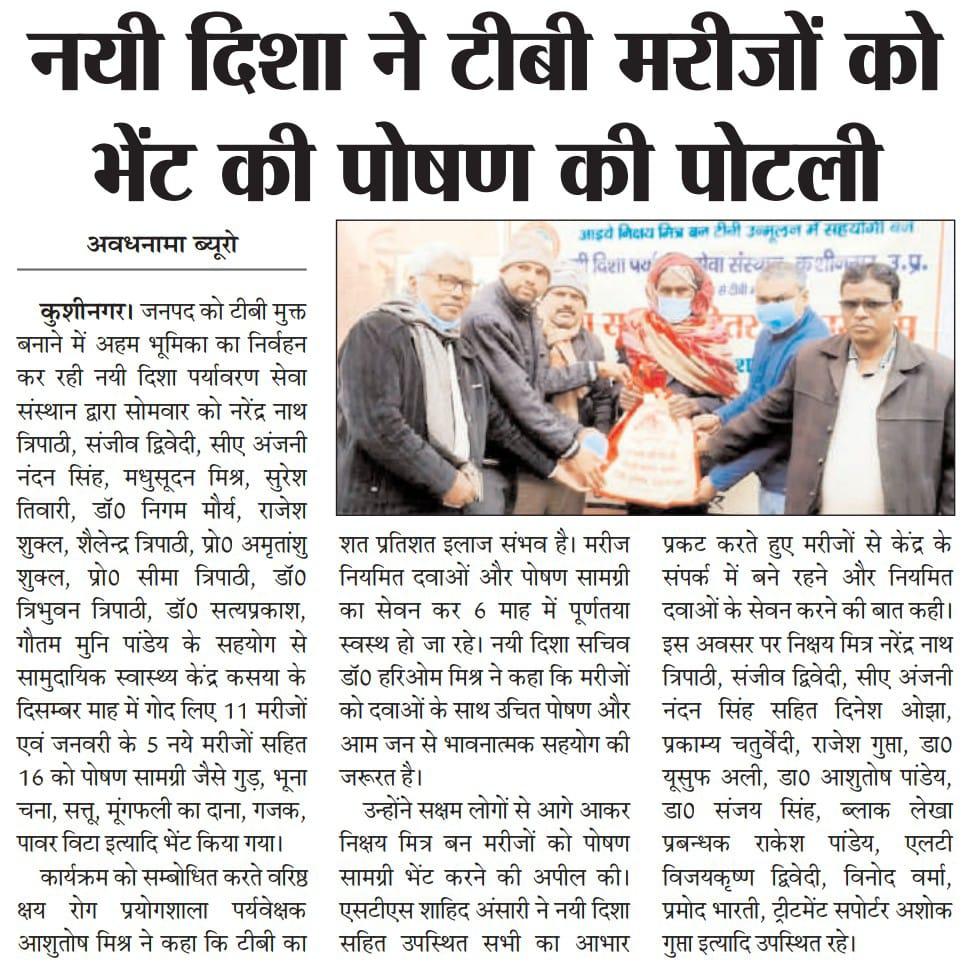 कुशीनगर जनपद को टीबी मुक्त बनाने के प्रयास में संस्थान द्वारा जन सहयोग से सामुदायिक स्वास्थ्य केंद्र कसया के दिसम्बर माह में गोद लिए 11 मरीजों एवं जनवरी के 5 नये मरीजों सहित 16 को पोषण सामग्री जैसे गुड़, भूना चना, सत्तू, मूंगफली का दाना, गजक, पावर विटा इत्यादि भेंट किया गया। निक्षय मित्र बन संस्थान को पोषण सामग्री उपलब्ध कराने वालों में श्री नरेंद्र नाथ त्रिपाठी, श्री संजीव द्विवेदी, सीए श्री अंजनी नंदन सिंह, श्री मधुसूदन मिश्र, श्री सुरेश तिवारी, डॉ0 निगम मौर्य, श्री राजेश शुक्ल, श्री शैलेन्द्र त्रिपाठी, प्रो0 अमृतांशु शुक्ल, प्रो0 सीमा त्रिपाठी, डॉ0 त्रिभुवन त्रिपाठी, डॉ0 सत्यप्रकाश, श्री गौतम मुनि पांडेय इत्यादि शामिल रहे।