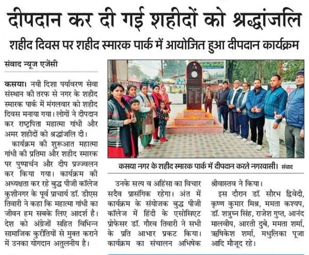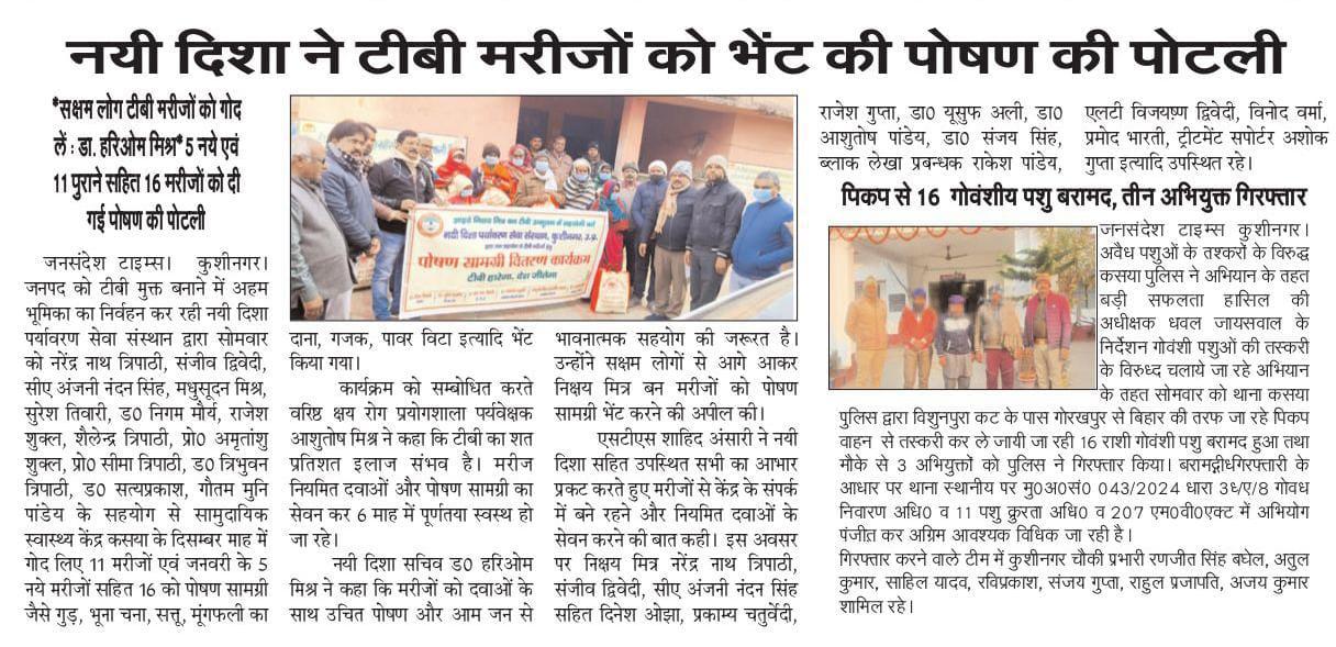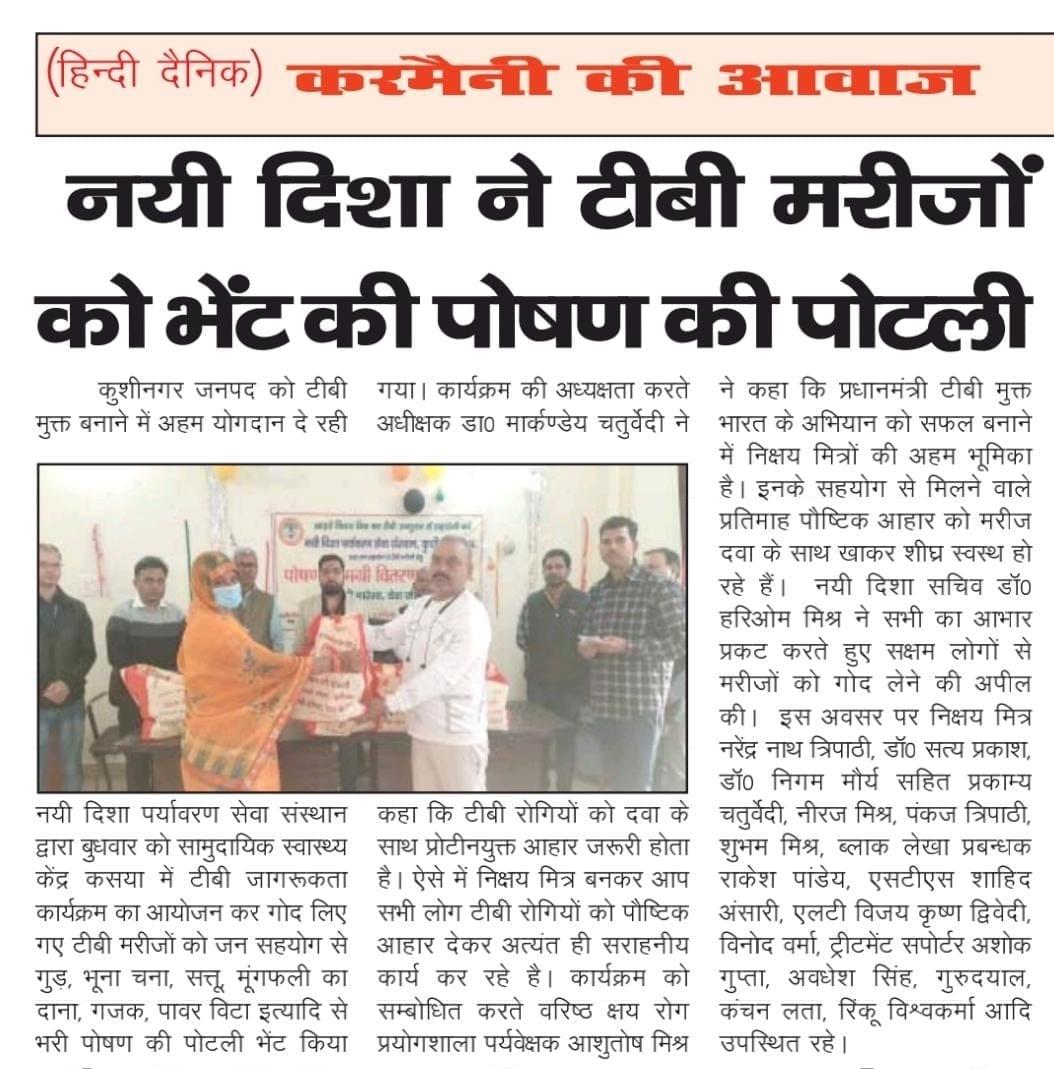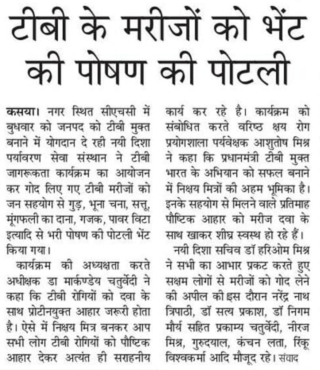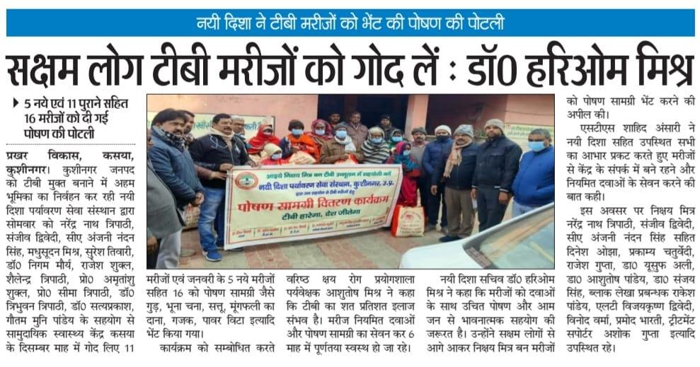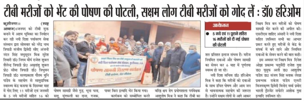 कुशीनगर जनपद को टीबी मुक्त बनाने के प्रयास में संस्थान द्वारा जन सहयोग से सामुदायिक स्वास्थ्य केंद्र कसया के दिसम्बर माह में गोद लिए 11 मरीजों एवं जनवरी के 5 नये मरीजों सहित 16 को पोषण सामग्री जैसे गुड़, भूना चना, सत्तू, मूंगफली का दाना, गजक, पावर विटा इत्यादि भेंट किया गया। निक्षय मित्र बन संस्थान को पोषण सामग्री उपलब्ध कराने वालों में श्री नरेंद्र नाथ त्रिपाठी, श्री संजीव द्विवेदी, सीए श्री अंजनी नंदन सिंह, श्री मधुसूदन मिश्र, श्री सुरेश तिवारी, डॉ0 निगम मौर्य, श्री राजेश शुक्ल, श्री शैलेन्द्र त्रिपाठी, प्रो0 अमृतांशु शुक्ल, प्रो0 सीमा त्रिपाठी, डॉ0 त्रिभुवन त्रिपाठी, डॉ0 सत्यप्रकाश, श्री गौतम मुनि पांडेय इत्यादि शामिल रहे।