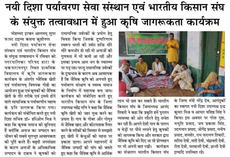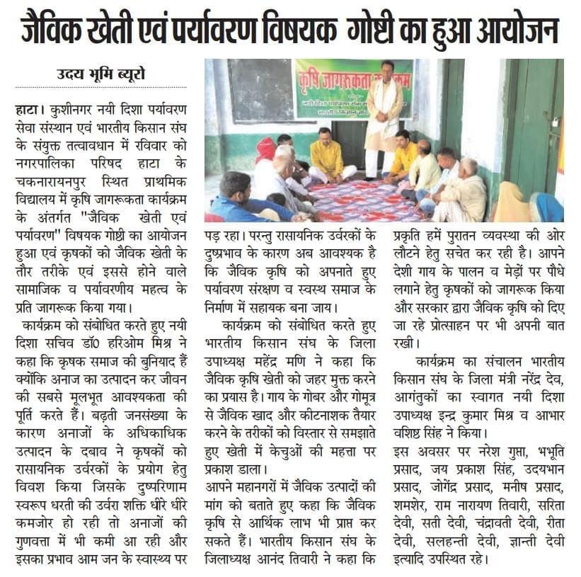कृषि भारतीय समाज की रीढ़ है और आज भी अधिकांश भारतीय सीधे खेती से जुड़े हैं। इसलिए समय समय पर कृषकों के साथ गोष्ठियों के माध्यम से कृषि जागरूकता कार्यक्रम का आयोजन करते हुए उन्हें विशेषकर जैविक खेतु हेतु प्रोत्साहित किया जाता है। इस क्रम में कुशीनगर जनपद के हाटा नगर पालिका परिषद स्थित प्राथमिक विद्यालय चकनारायनपुर में कृषि जागरूकता गोष्ठी सम्पन्न हुई।