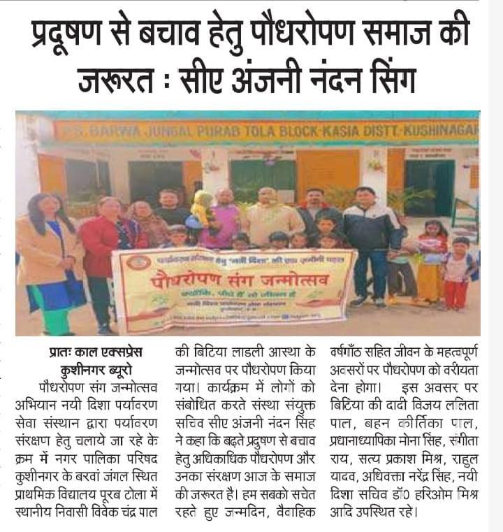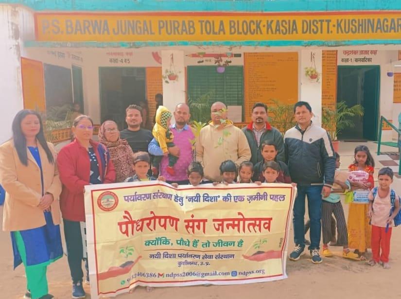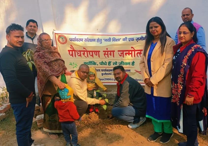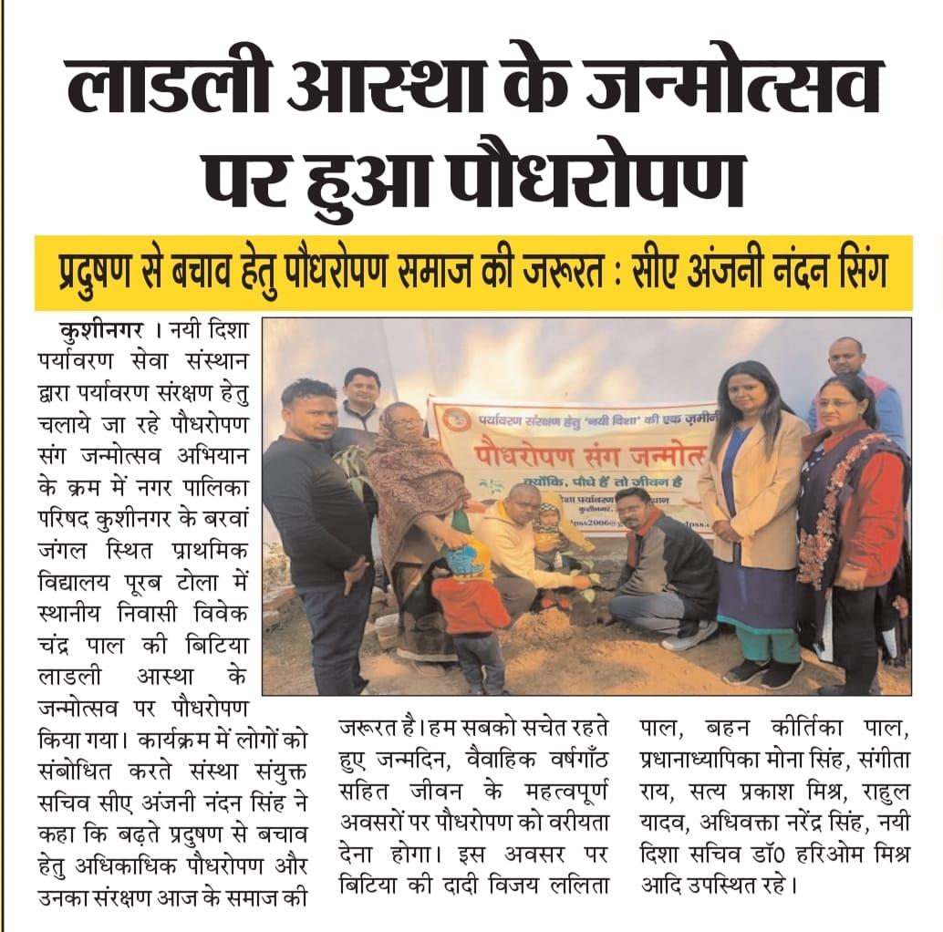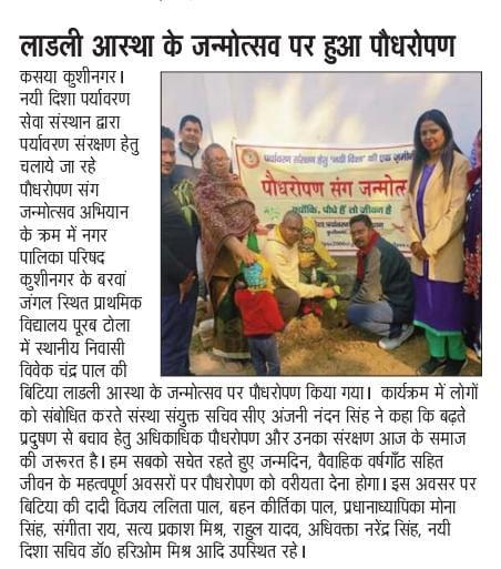 संस्थान द्वारा पर्यावरण संरक्षण हेतु चलाये जा रहे पौधरोपण संग जन्मोत्सव अभियान के क्रम में नगर पालिका परिषद कुशीनगर के बरवां जंगल स्थित प्राथमिक विद्यालय पूरब टोला में स्थानीय निवासी श्री विवेक चंद्र पाल की बिटिया लाडली आस्था के जन्मोत्सव पर पौधरोपण किया गया।