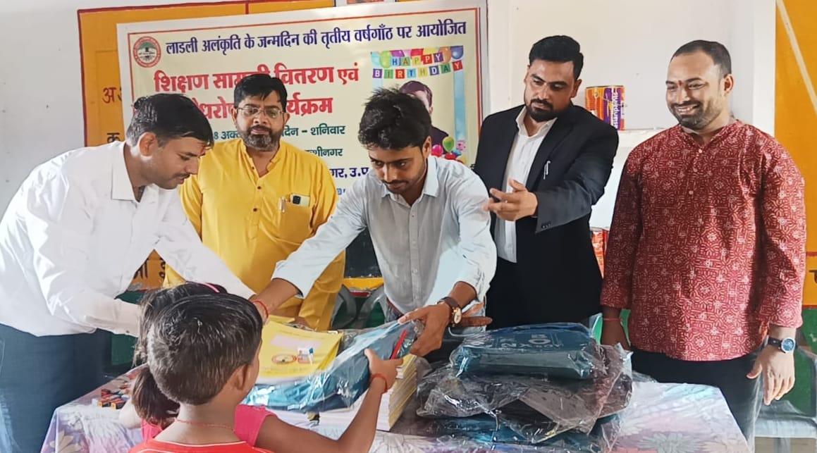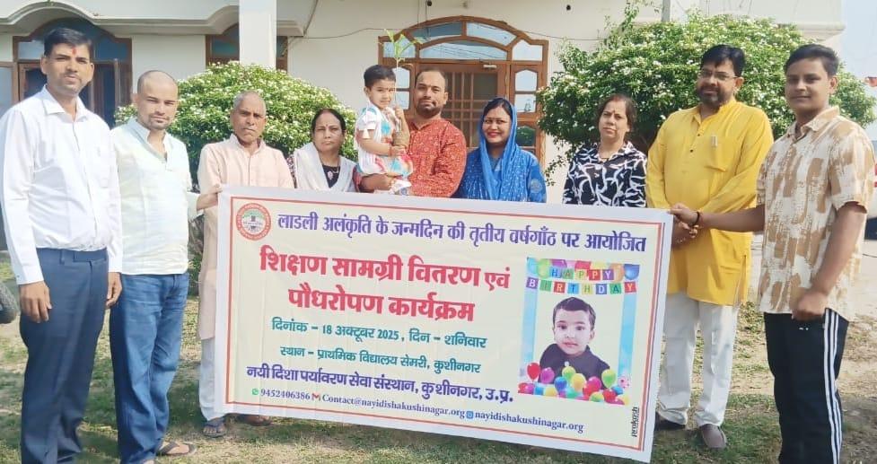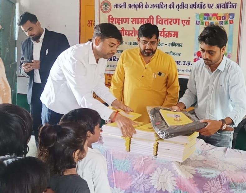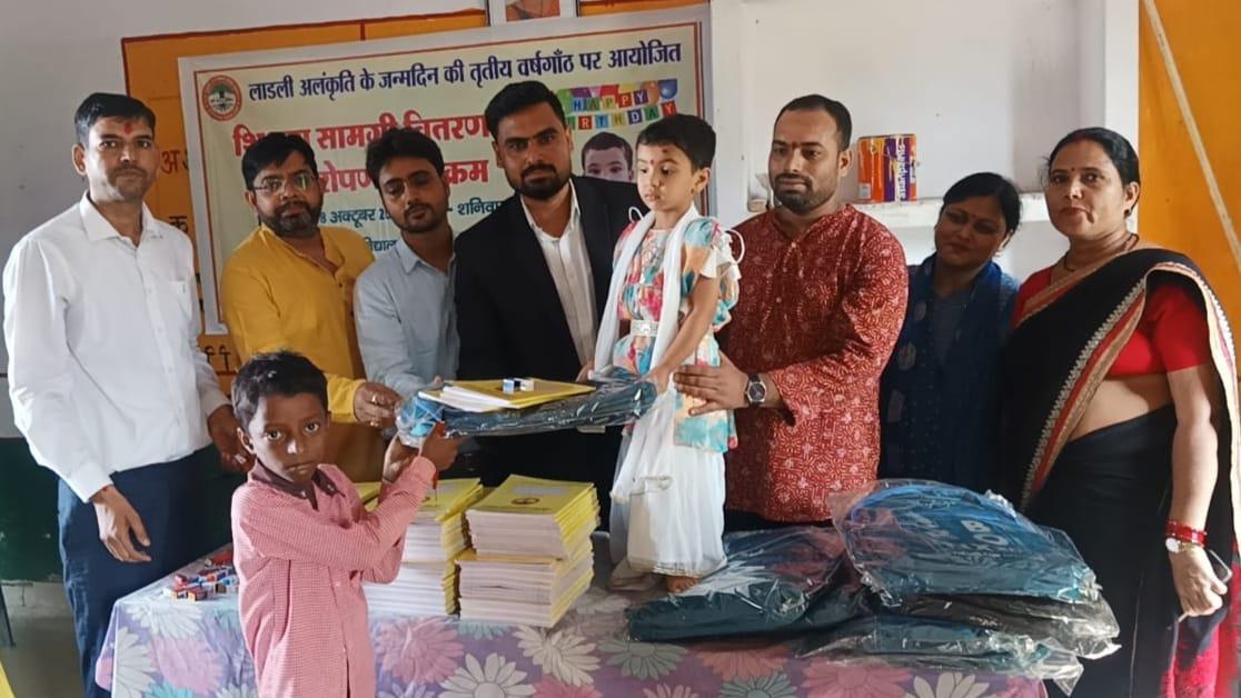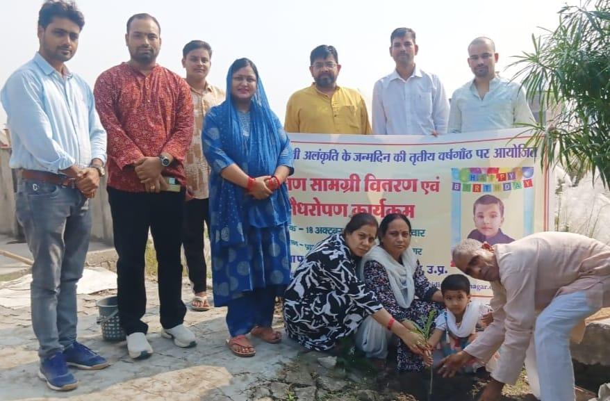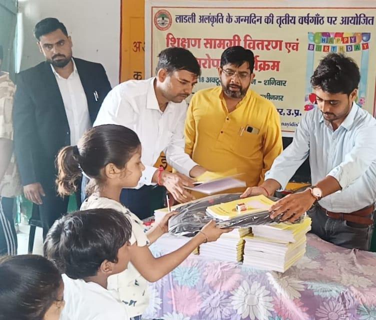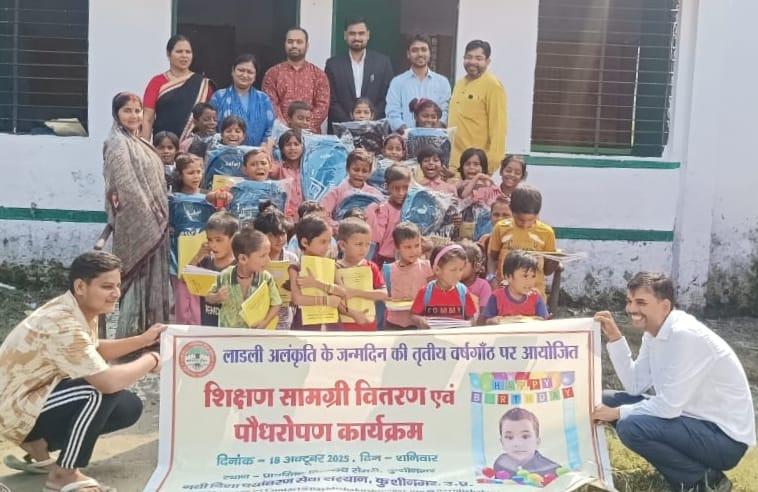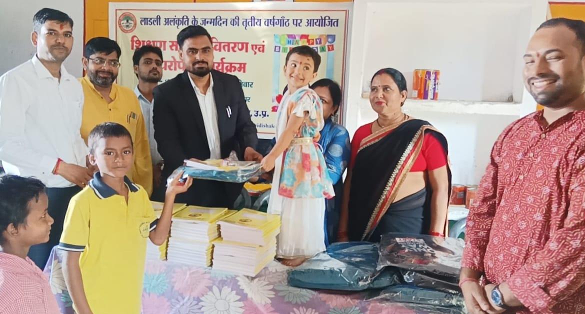 लाडली अलंकृति के जन्मोत्सव पर शिक्षण सामग्री वितरण एवं पौधरोपण का आयोजन।