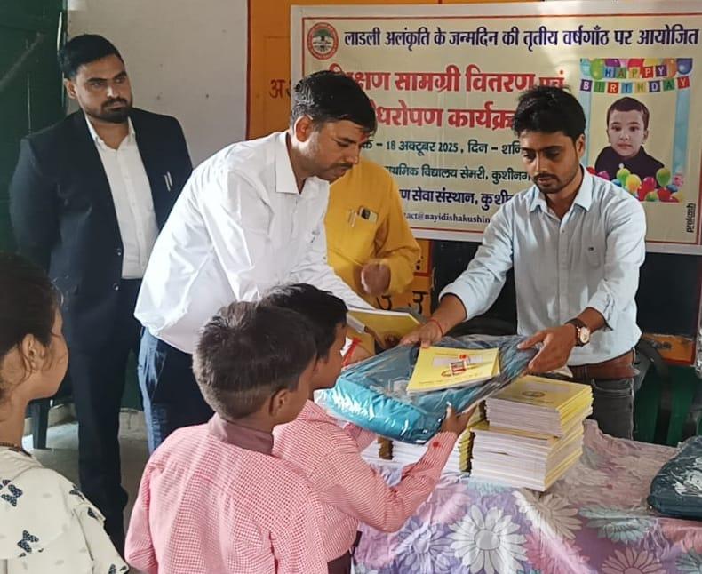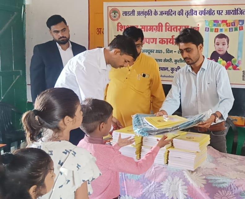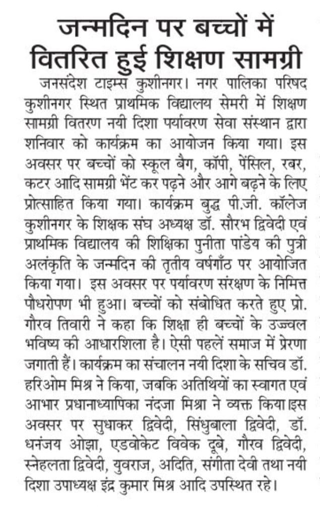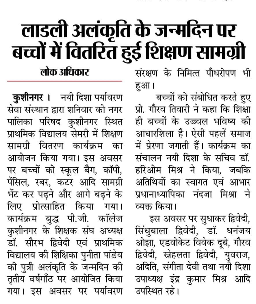 संस्थान द्वारा नगर पालिका परिषद कुशीनगर स्थित प्राथमिक विद्यालय सेमरी में बुद्ध पी.जी. कॉलेज कुशीनगर के शिक्षक संघ अध्यक्ष डॉ. सौरभ द्विवेदी एवं प्राथमिक विद्यालय की शिक्षिका श्रीमती पुनीता पांडेय की पुत्री लाडली अलंकृति के जन्मदिन की तृतीय वर्षगाँठ के अवसर पर आप दोनों के सहयोग से शिक्षण सामग्री वितरण कार्यक्रम का आयोजन कर विद्यार्थियों को स्कूल बैग, कॉपी, पेंसिल, रबर, कटर आदि भेंट कर पढ़ने और आगे बढ़ने के लिए प्रोत्साहित किया गया। पर्यावरण संरक्षण के निमित्त आवासीय परिसर में पौधरोपण भी हुआ।
