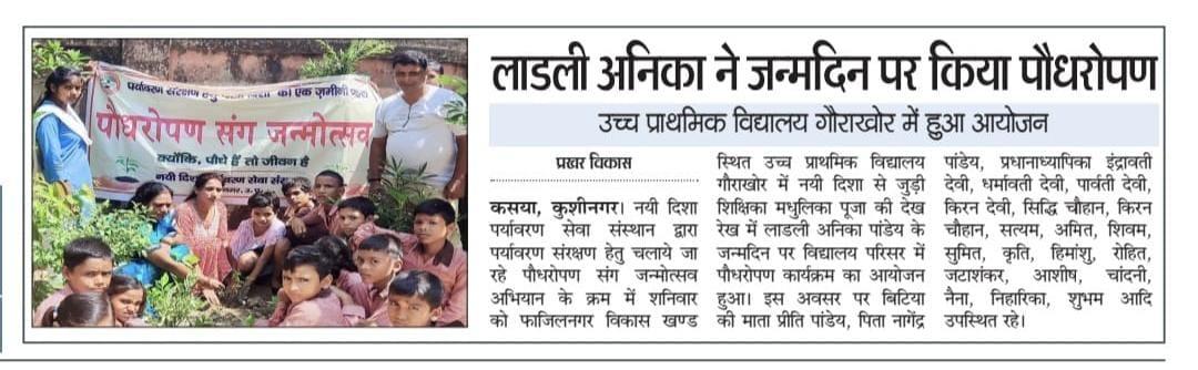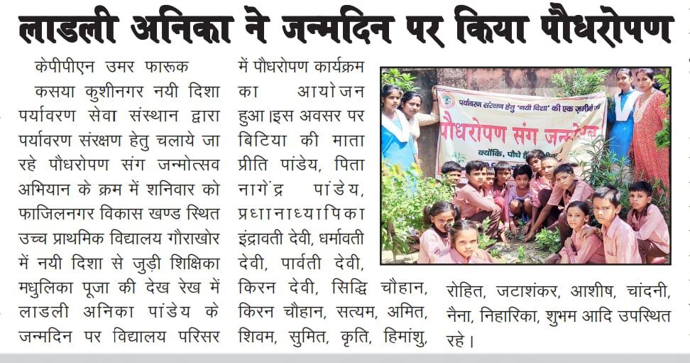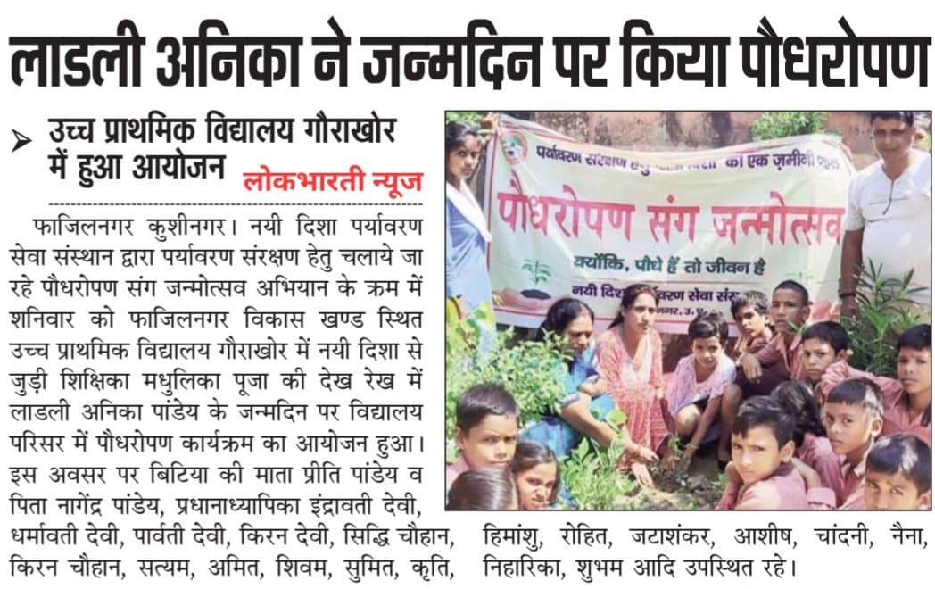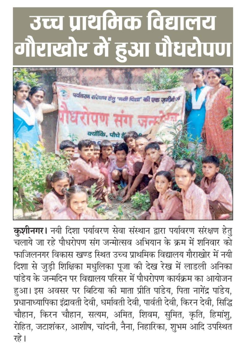 संस्थान द्वारा पर्यावरण संरक्षण हेतु चलाये जा रहे पौधरोपण संग जन्मोत्सव अभियान के क्रम में फाजिलनगर विकास खण्ड स्थित उच्च प्राथमिक विद्यालय गौराखोर में नयी दिशा से जुड़ी शिक्षिका सुश्री मधुलिका पूजा की देख रेख में लाडली अनिका पांडेय के जन्मदिन पर विद्यालय परिसर में पौधरोपण कार्यक्रम का आयोजन हुआ।