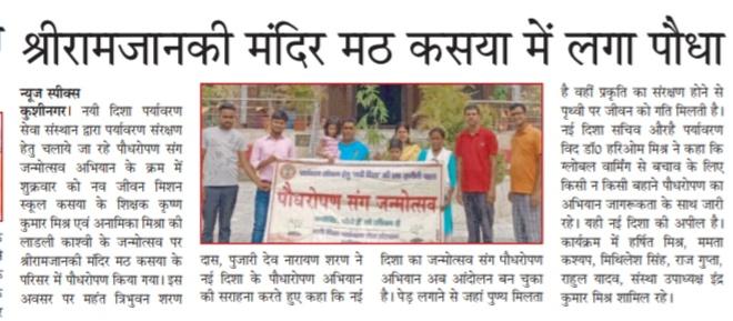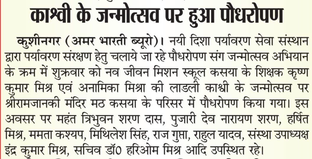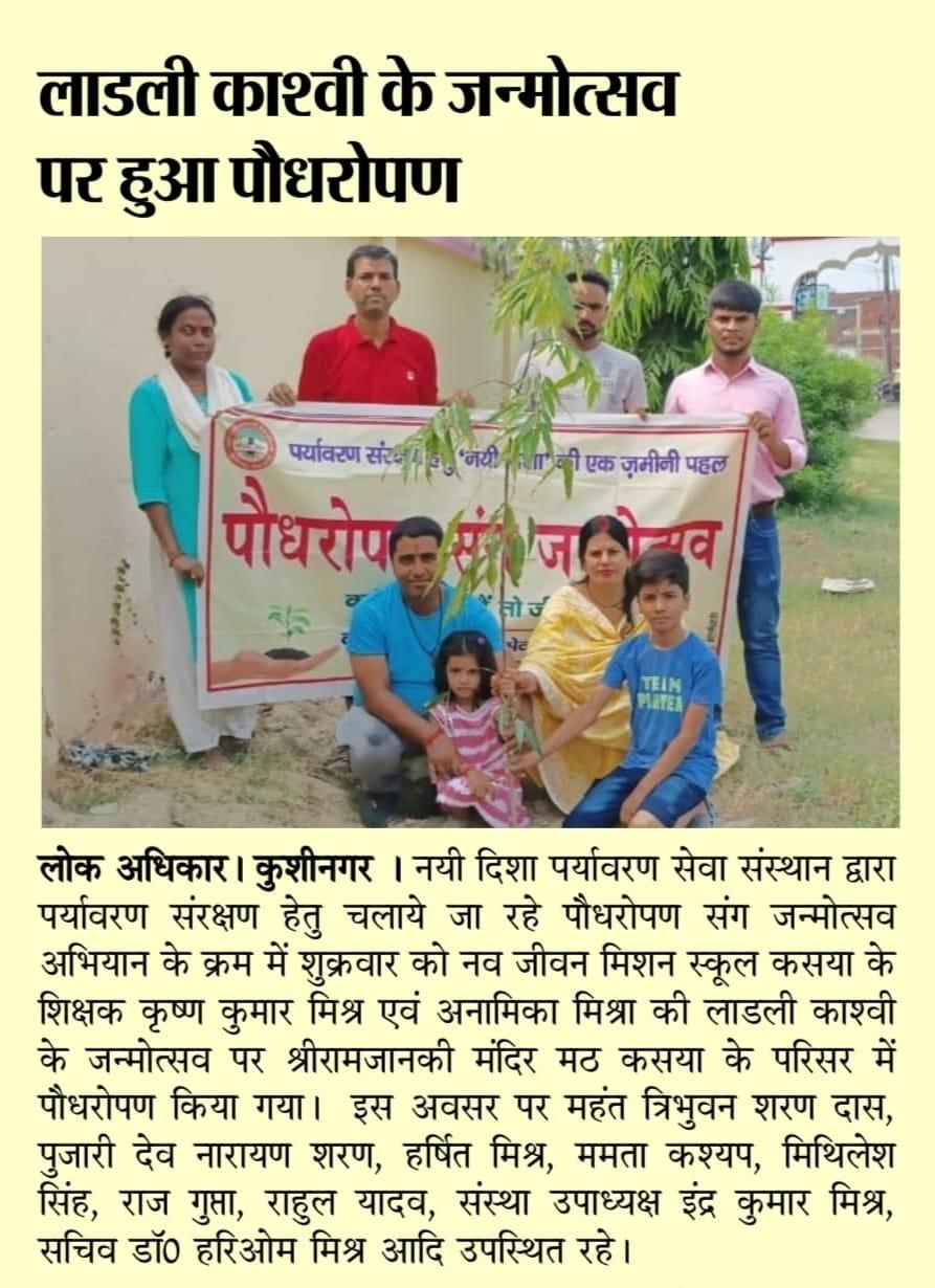 संस्थान द्वारा चलाये जा रहे पौधरोपण संग जन्मोत्सव अभियान के क्रम में श्री कृष्ण कुमार मिश्र एवं श्रीमती अनामिका मिश्रा की लाडली काश्वी के जन्मोत्सव पर श्रीरामजानकी मंदिर मठ कसया के परिसर में पौधरोपण किया गया। इस अवसर पर श्री हर्षित मिश्र, सुश्री ममता कश्यप, श्री मिथिलेश सिंह, श्री राज गुप्ता, श्री राहुल यादव, संस्था उपाध्यक्ष श्री इंद्र कुमार मिश्र, सचिव डॉ0 हरिओम मिश्र आदि उपस्थित रहे।