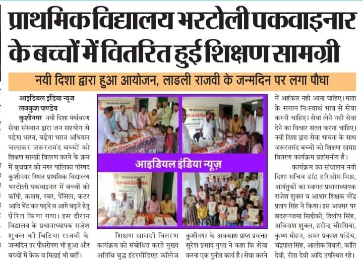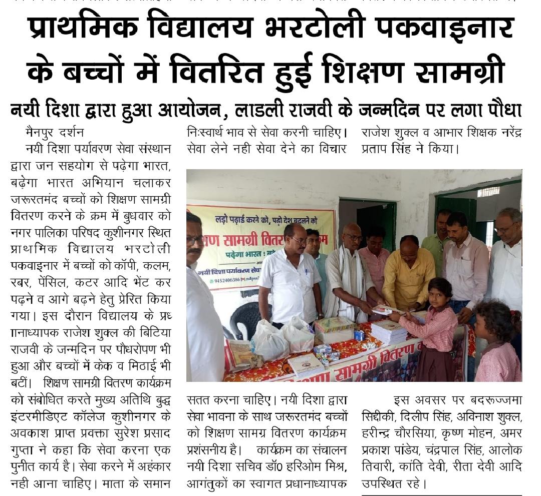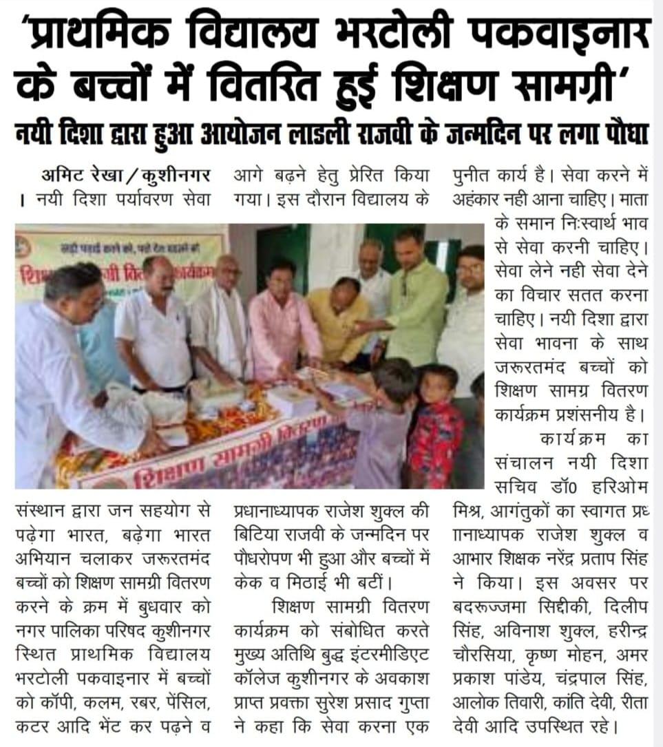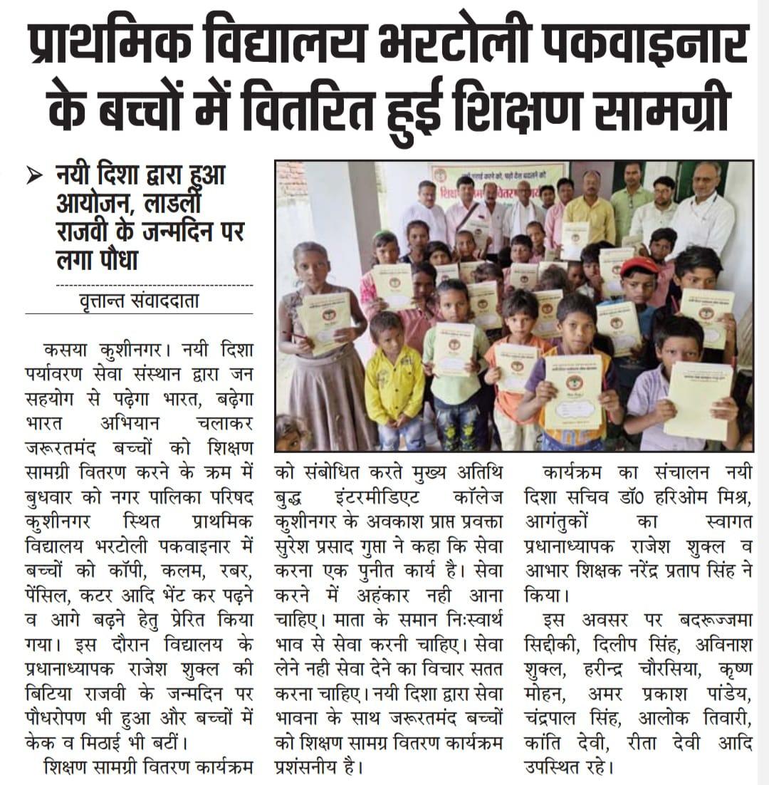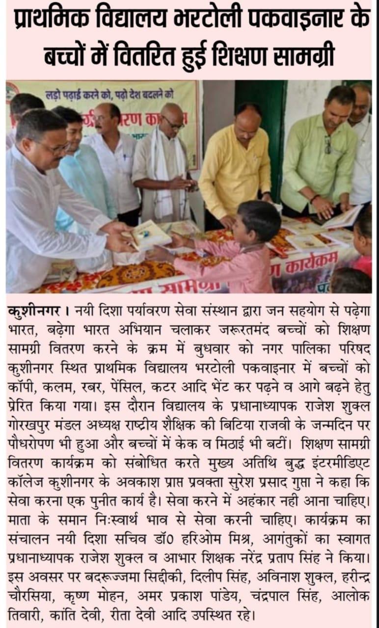 संस्थान द्वारा जन सहयोग से पढ़ेगा भारत, बढ़ेगा भारत अभियान चलाकर जरूरतमंद बच्चों को शिक्षण सामग्री वितरण करने के क्रम में नगर पालिका परिषद कुशीनगर स्थित प्राथमिक विद्यालय भरटोली पकवाइनार में बच्चों को कॉपी, कलम, रबर, पेंसिल, कटर आदि भेंट कर पढ़ने व आगे बढ़ने हेतु प्रेरित किया गया। इस दौरान विद्यालय के प्रधानाध्यापक श्री राजेश शुक्ल जी की लाडली बिटिया राजवी के जन्मदिन पर पौधरोपण भी हुआ और बच्चों में केक व मिठाई भी बटीं।