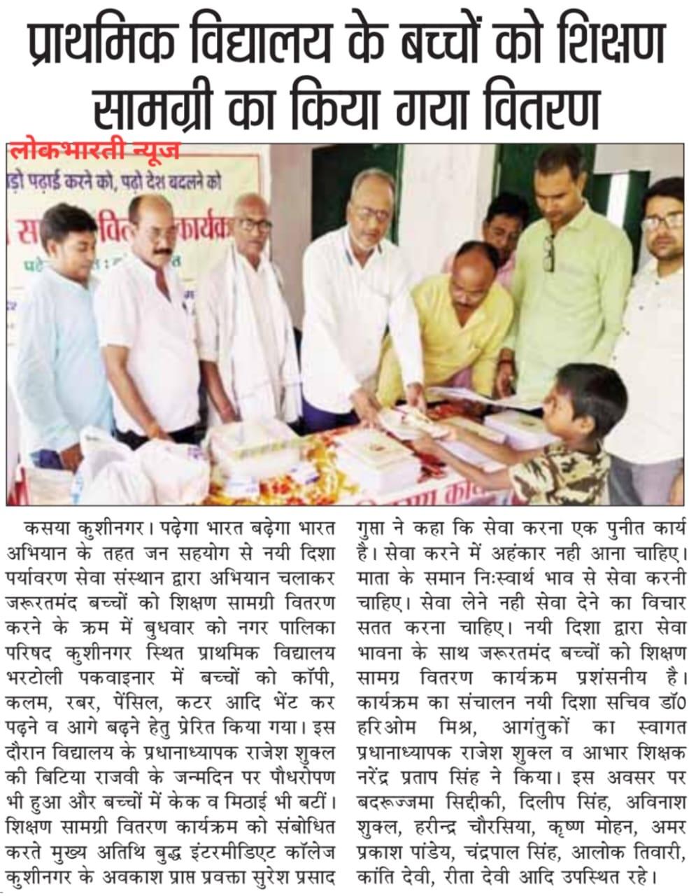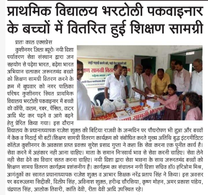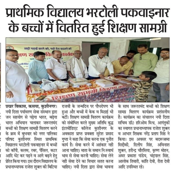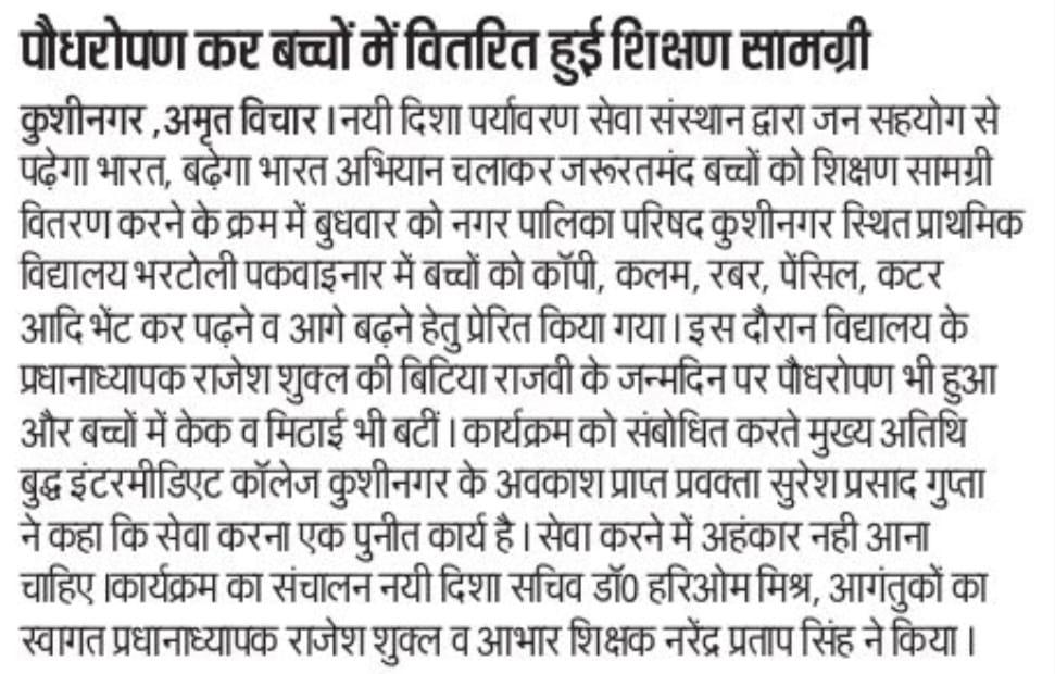 यह शुभ कार्य बुद्ध इंटरमीडिएट कॉलेज कुशीनगर के अवकाश प्राप्त प्रवक्ता गुरुवर श्री सुरेश प्रसाद गुप्ता, श्री राजेश शुक्ल, श्री नरेन्द्र प्रताप सिंह, श्री बदरूज्जमा सिद्दीकी, श्री दिलीप सिंह, श्री अविनाश शुक्ल, श्री हरीन्द्र चौरसिया, श्री कृष्ण मोहन, श्री अमर प्रकाश पांडेय, श्री चंद्रपाल सिंह, श्री आलोक तिवारी, श्रीमती कांति देवी, श्रीमती रीता देवी, नयी दिशा सचिव डॉ0 हरिओम मिश्र आदि की उपस्थिति में सम्पन्न हुआ।