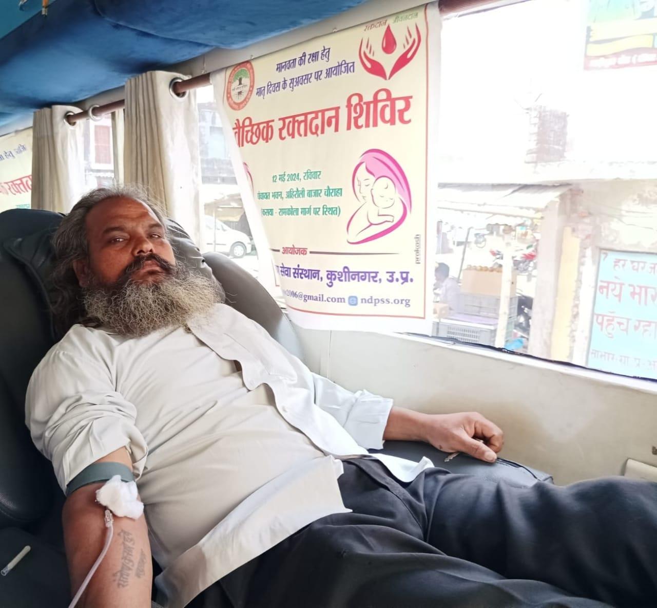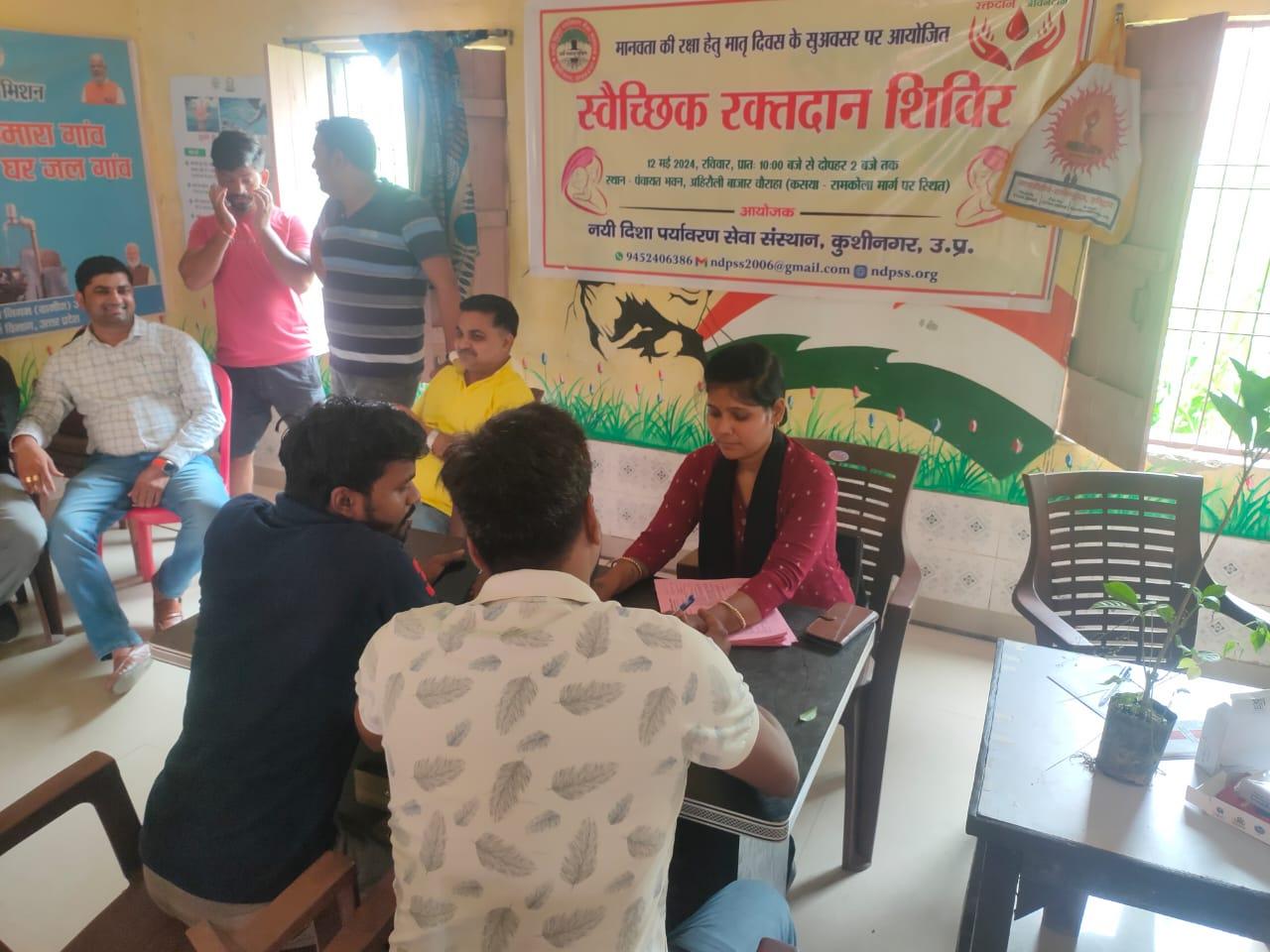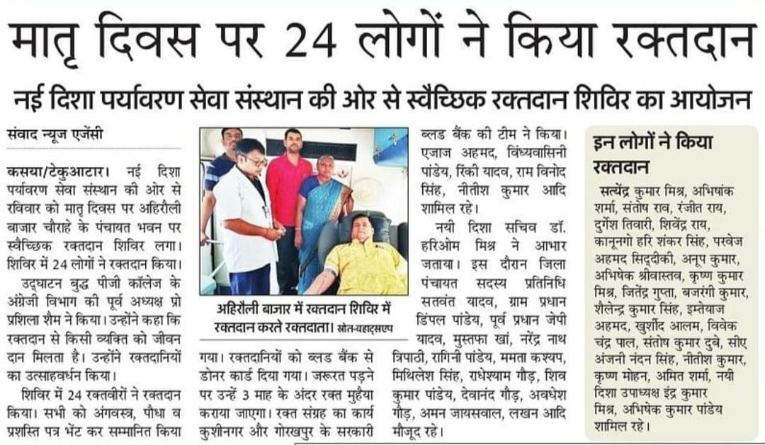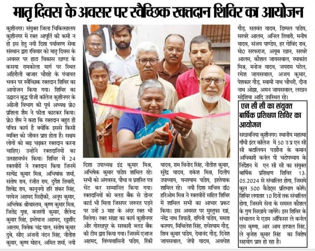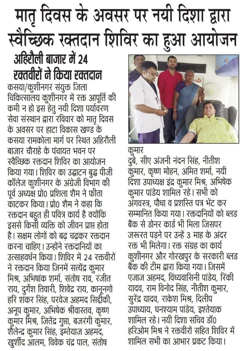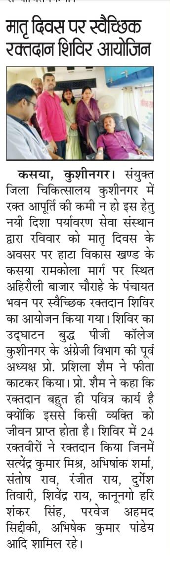 संयुक्त जिला चिकित्सालय कुशीनगर में रक्त आपूर्ति की कमी न हो इस हेतु संस्थान द्वारा मातृ दिवस के अवसर पर हाटा विकास खण्ड के कसया रामकोला मार्ग पर स्थित अहिरौली बाजार चौराहे के पंचायत भवन पर स्वैच्छिक रक्तदान शिविर का आयोजन किया गया। शिविर का उद्घाटन बुद्ध पीजी कॉलेज कुशीनगर के अंग्रेजी विभाग की पूर्व अध्यक्ष प्रो0 प्रशिला शैम मैंम ने फीता काटकर किया।