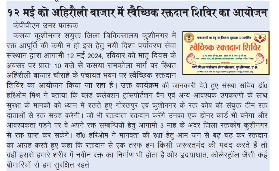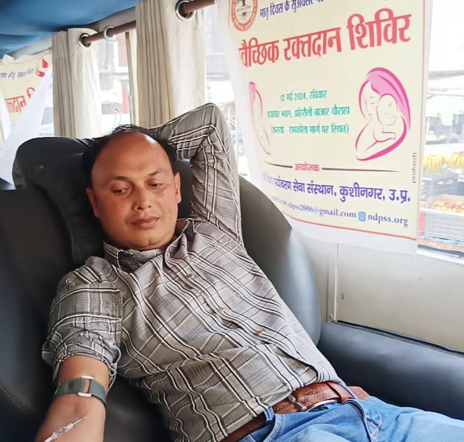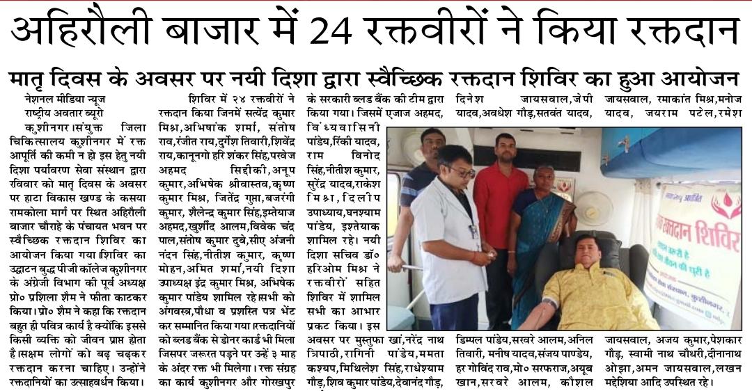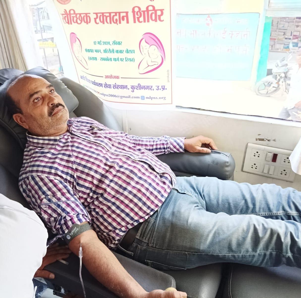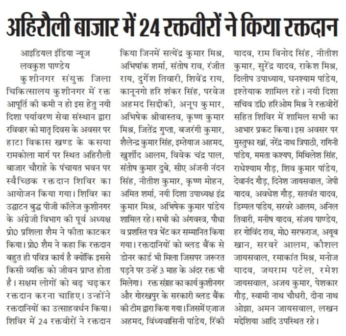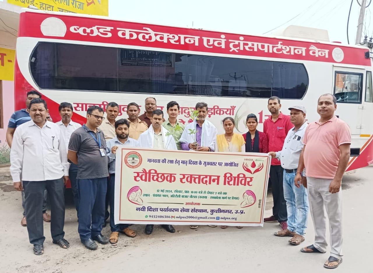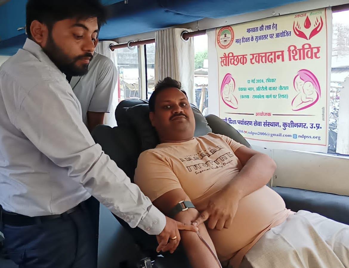 संयुक्त जिला चिकित्सालय कुशीनगर में रक्त आपूर्ति की कमी न हो इस हेतु संस्थान द्वारा मातृ दिवस के अवसर पर हाटा विकास खण्ड के कसया रामकोला मार्ग पर स्थित अहिरौली बाजार चौराहे के पंचायत भवन पर स्वैच्छिक रक्तदान शिविर का आयोजन किया गया। शिविर का उद्घाटन बुद्ध पीजी कॉलेज कुशीनगर के अंग्रेजी विभाग की पूर्व अध्यक्ष प्रो0 प्रशिला शैम मैंम ने फीता काटकर किया।