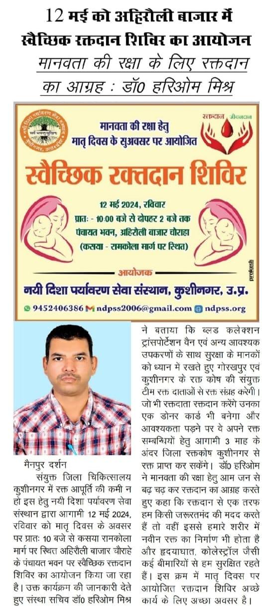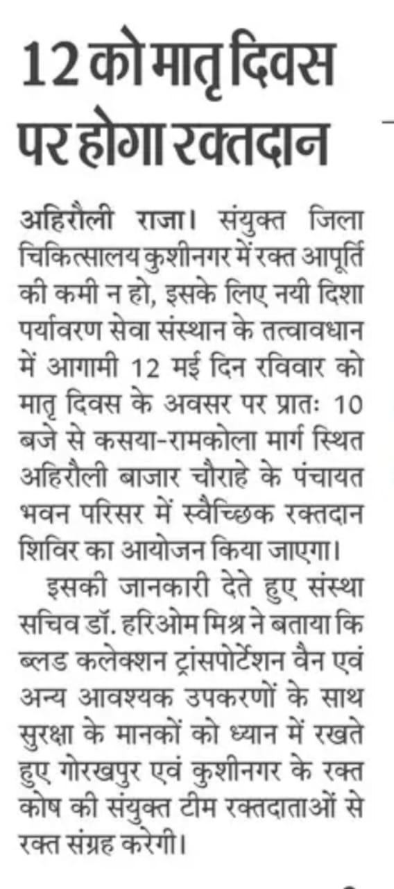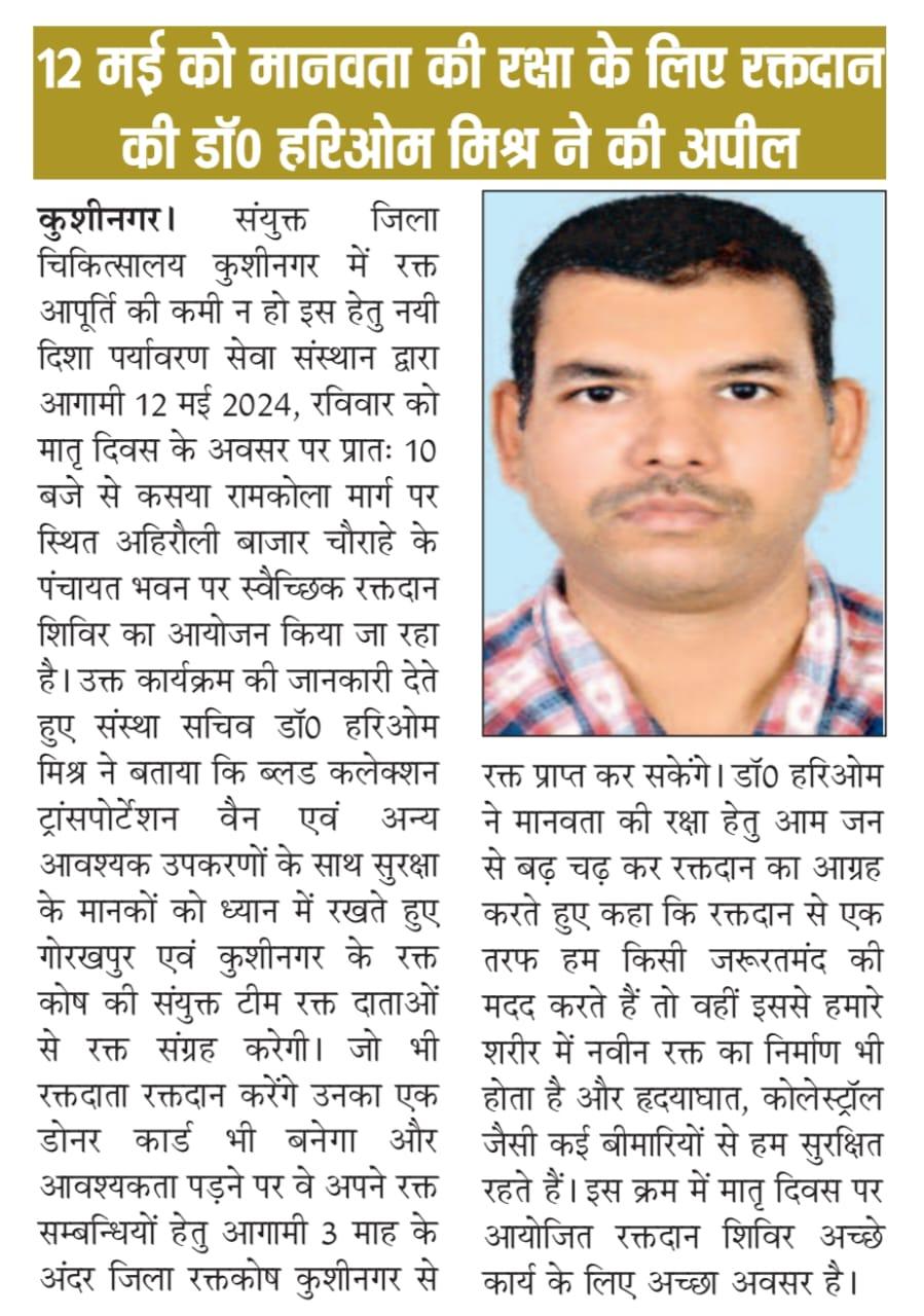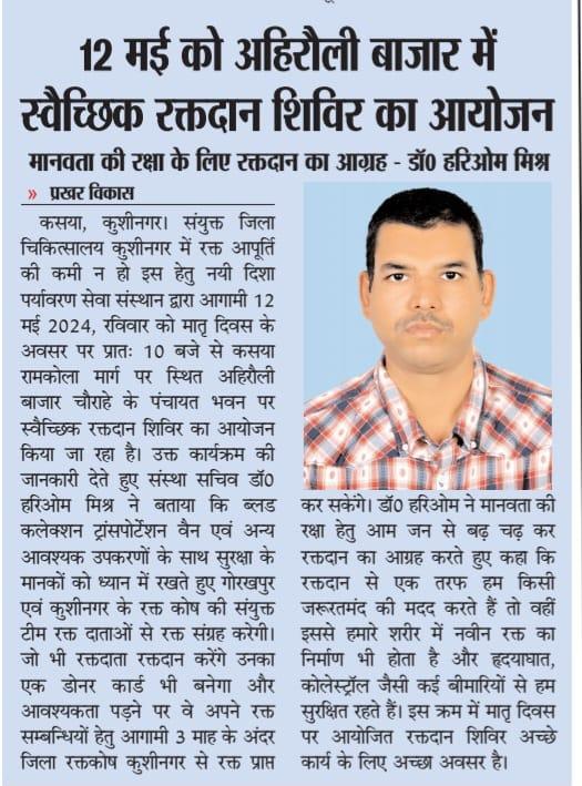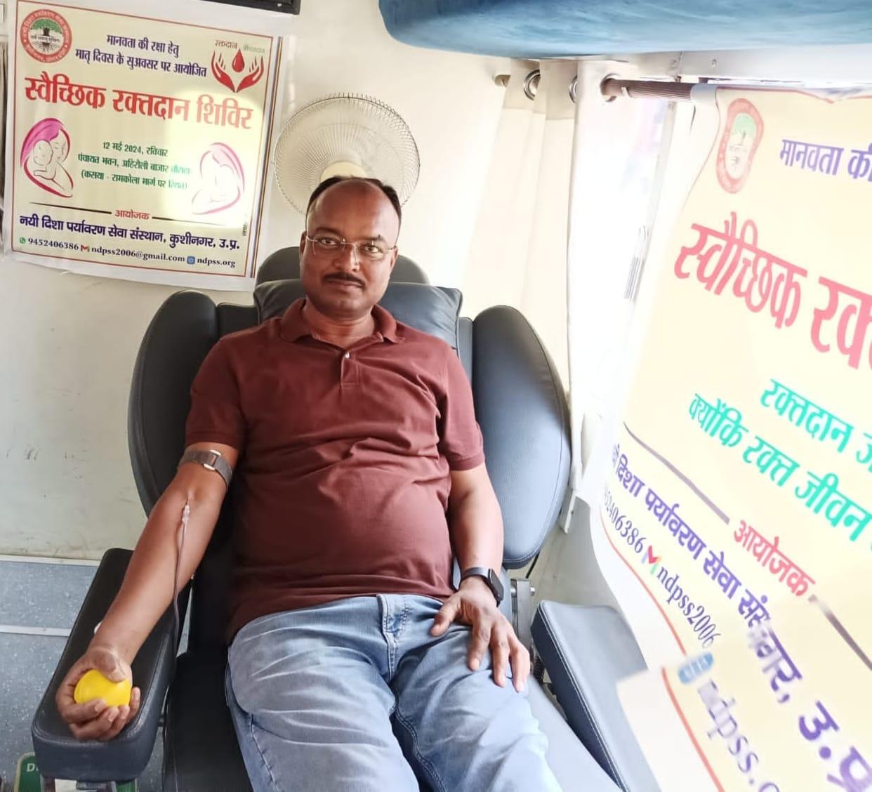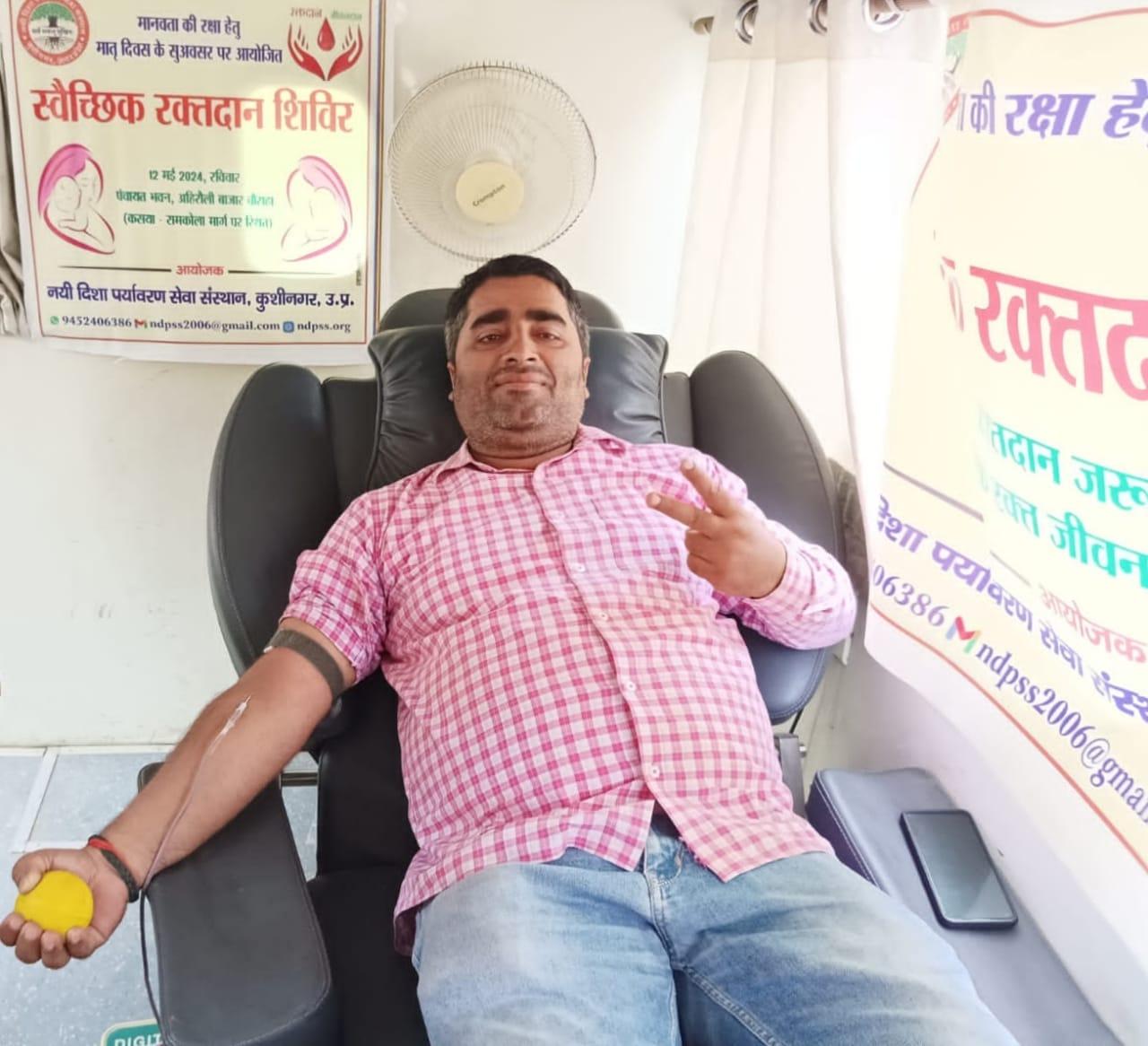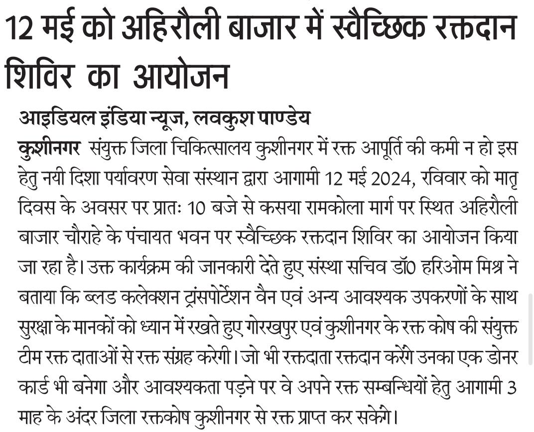 संयुक्त जिला चिकित्सालय कुशीनगर में रक्त आपूर्ति की कमी न हो इस हेतु संस्थान द्वारा मातृ दिवस के अवसर पर हाटा विकास खण्ड के कसया रामकोला मार्ग पर स्थित अहिरौली बाजार चौराहे के पंचायत भवन पर स्वैच्छिक रक्तदान शिविर का आयोजन किया गया। शिविर का उद्घाटन बुद्ध पीजी कॉलेज कुशीनगर के अंग्रेजी विभाग की पूर्व अध्यक्ष प्रो0 प्रशिला शैम मैंम ने फीता काटकर किया।