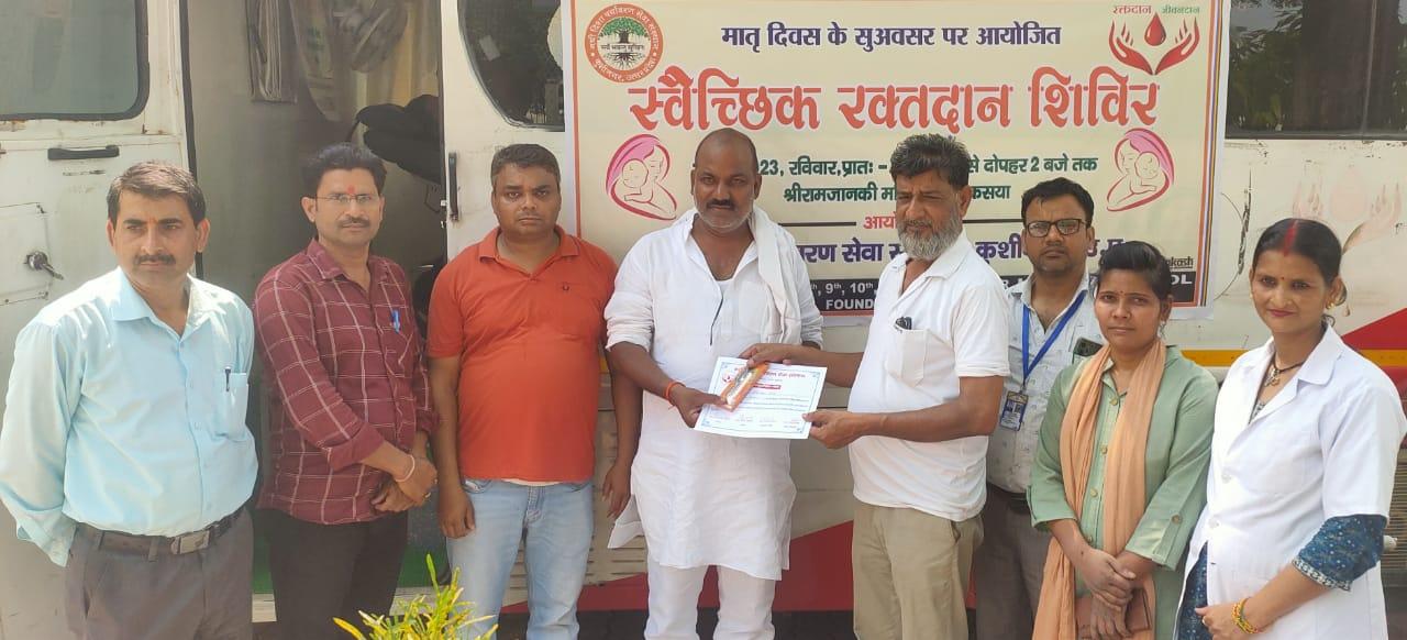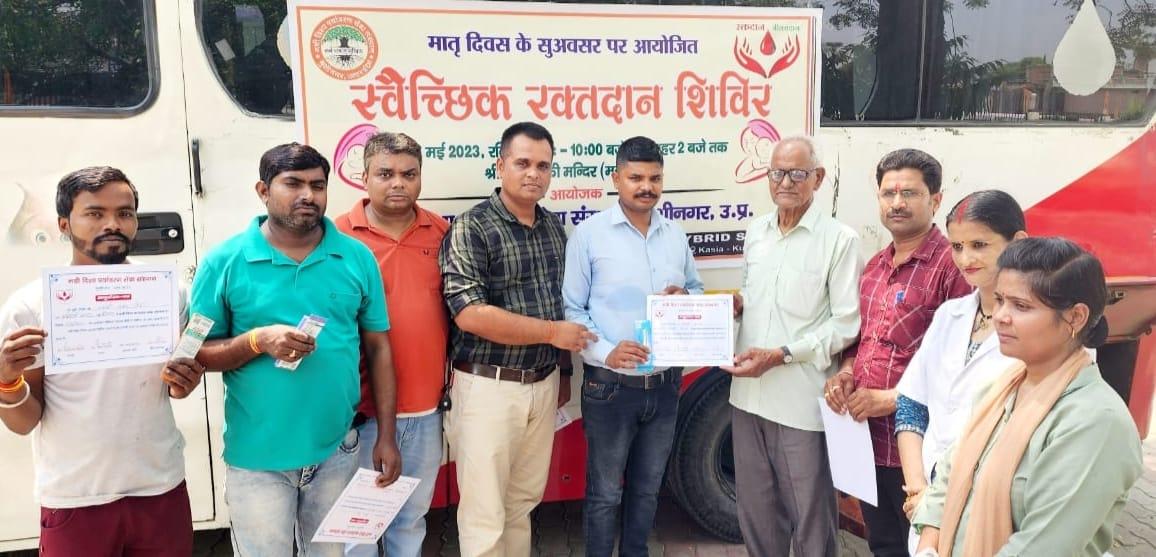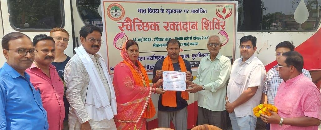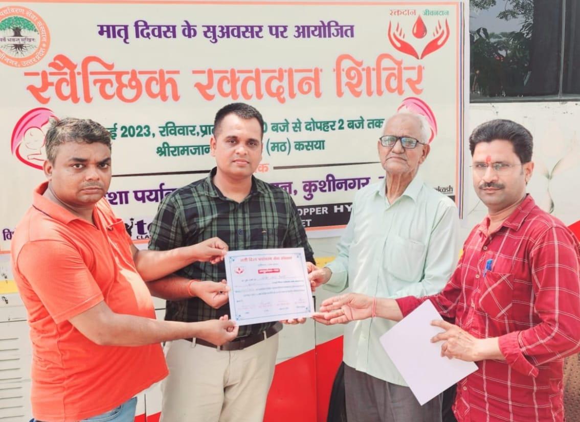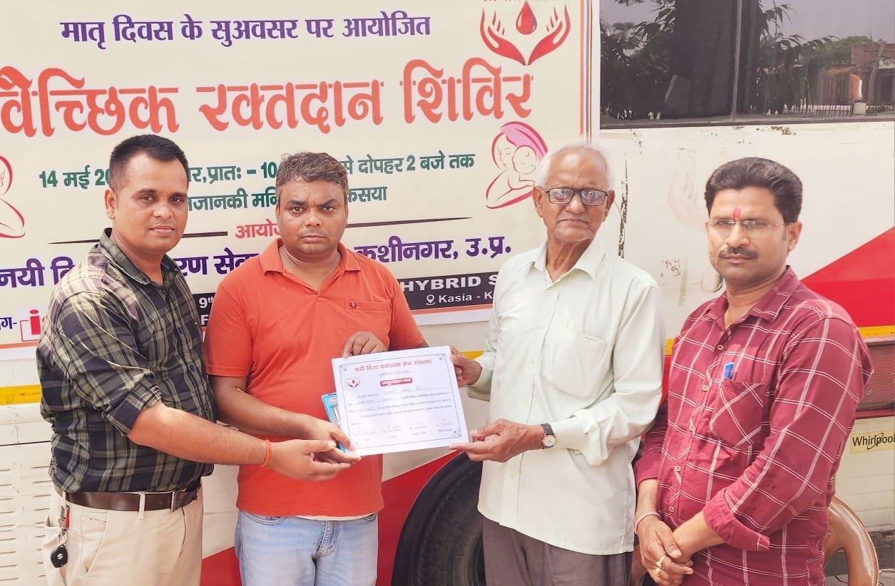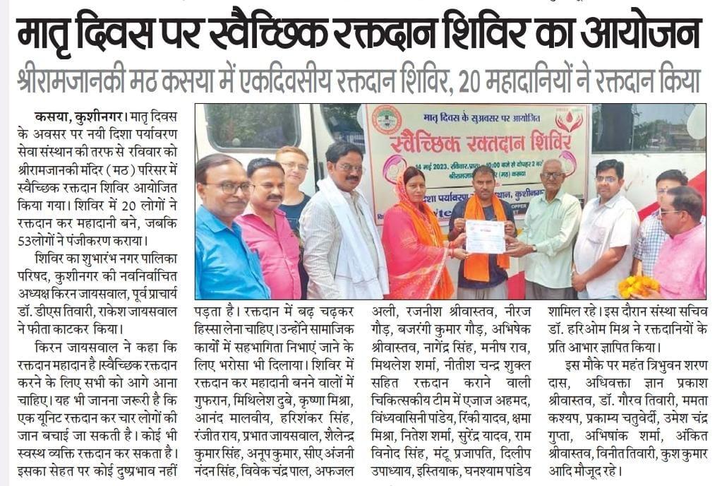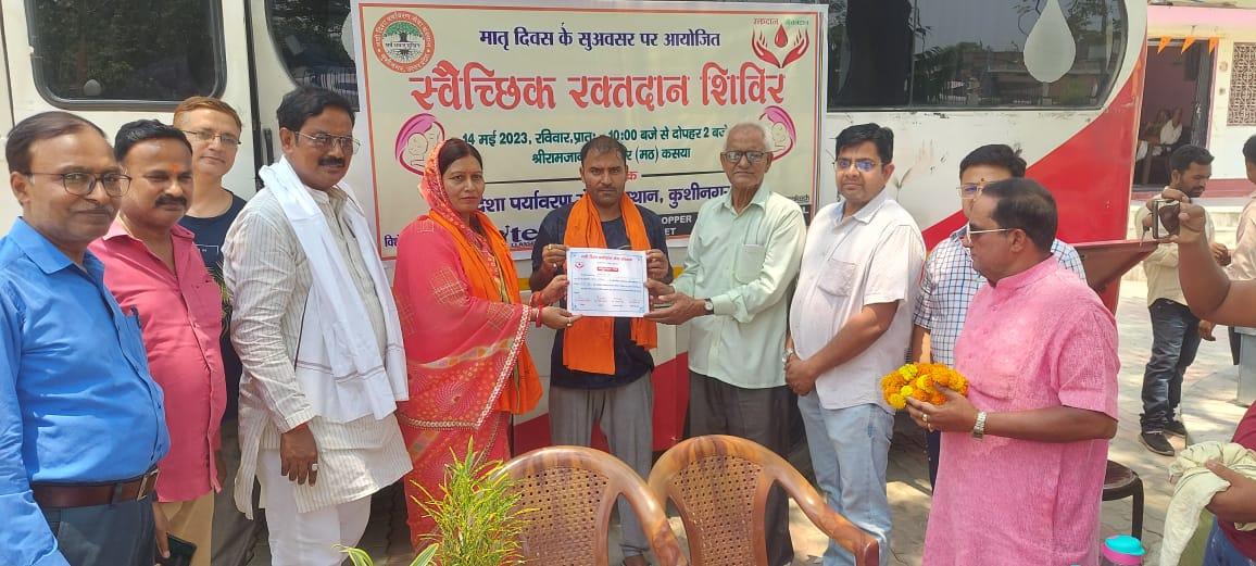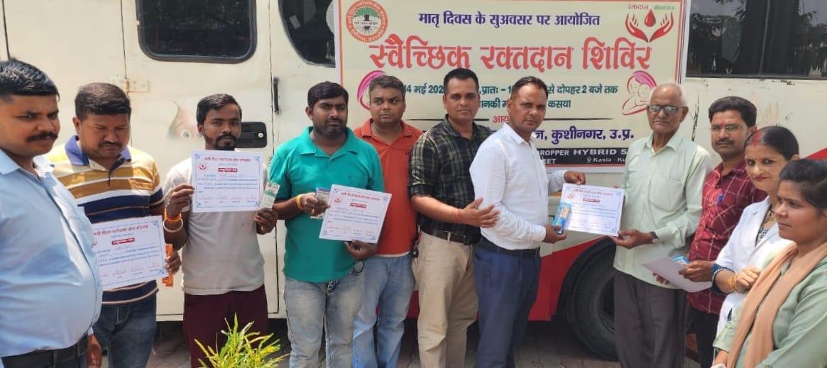 कुशीनगर जनपद के रक्तकोष में रक्त की कमी न हो इस निमित्त संस्थान द्वारा श्रीरामजानकी मंदिर (मठ) कसया के परिसर में मातृ दिवस के सुअवसर पर स्वैच्छिक रक्तदान शिविर का आयोजन किया गया। शिविर का उद्घाटन नगर पालिका परिषद, कुशीनगर की नवनिर्वाचित अध्यक्ष श्रीमती किरण जायसवाल जी ने संस्था संरक्षक डॉ0 डीएस तिवारी जी व समाजसेवी श्री राकेश जायसवाल जी के साथ किया।