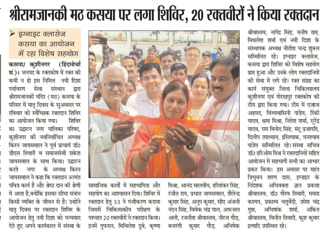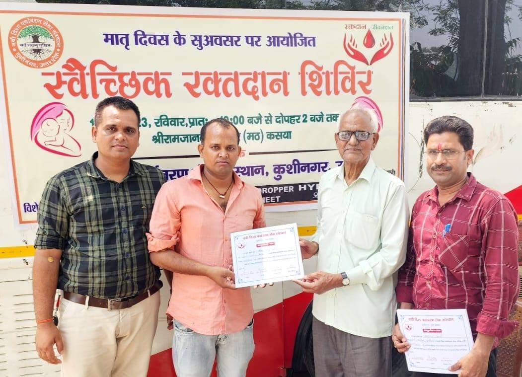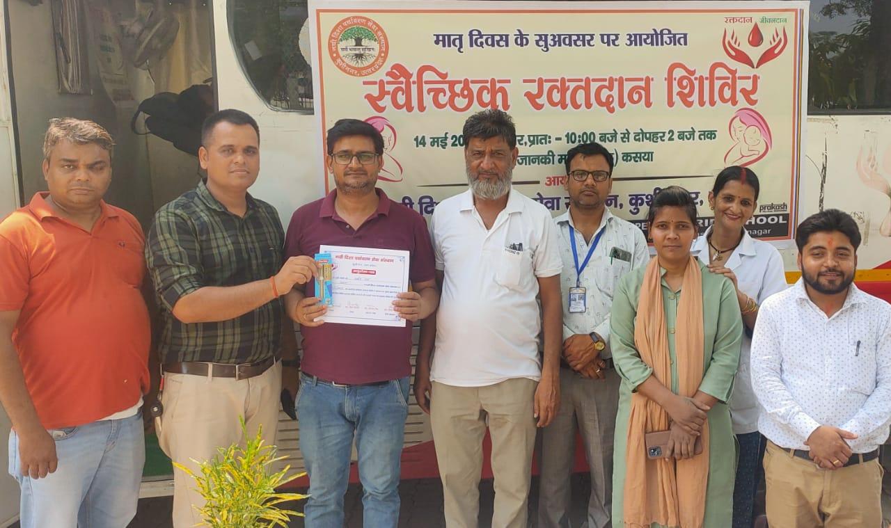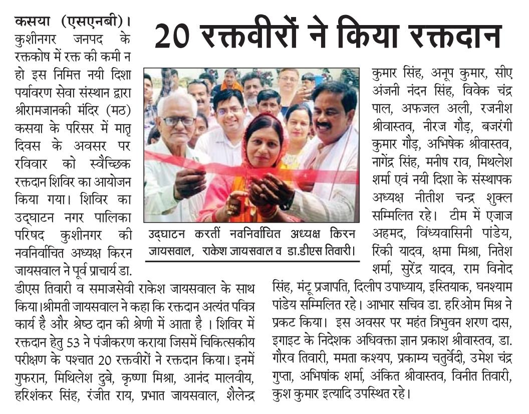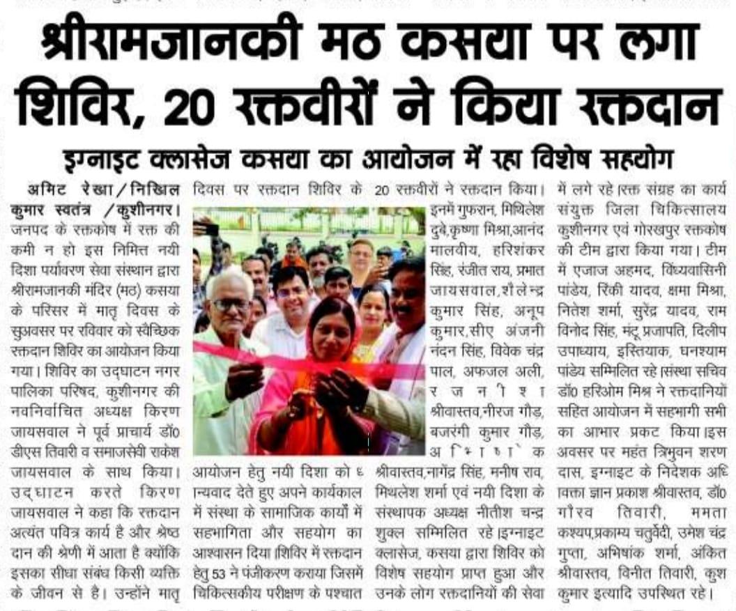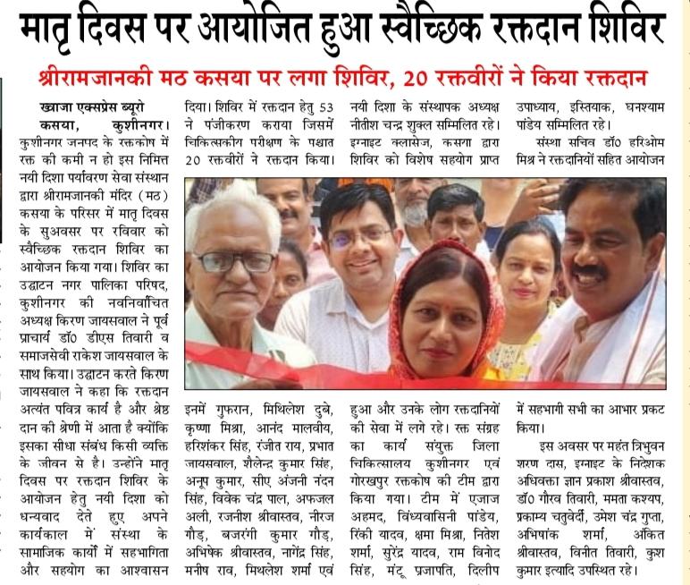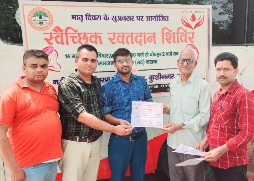 कुशीनगर जनपद के रक्तकोष में रक्त की कमी न हो इस निमित्त संस्थान द्वारा श्रीरामजानकी मंदिर (मठ) कसया के परिसर में मातृ दिवस के सुअवसर पर स्वैच्छिक रक्तदान शिविर का आयोजन किया गया। शिविर का उद्घाटन नगर पालिका परिषद, कुशीनगर की नवनिर्वाचित अध्यक्ष श्रीमती किरण जायसवाल जी ने संस्था संरक्षक डॉ0 डीएस तिवारी जी व समाजसेवी श्री राकेश जायसवाल जी के साथ किया।