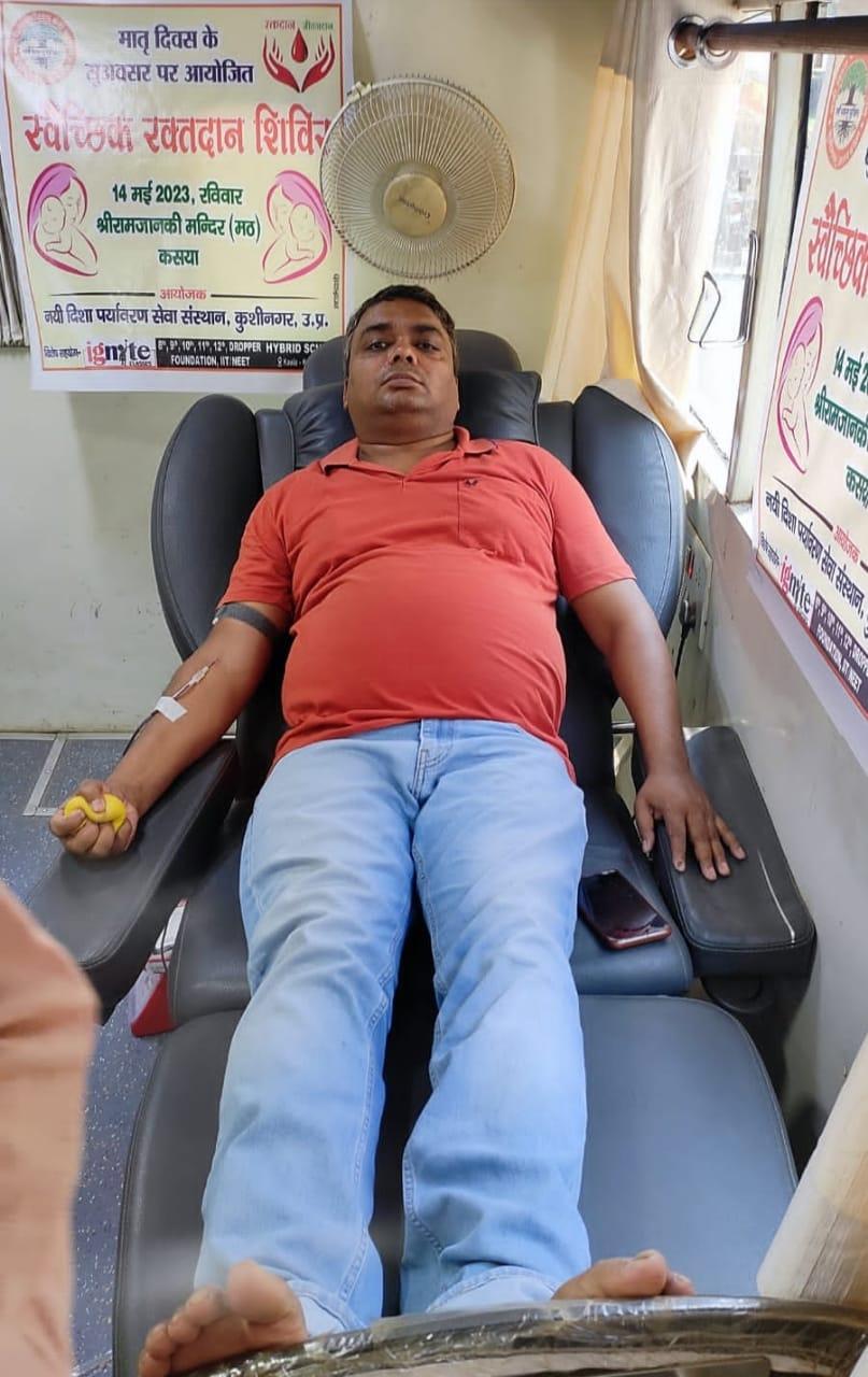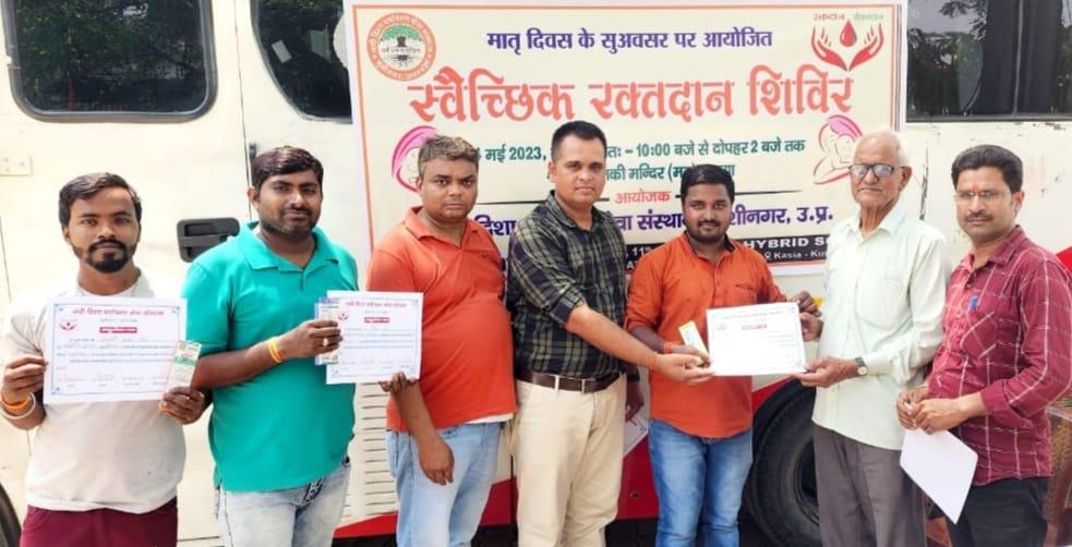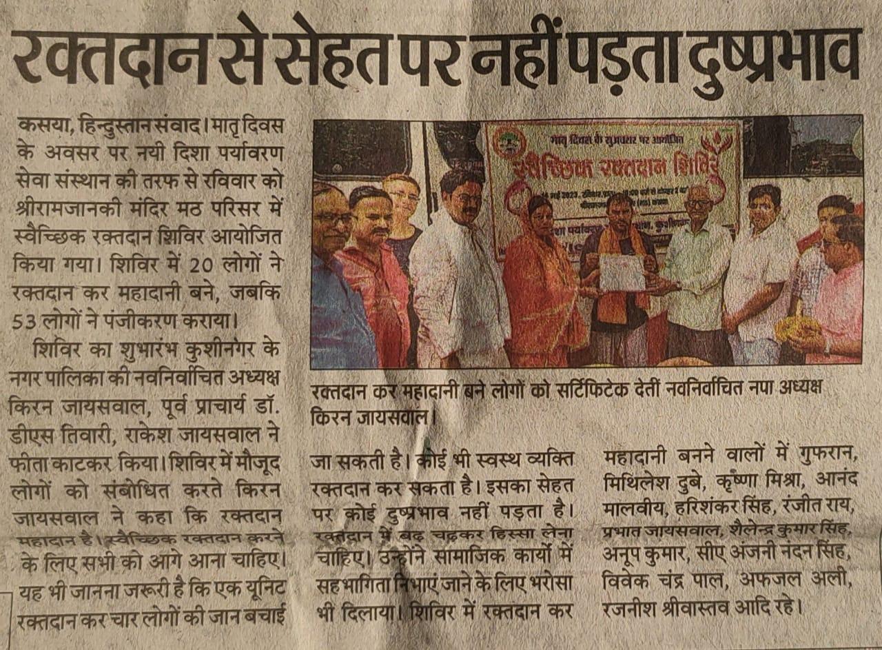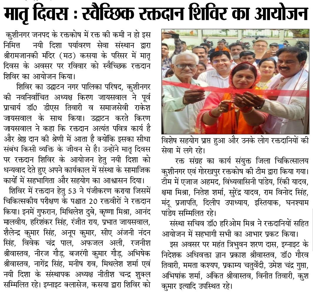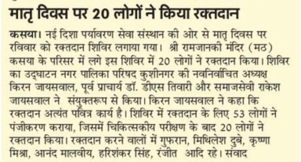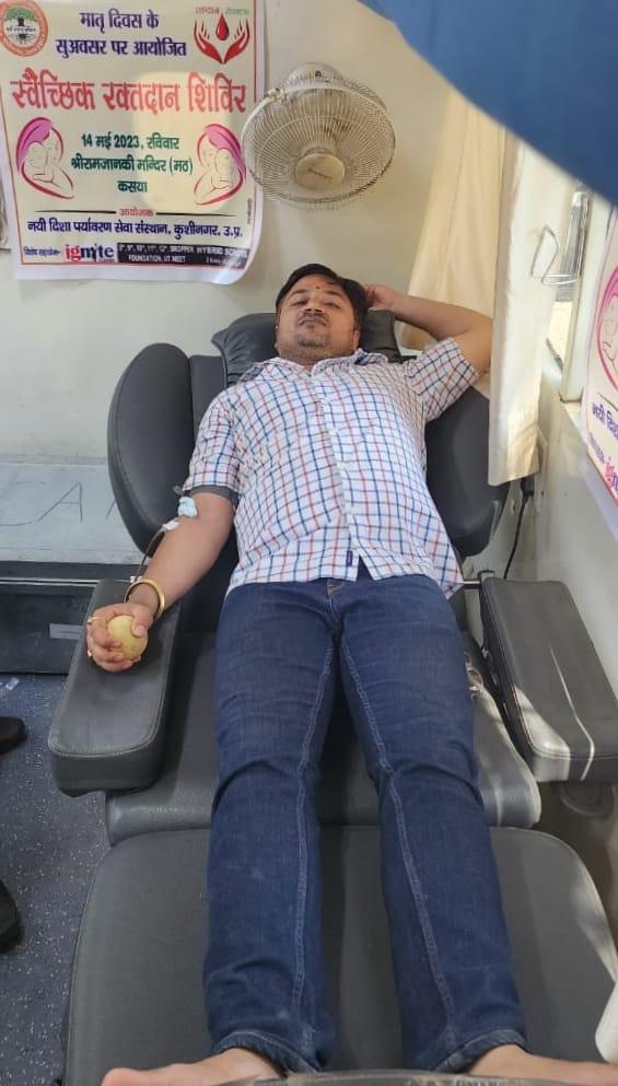 कुशीनगर जनपद के रक्तकोष में रक्त की कमी न हो इस निमित्त संस्थान द्वारा श्रीरामजानकी मंदिर (मठ) कसया के परिसर में मातृ दिवस के सुअवसर पर स्वैच्छिक रक्तदान शिविर का आयोजन किया गया। शिविर का उद्घाटन नगर पालिका परिषद, कुशीनगर की नवनिर्वाचित अध्यक्ष श्रीमती किरण जायसवाल जी ने संस्था संरक्षक डॉ0 डीएस तिवारी जी व समाजसेवी श्री राकेश जायसवाल जी के साथ किया।