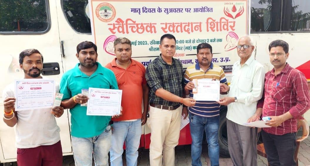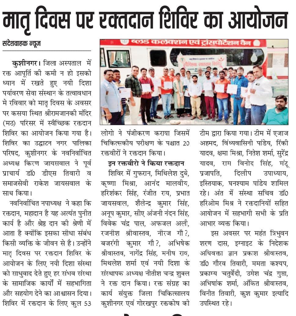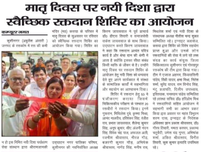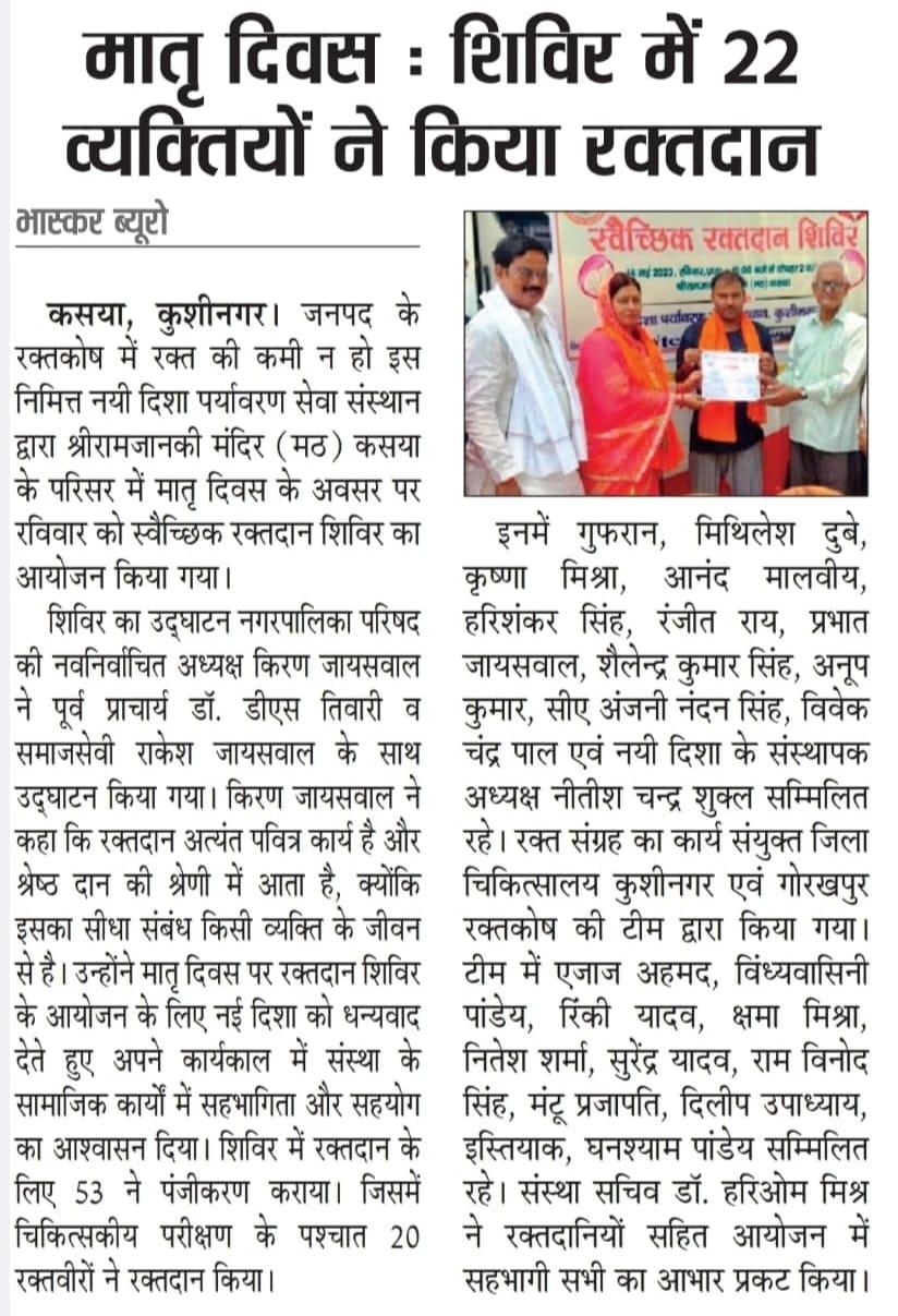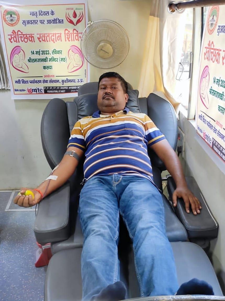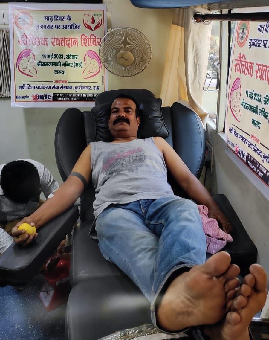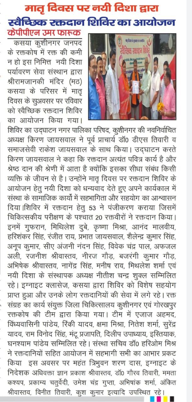 कुशीनगर जनपद के रक्तकोष में रक्त की कमी न हो इस निमित्त संस्थान द्वारा श्रीरामजानकी मंदिर (मठ) कसया के परिसर में मातृ दिवस के सुअवसर पर स्वैच्छिक रक्तदान शिविर का आयोजन किया गया। शिविर का उद्घाटन नगर पालिका परिषद, कुशीनगर की नवनिर्वाचित अध्यक्ष श्रीमती किरण जायसवाल जी ने संस्था संरक्षक डॉ0 डीएस तिवारी जी व समाजसेवी श्री राकेश जायसवाल जी के साथ किया।