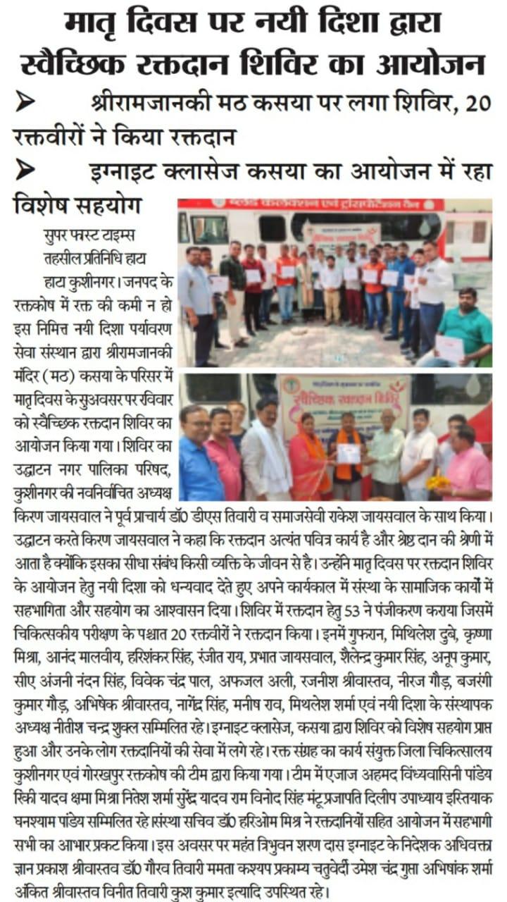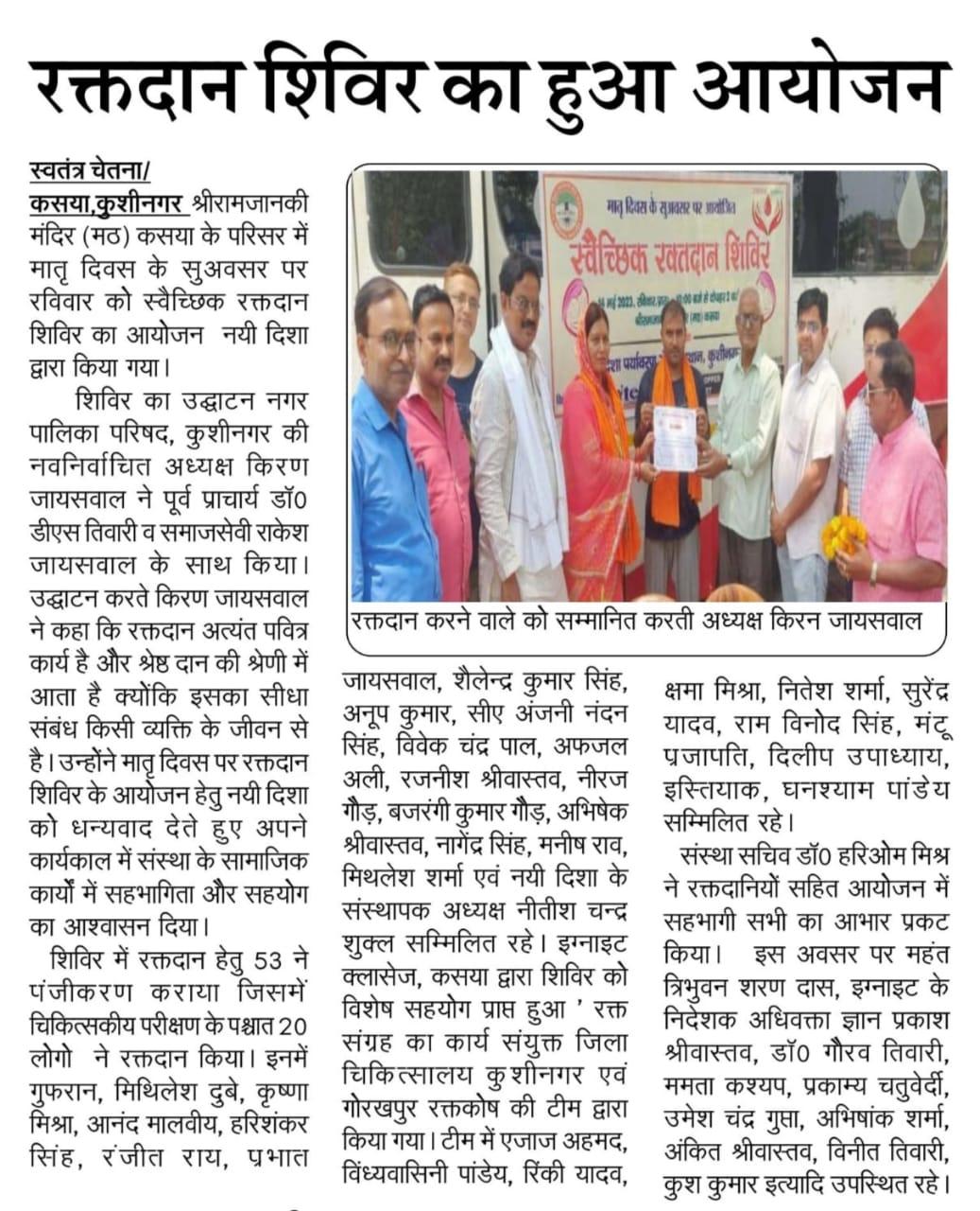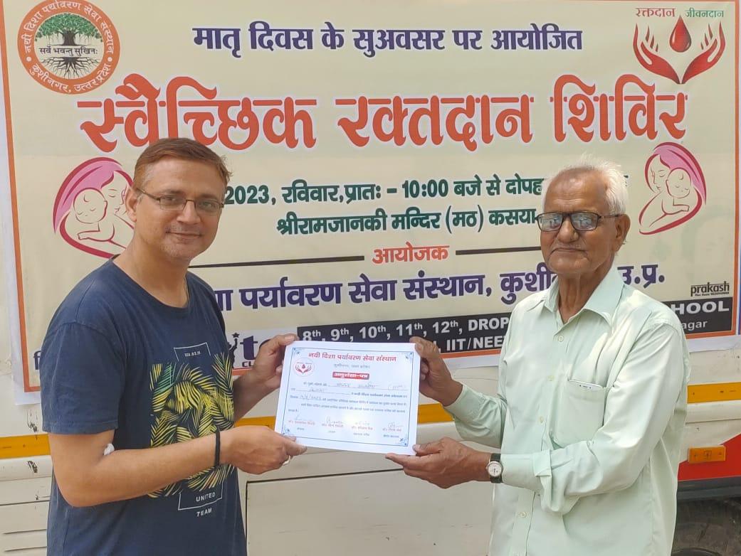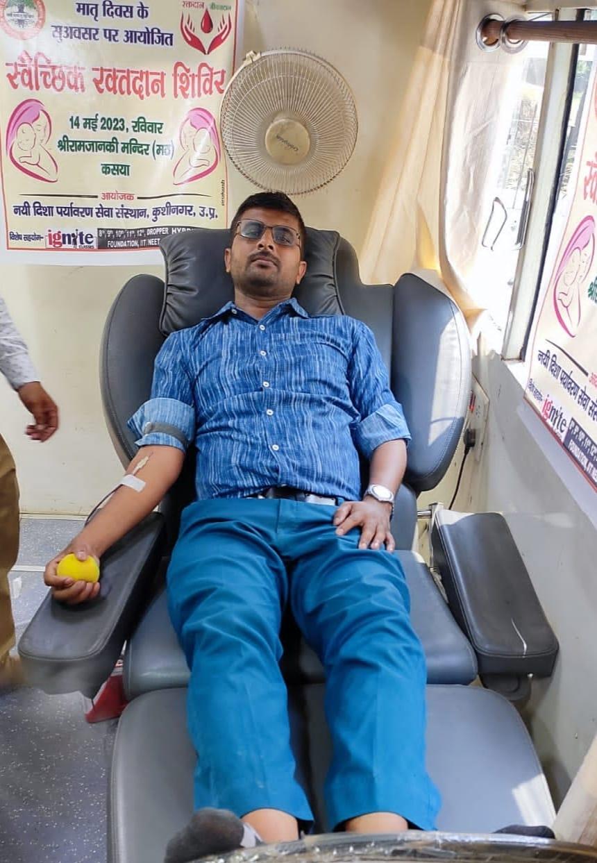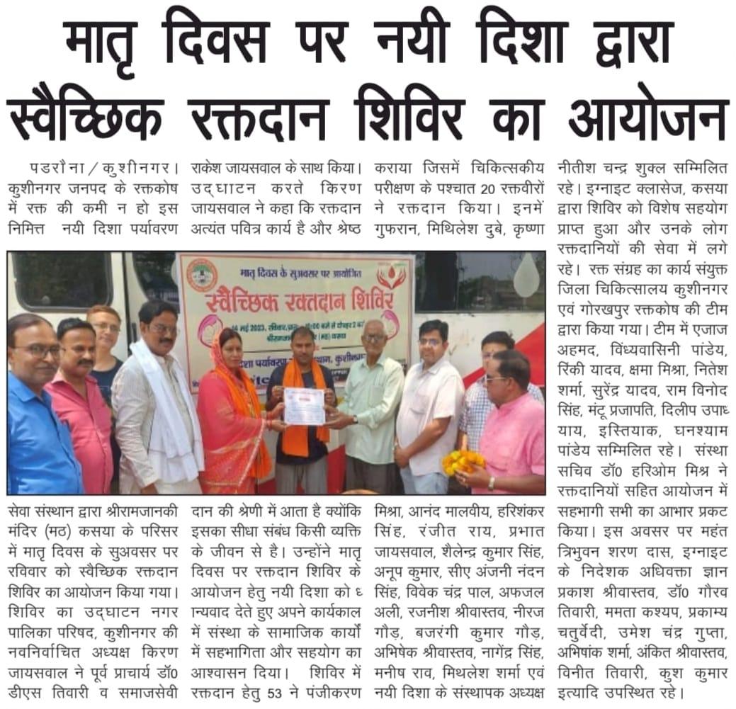कुशीनगर जनपद के रक्तकोष में रक्त की कमी न हो इस निमित्त संस्थान द्वारा श्रीरामजानकी मंदिर (मठ) कसया के परिसर में मातृ दिवस के सुअवसर पर स्वैच्छिक रक्तदान शिविर का आयोजन किया गया। शिविर का उद्घाटन नगर पालिका परिषद, कुशीनगर की नवनिर्वाचित अध्यक्ष श्रीमती किरण जायसवाल जी ने संस्था संरक्षक डॉ0 डीएस तिवारी जी व समाजसेवी श्री राकेश जायसवाल जी के साथ किया।