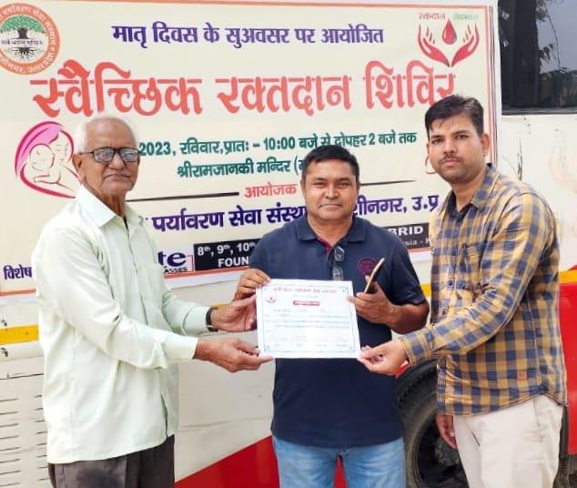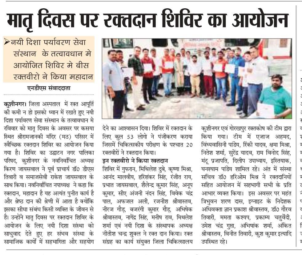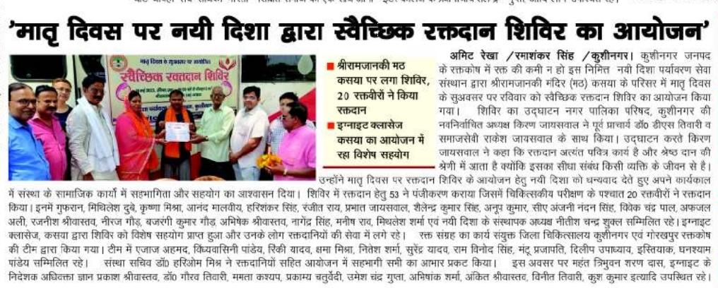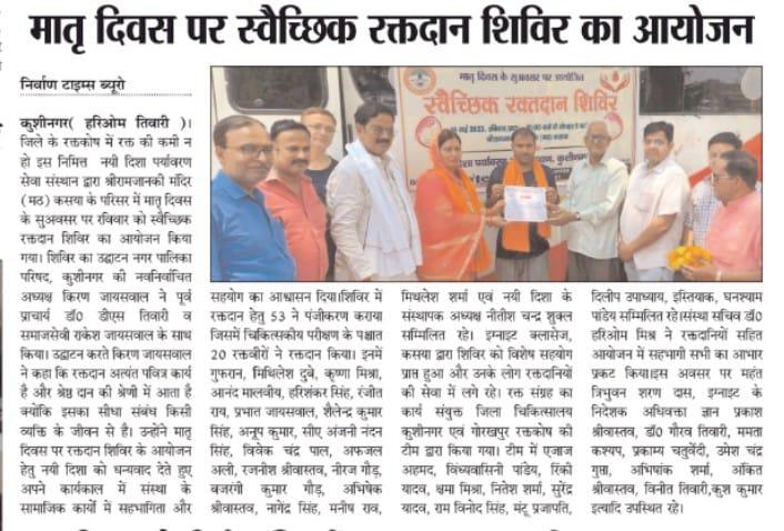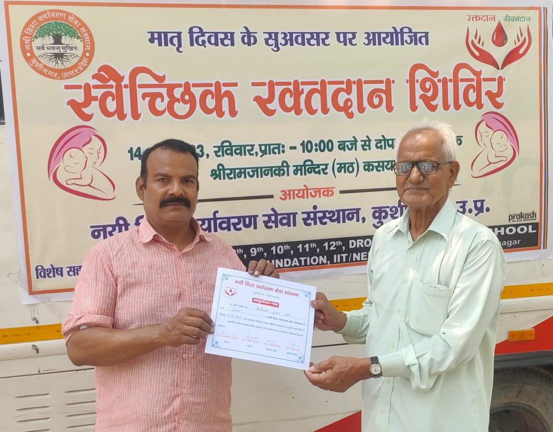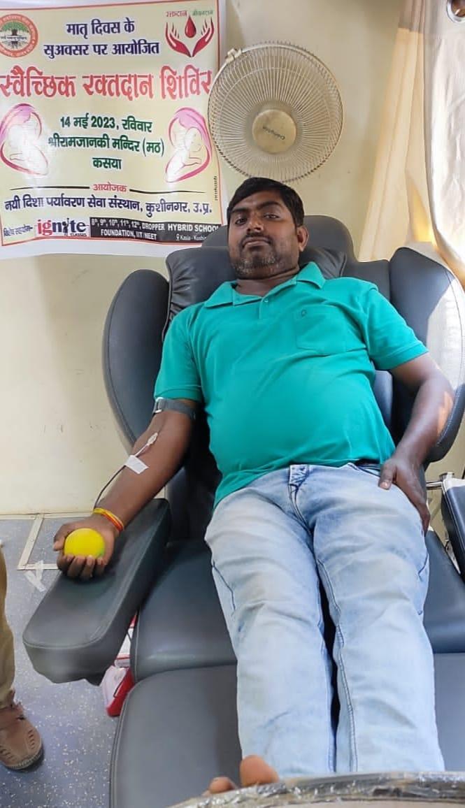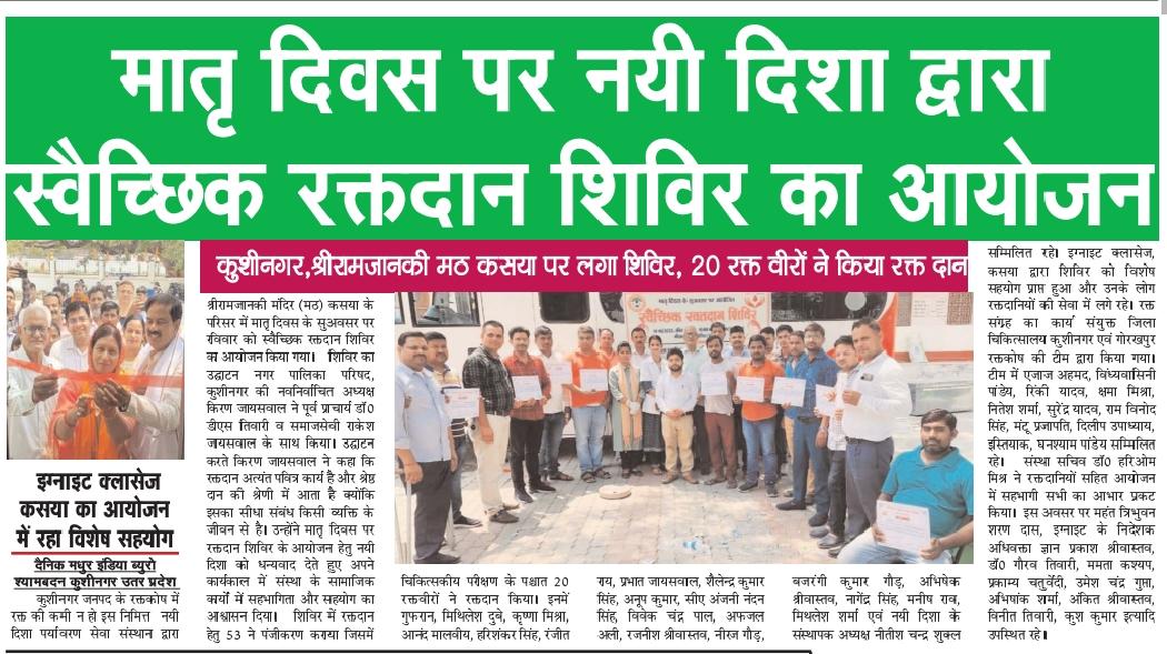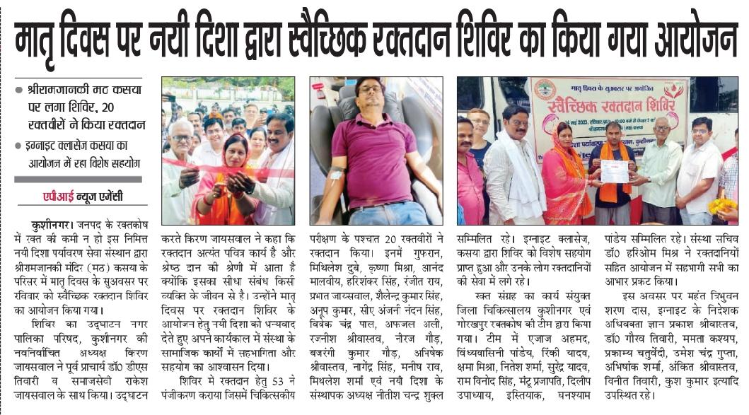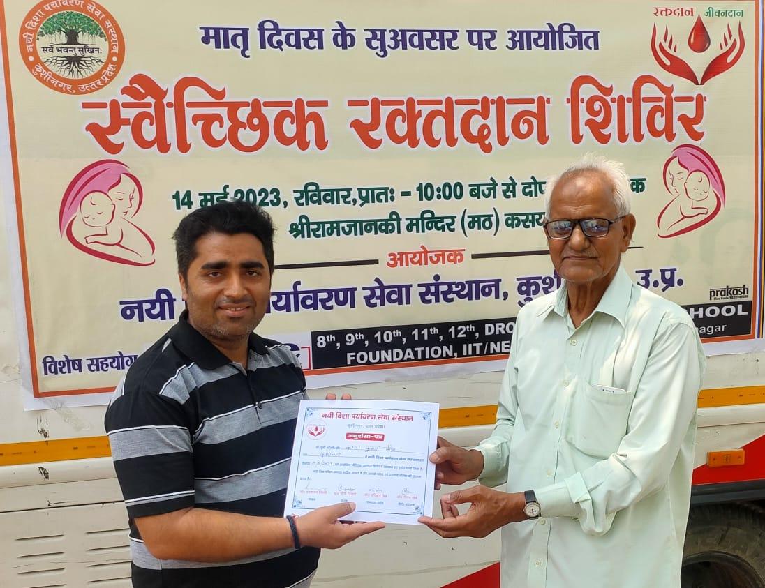 कुशीनगर जनपद के रक्तकोष में रक्त की कमी न हो इस निमित्त संस्थान द्वारा श्रीरामजानकी मंदिर (मठ) कसया के परिसर में मातृ दिवस के सुअवसर पर स्वैच्छिक रक्तदान शिविर का आयोजन किया गया। शिविर का उद्घाटन नगर पालिका परिषद, कुशीनगर की नवनिर्वाचित अध्यक्ष श्रीमती किरण जायसवाल जी ने संस्था संरक्षक डॉ0 डीएस तिवारी जी व समाजसेवी श्री राकेश जायसवाल जी के साथ किया।