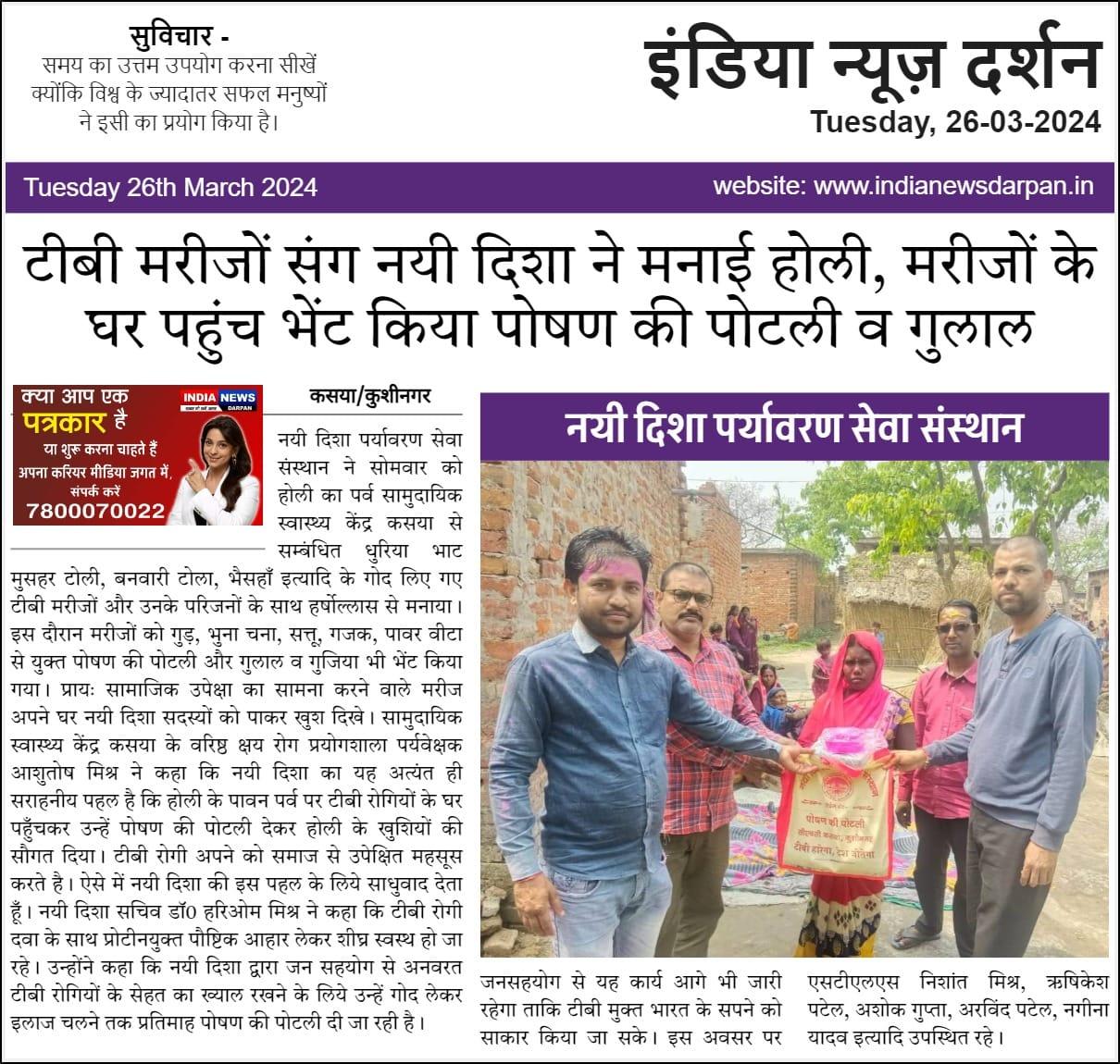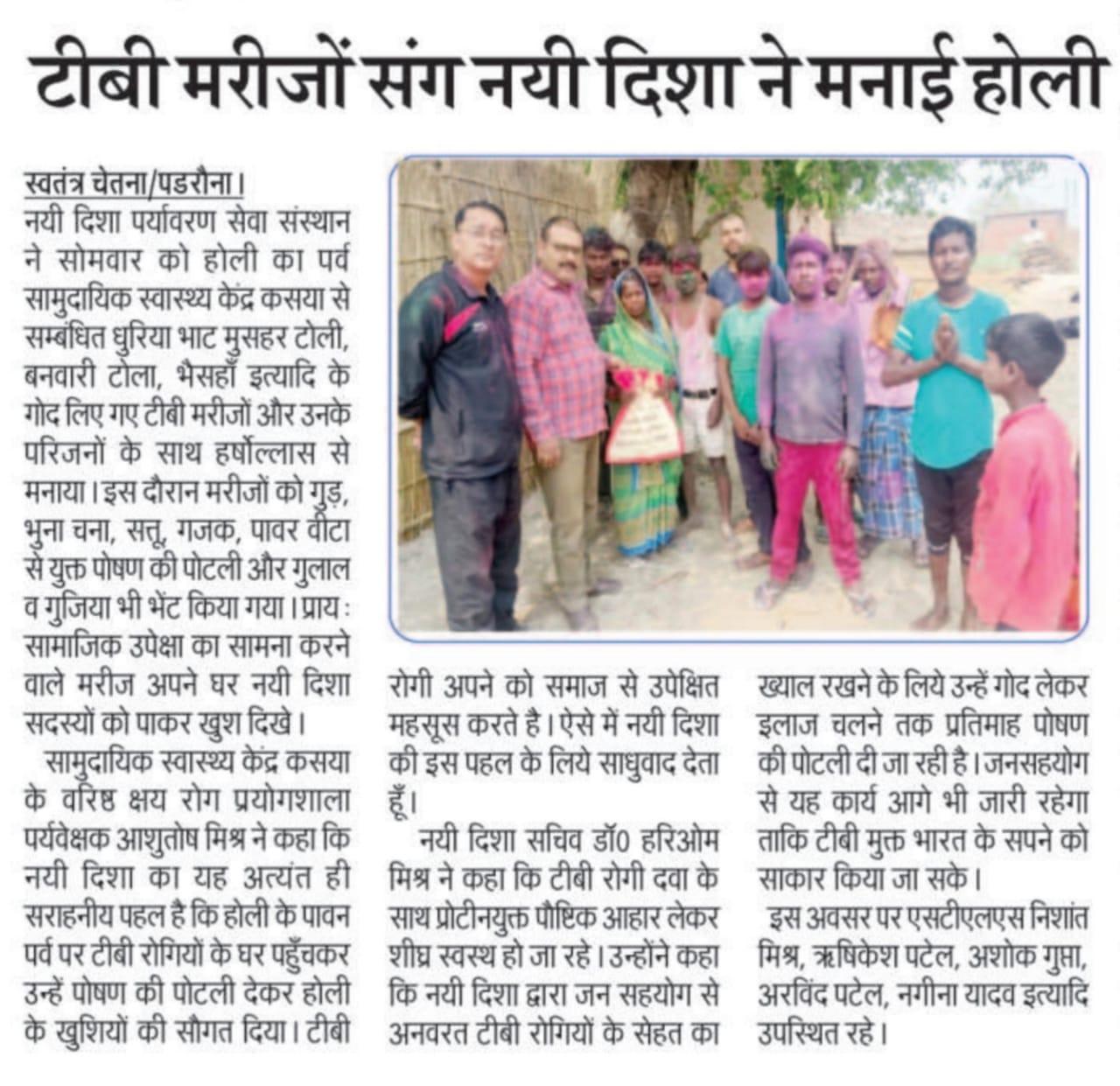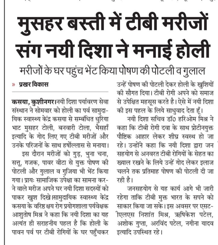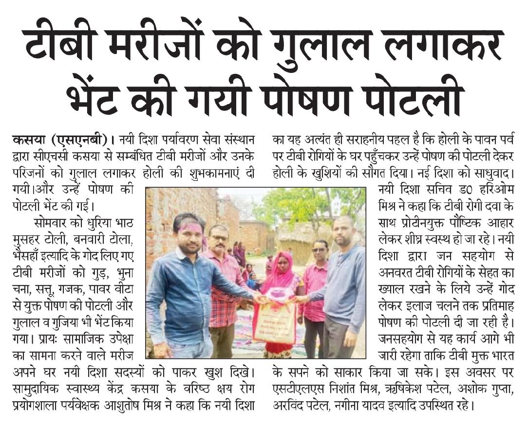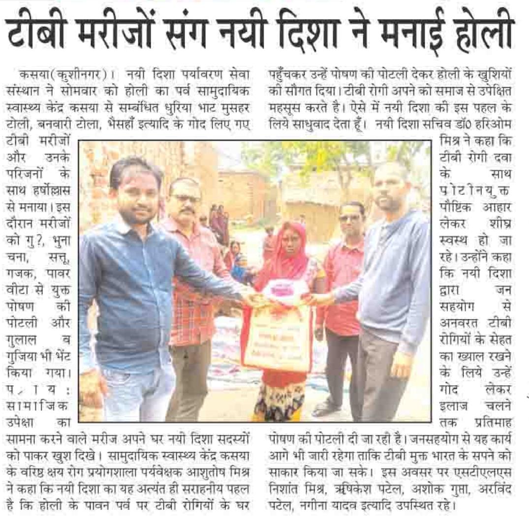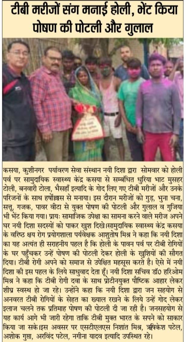 संस्थान द्वारा होली का पर्व सामुदायिक स्वास्थ्य केंद्र कसया से सम्बंधित धुरिया भाट मुसहर टोली, बनवारी टोला, भैसहाँ इत्यादि के गोद लिए गए टीबी मरीजों और उनके परिजनों के साथ हर्षोल्लास से मनाया गया। इस दौरान मरीजों को जन सहयोग से गुड़, भुना चना, सत्तू, गजक, पावर वीटा से युक्त पोषण की पोटली और गुलाल व गुजिया भी भेंट किया गया। प्रायः सामाजिक उपेक्षा का सामना करने वाले मरीज अपने घर नयी दिशा सदस्यों को पाकर खुश दिखे।