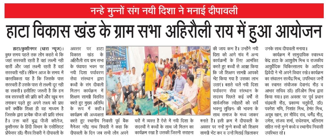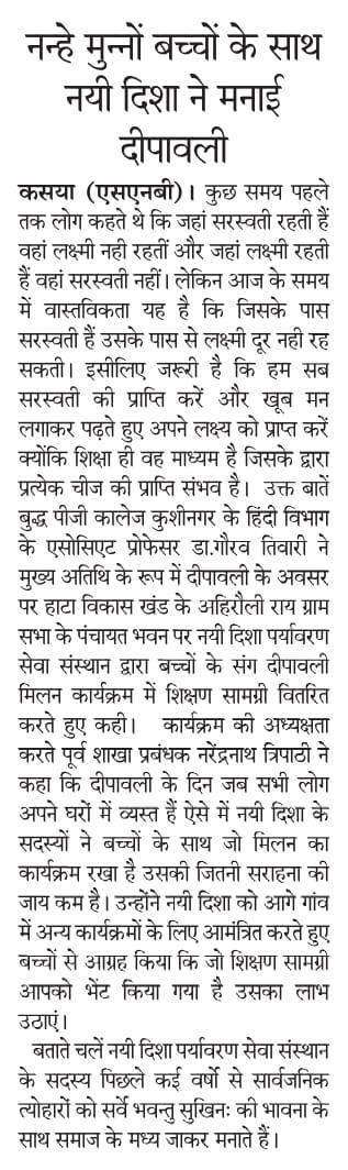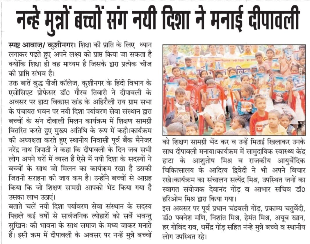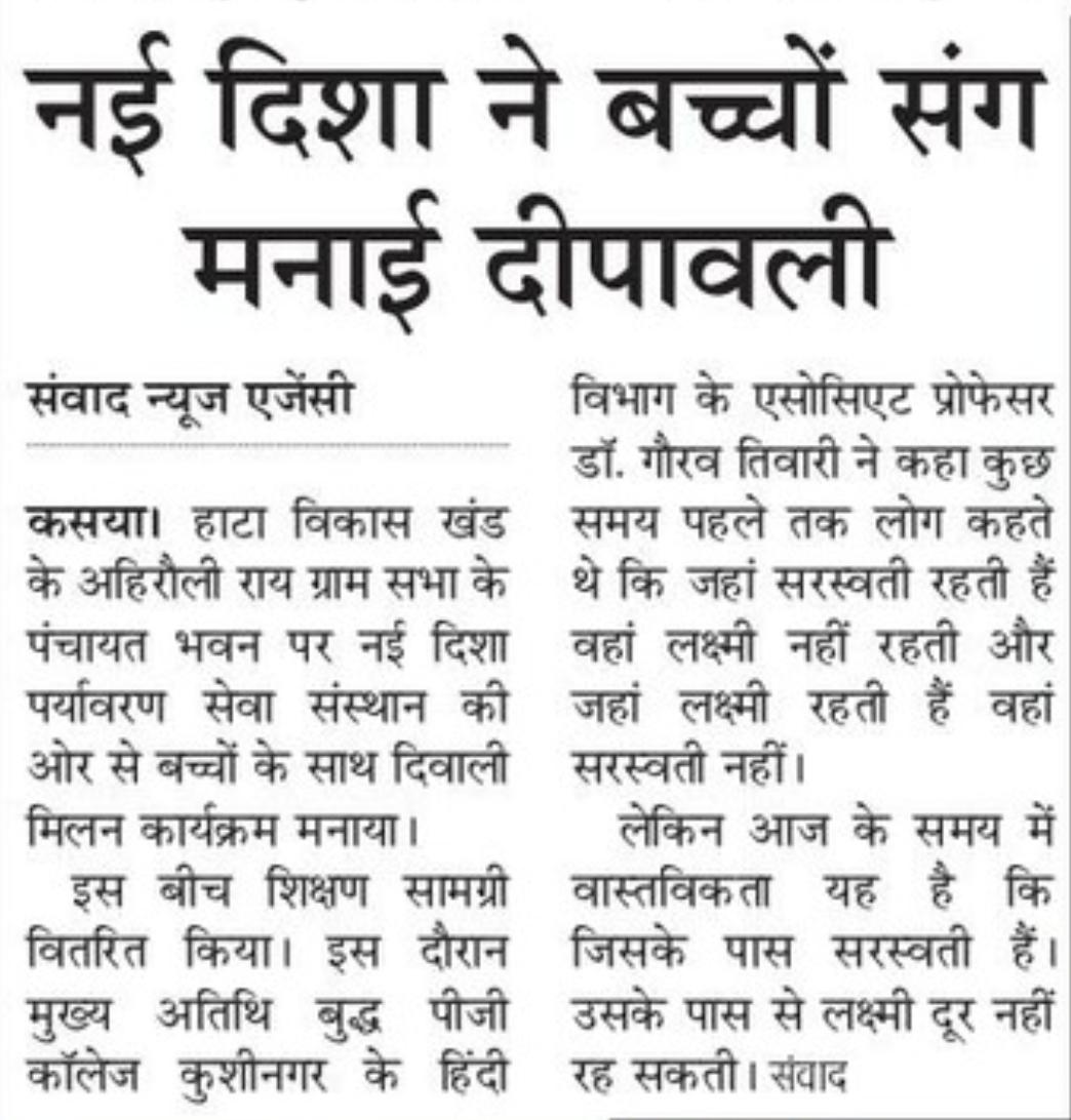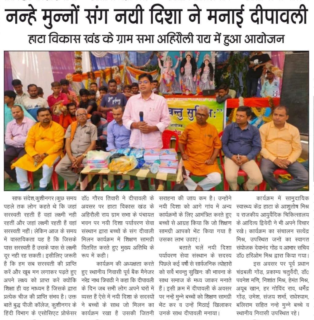 सर्वे भवन्तु सुखिनः की भावना के साथ दीपावली के सुअवसर पर संस्थान द्वारा हाटा विकास खंड के ग्राम सभा अहिरौली राय पंचायत भवन पर नन्हे मुन्नों संग दीपावली मनाई गयी और उन्हें शिक्षण सामग्री भेंट कर मिठाई खिलाते हुए अपनी दीपावली को रौशन किया गया।