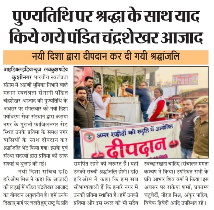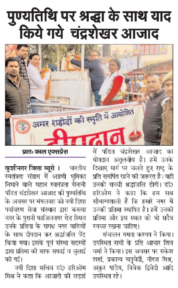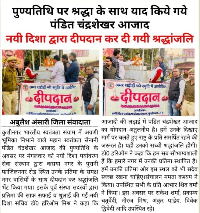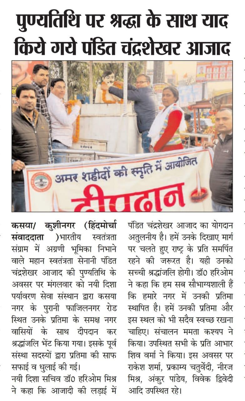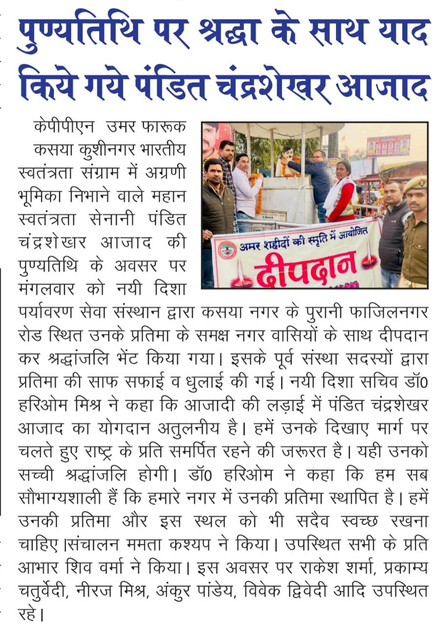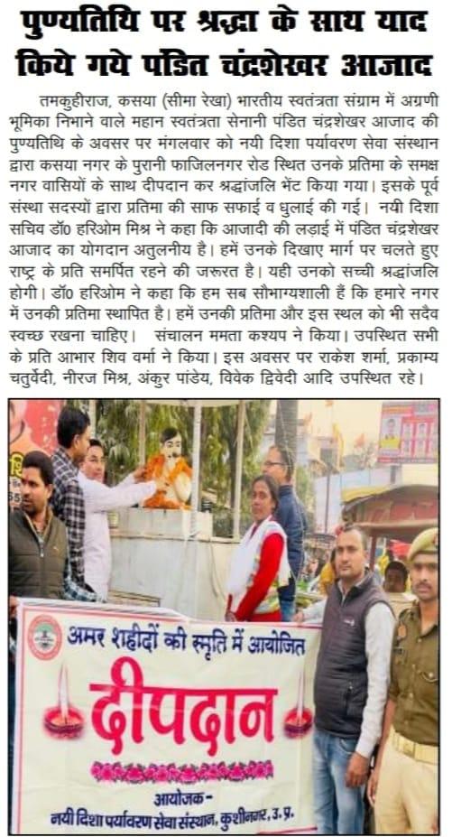 महान स्वतंत्रता संग्राम सेनानी पंडित चंद्रशेखर आजाद जी की पुण्यतिथि के अवसर पर संस्थान द्वारा कसया नगर के पुरानी फाजिलनगर रोड स्थित उनके प्रतिमा के समक्ष दीपदान कर श्रद्धांजलि भेंट किया गया। इसके पूर्व संस्था सदस्यों द्वारा प्रतिमा की साफ सफाई की गई।