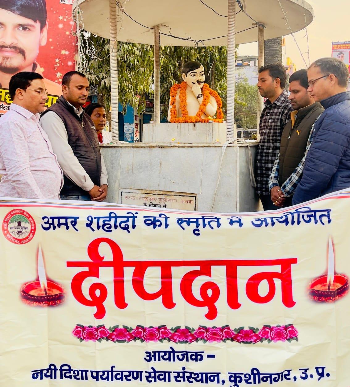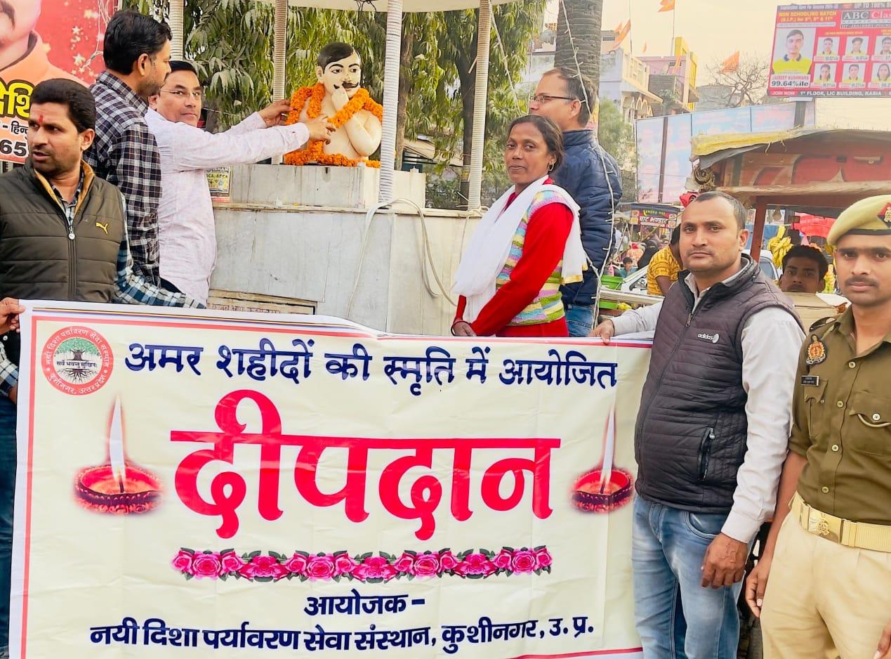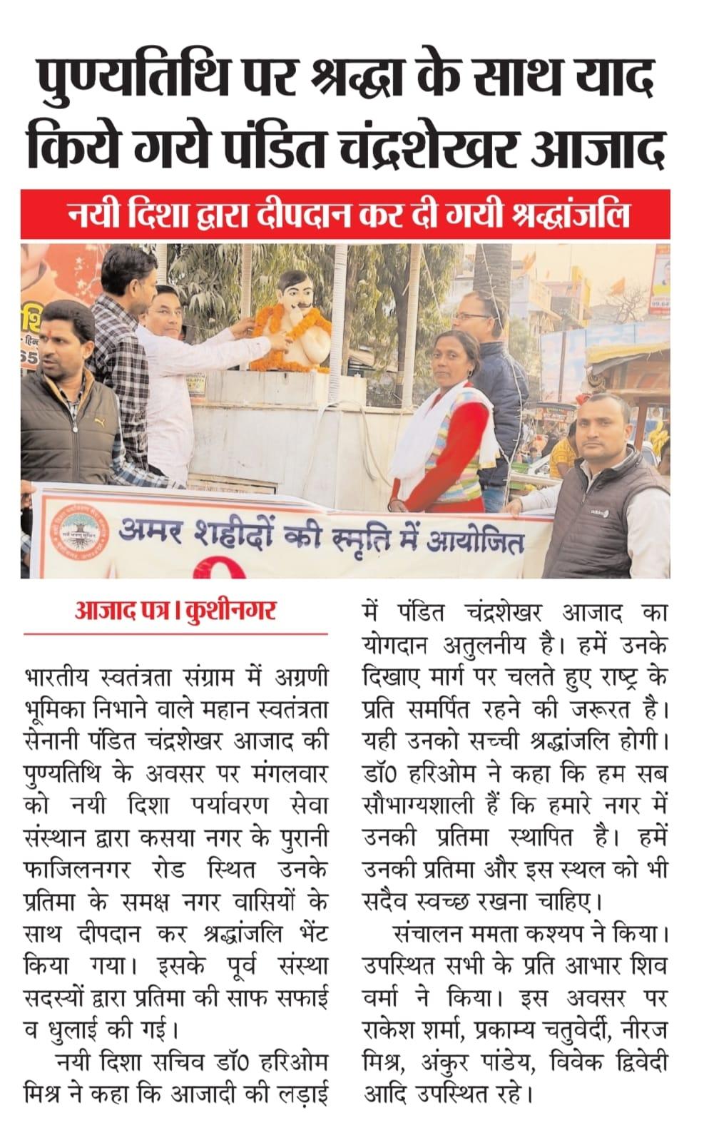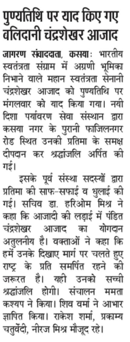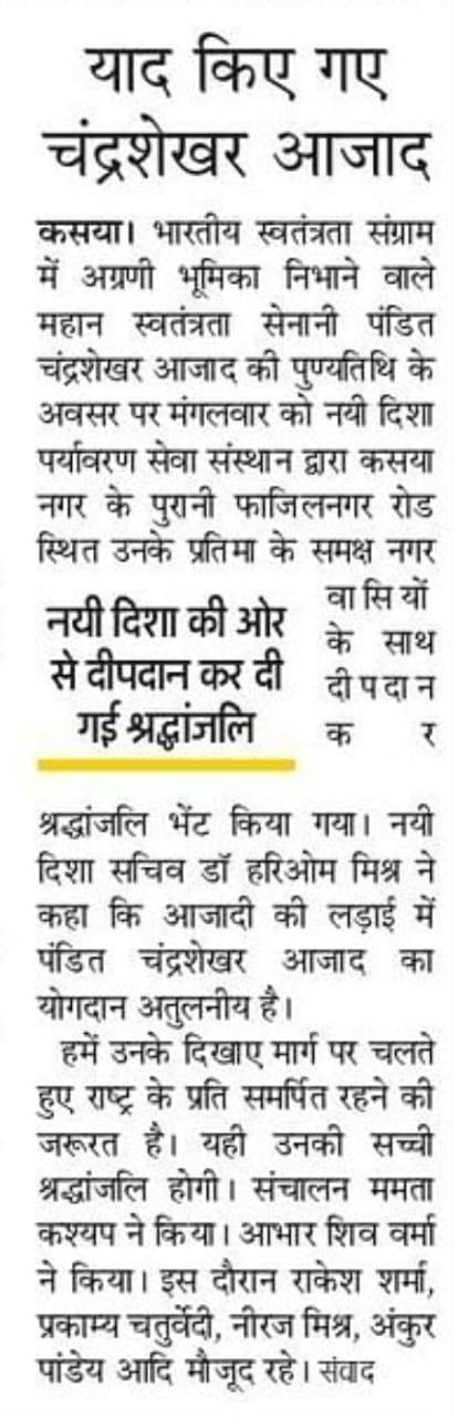 महान स्वतंत्रता संग्राम सेनानी पंडित चंद्रशेखर आजाद जी की पुण्यतिथि के अवसर पर संस्थान द्वारा कसया नगर के पुरानी फाजिलनगर रोड स्थित उनके प्रतिमा के समक्ष दीपदान कर श्रद्धांजलि भेंट किया गया। इसके पूर्व संस्था सदस्यों द्वारा प्रतिमा की साफ सफाई की गई।