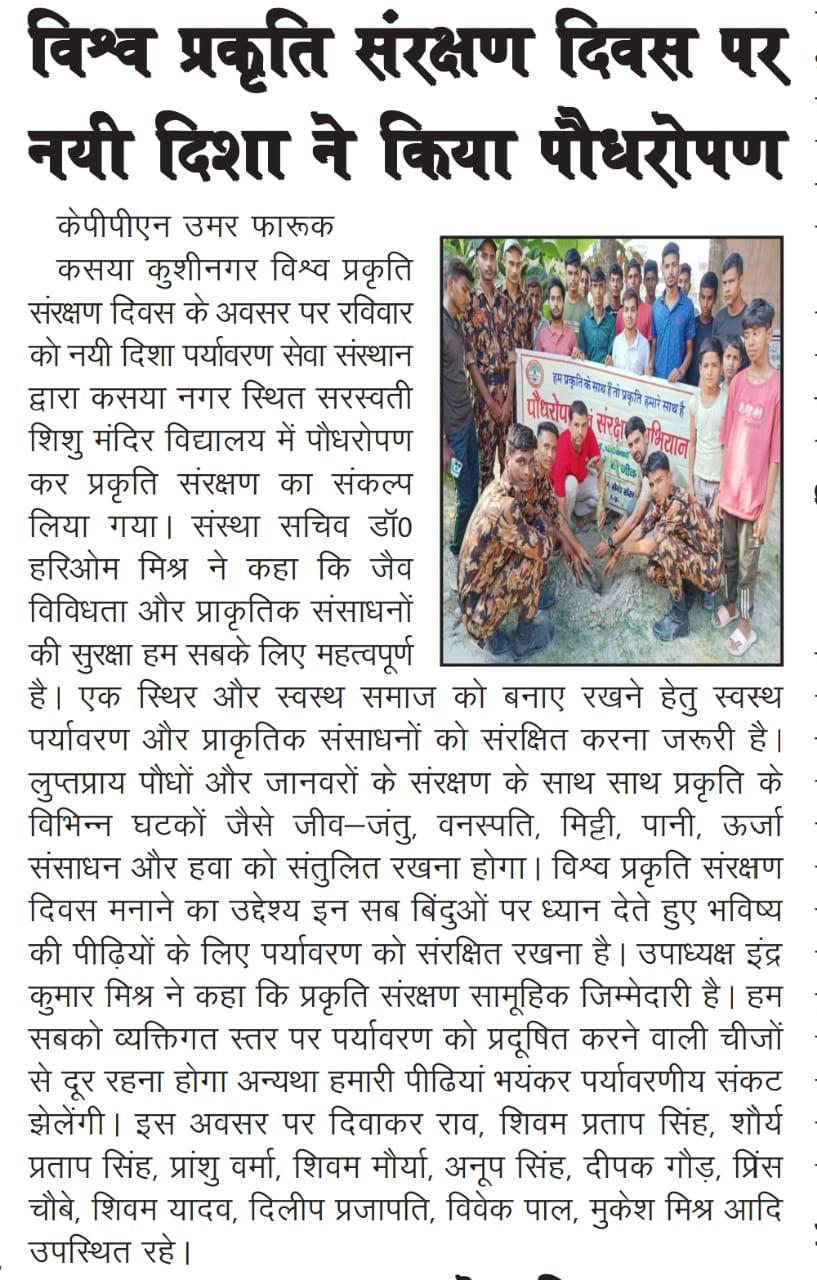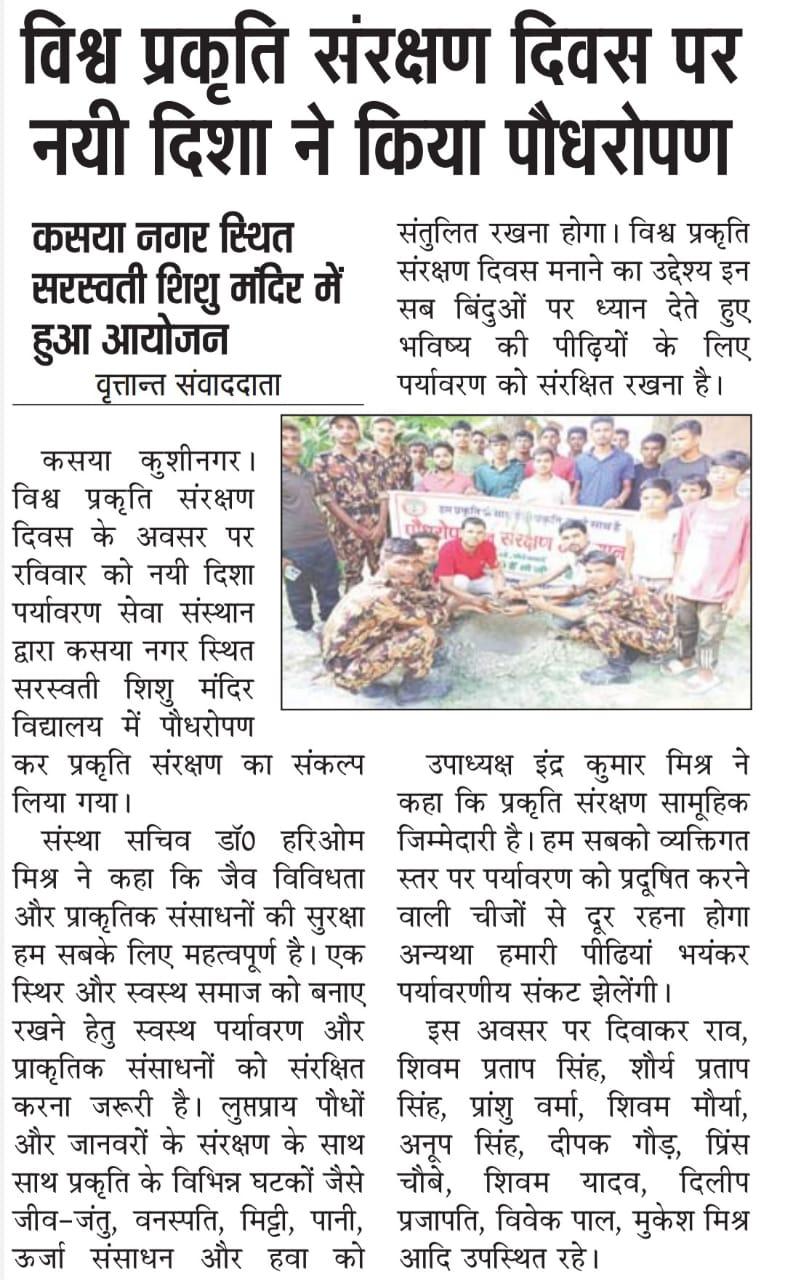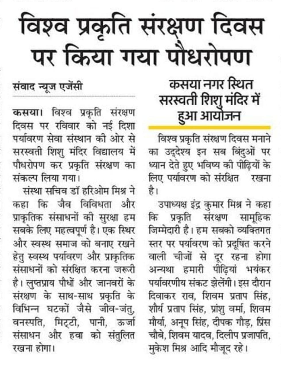 विश्व प्रकृति संरक्षण दिवस के अवसर पर संस्थान द्वारा कसया नगर स्थित सरस्वती शिशु मंदिर विद्यालय में पौधरोपण कर प्रकृति संरक्षण का संकल्प लिया गया।