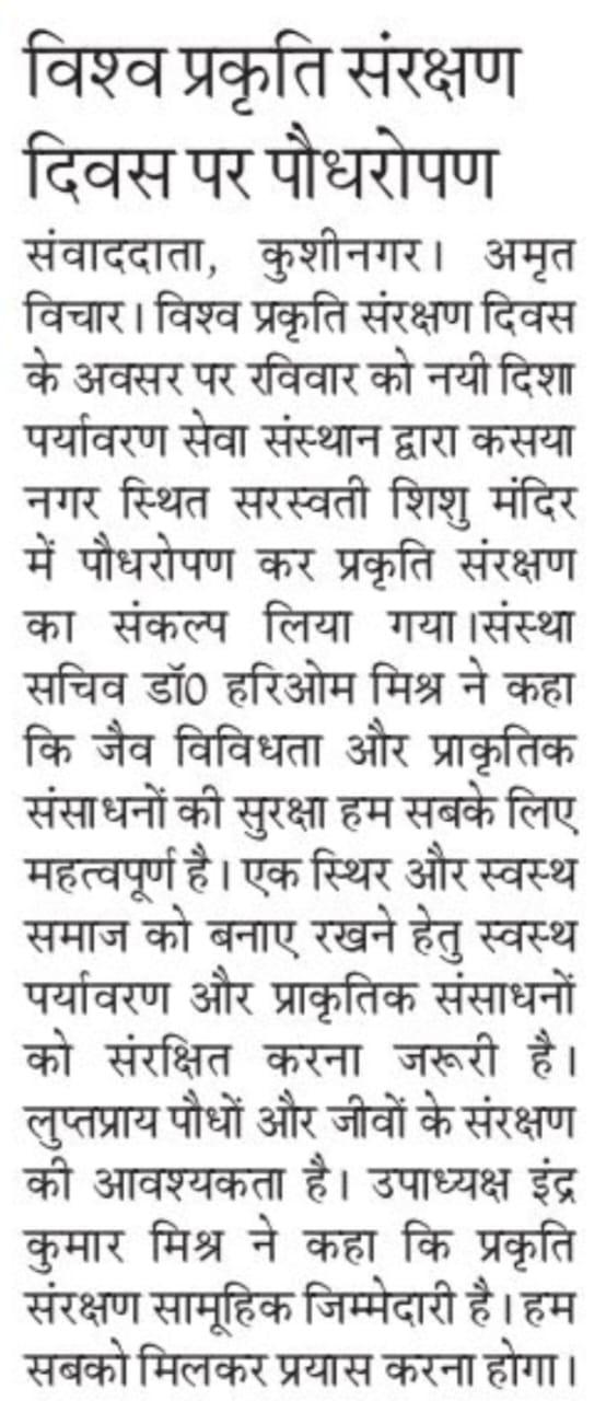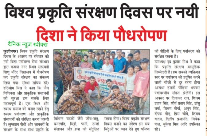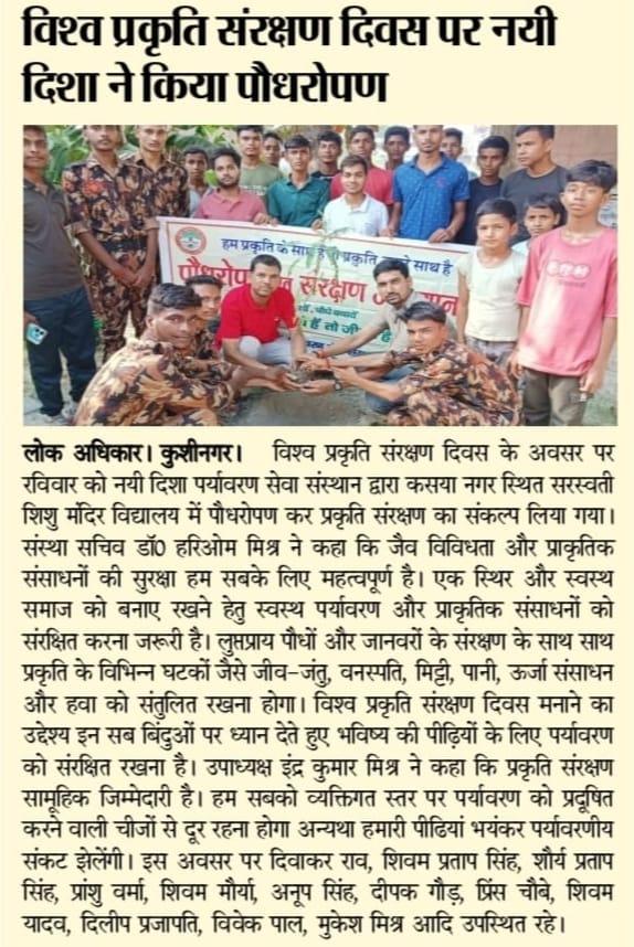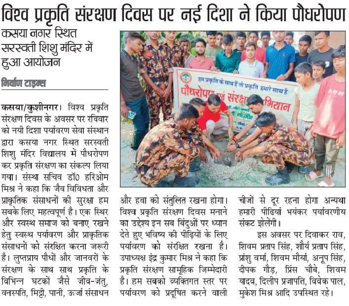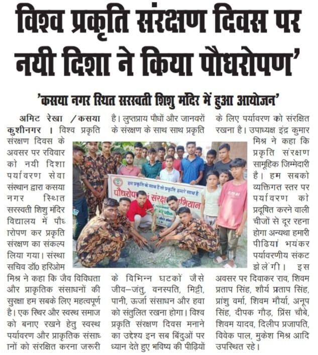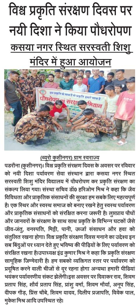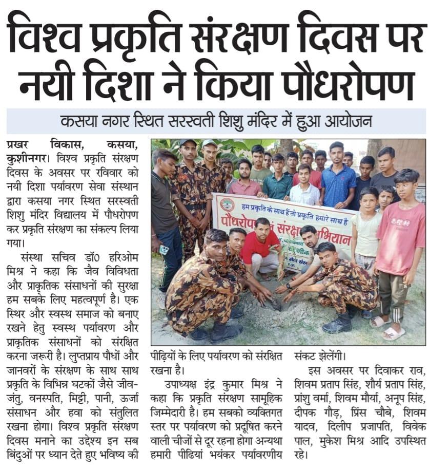 विश्व प्रकृति संरक्षण दिवस के अवसर पर संस्थान द्वारा कसया नगर स्थित सरस्वती शिशु मंदिर विद्यालय में पौधरोपण कर प्रकृति संरक्षण का संकल्प लिया गया।