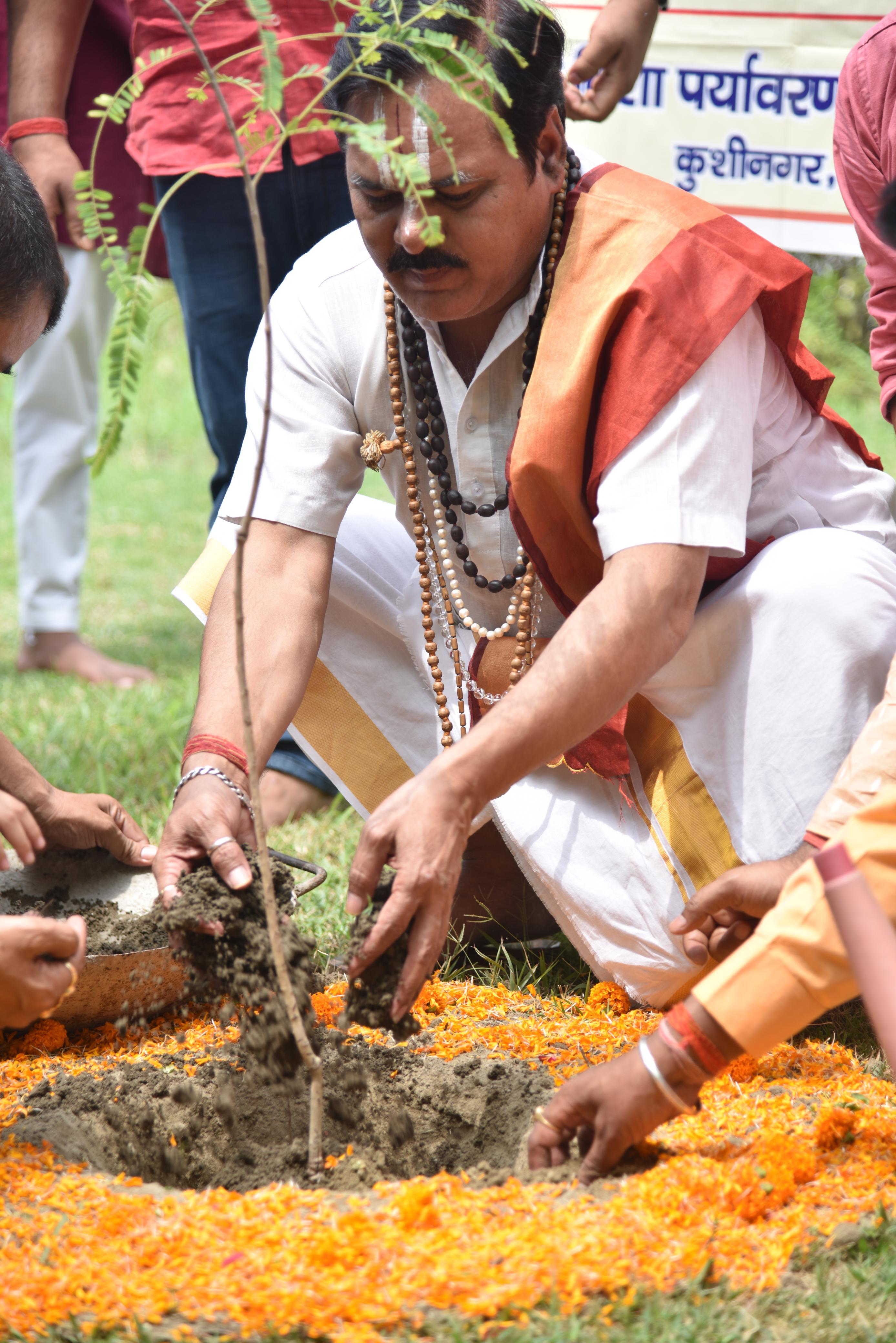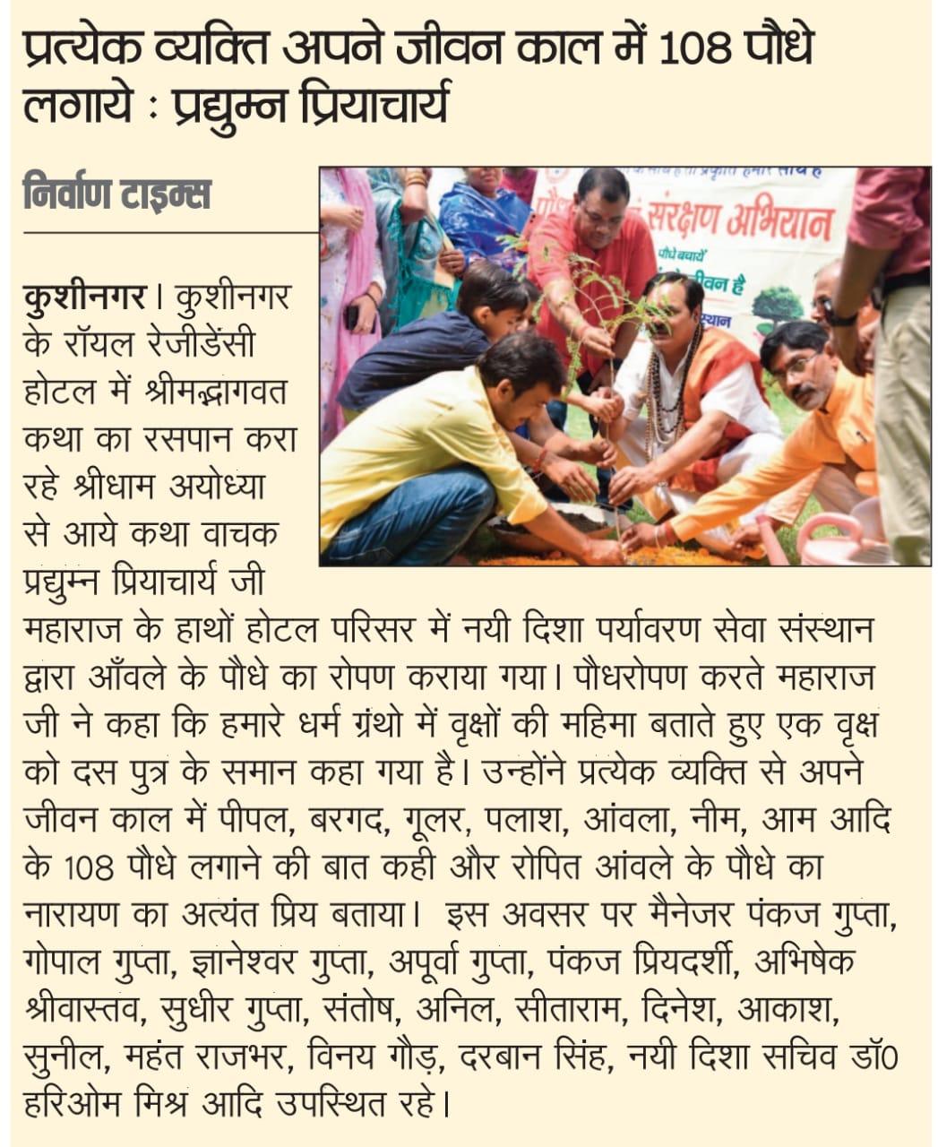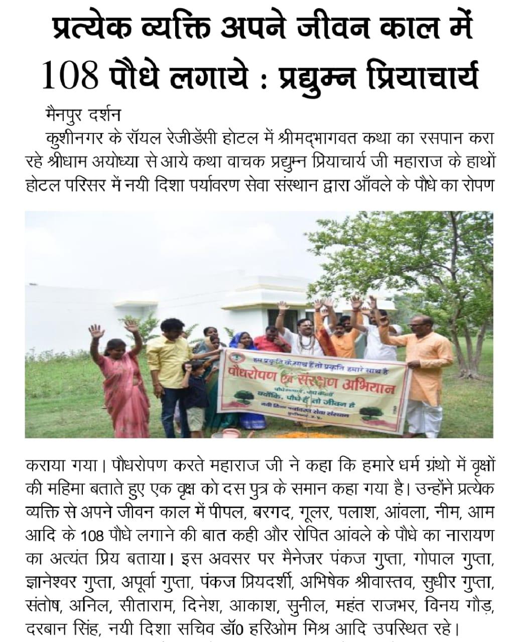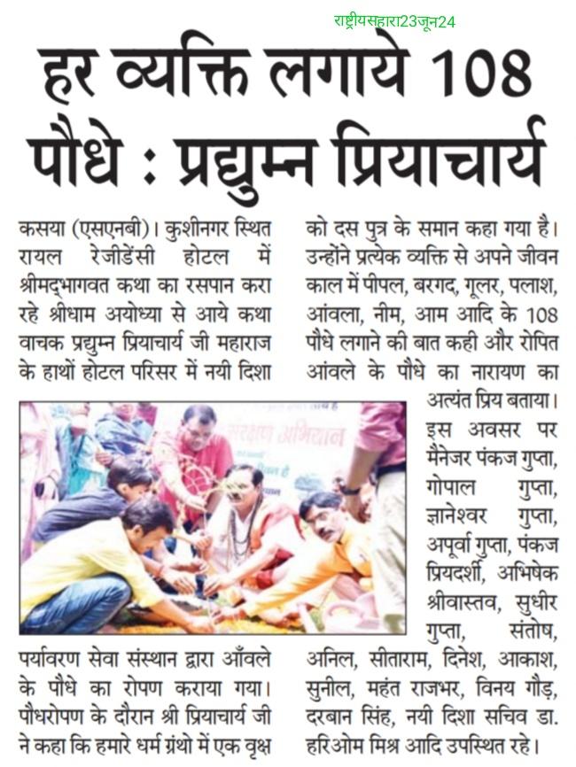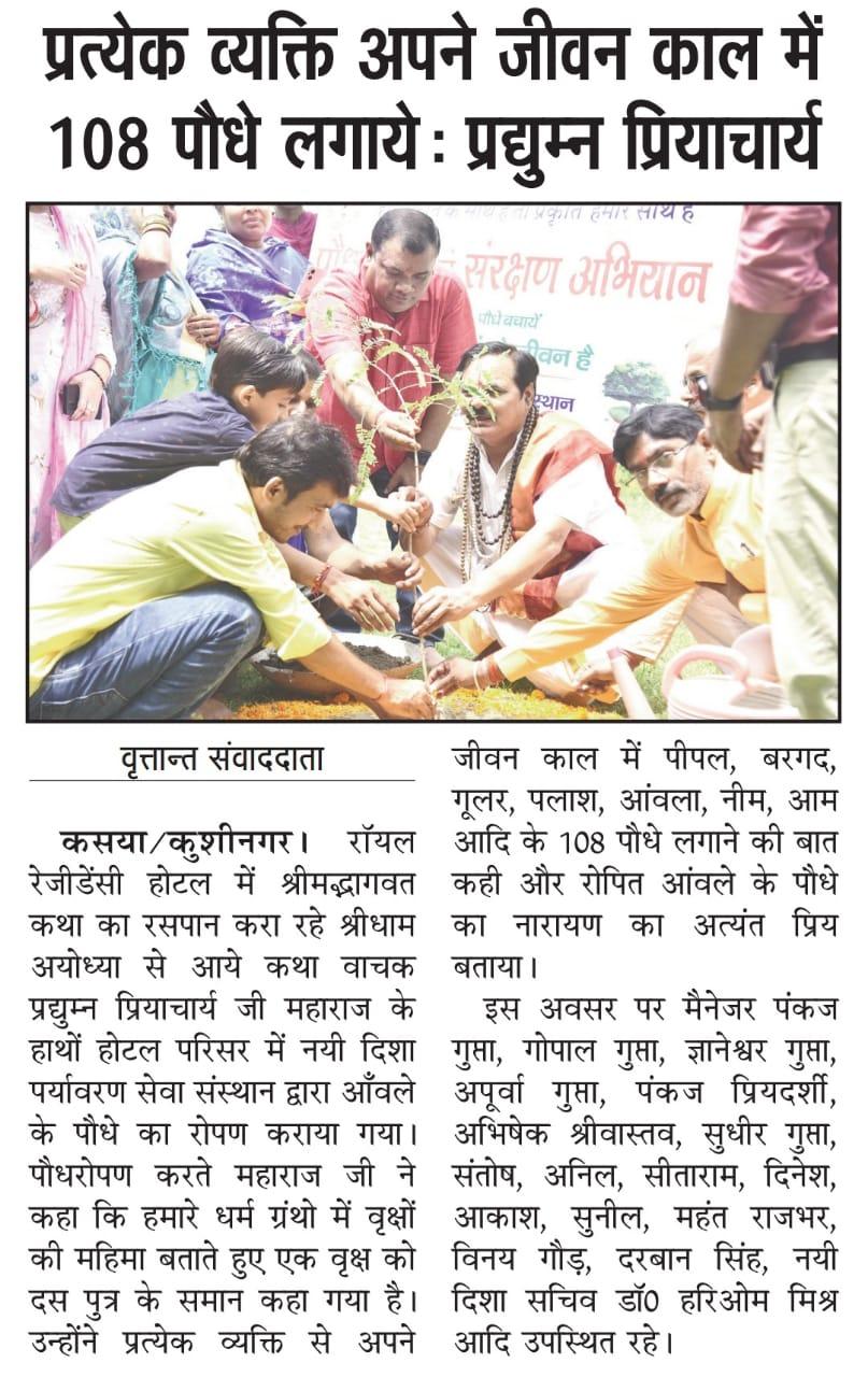 संस्थान द्वारा पर्यावरण संरक्षण हेतु चलाये जा रहे पौधरोपण अभियान के क्रम में कुशीनगर के रॉयल रेजीडेंसी होटल में श्रीमद्भागवत कथा का रसपान करा रहे श्रीधाम अयोध्या से आये कथा वाचक प्रद्युम्न प्रियाचार्य जी महाराज के हाथों होटल परिसर में आँवले के पौधे का रोपण हुआ।