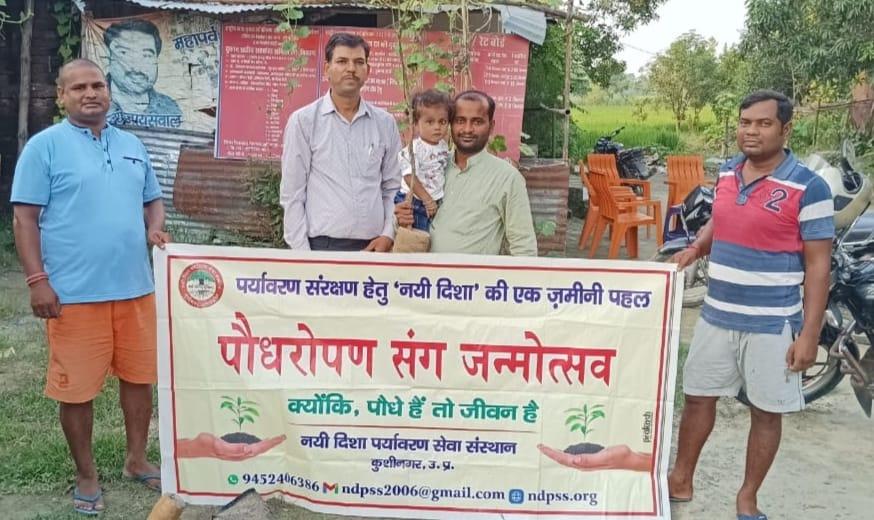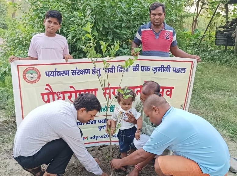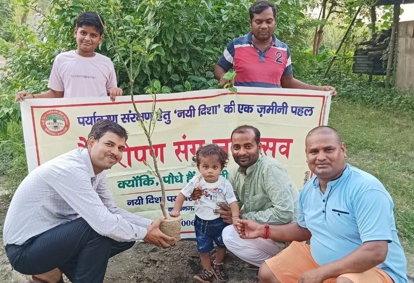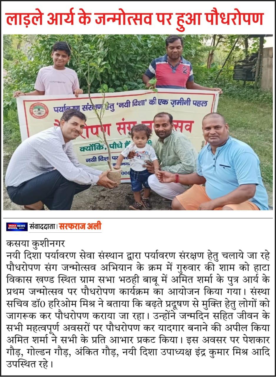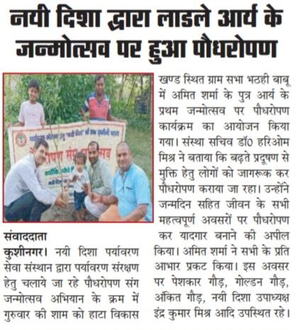 संस्थान द्वारा पर्यावरण संरक्षण हेतु चलाये जा रहे पौधरोपण संग जन्मोत्सव अभियान के क्रम में हाटा विकास खण्ड स्थित ग्राम सभा भठही बाबू निवासी श्री अमित शर्मा के लाडले आर्य के जन्मोत्सव की प्रथम वर्षगांठ पर पौधरोपण कार्यक्रम का आयोजन किया गया। इस अवसर पर श्री पेशकार गौड़, श्री गोल्डन गौड़, श्री अंकित गौड़, नयी दिशा उपाध्यक्ष श्री इंद्र कुमार मिश्र, सचिव डॉ0 हरिओम मिश्र आदि उपस्थित रहे।