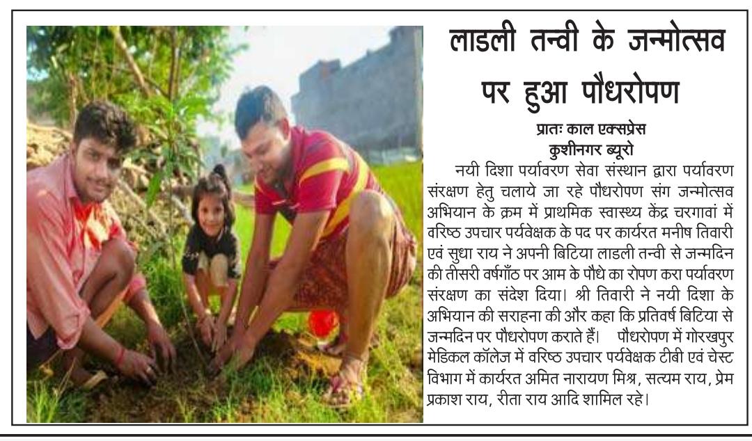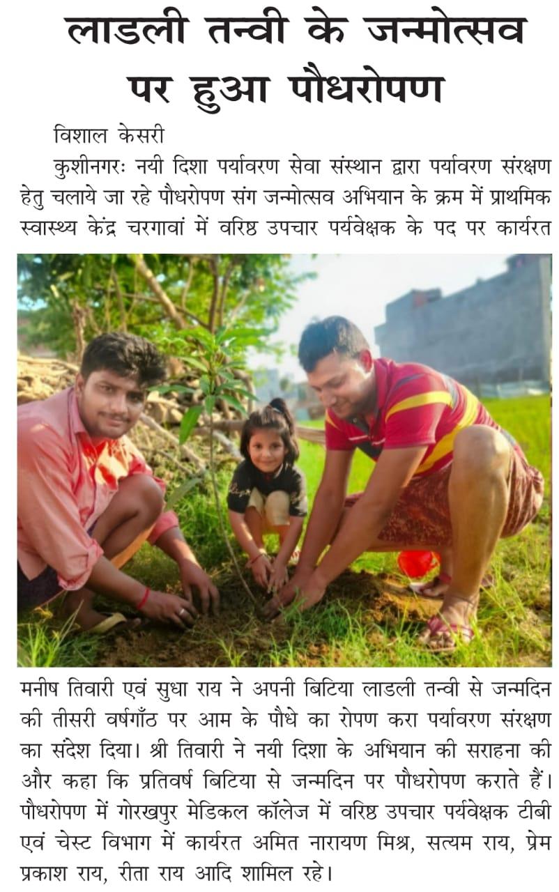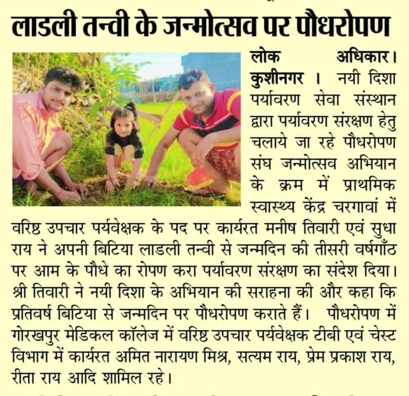 संस्थान द्वारा पर्यावरण संरक्षण हेतु चलाये जा रहे पौधरोपण संग जन्मोत्सव अभियान के क्रम में प्राथमिक स्वास्थ्य केंद्र चरगावां में वरिष्ठ उपचार पर्यवेक्षक के पद पर कार्यरत श्री मनीष तिवारी एवं श्रीमती सुधा राय ने अपनी बिटिया लाडली तन्वी से जन्मदिन की तीसरी वर्षगाँठ पर आम के पौधे का रोपण करा पर्यावरण संरक्षण का संदेश दिया।