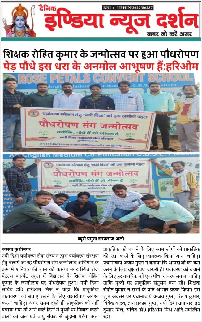 संस्थान द्वारा पर्यावरण संरक्षण हेतु चलाये जा रहे पौधरोपण संग जन्मोत्सव अभियान के क्रम में कसया नगर स्थित रोज पेटल्स कान्वेंट स्कूल में विद्यालय के शिक्षक श्री रोहित कुमार के जन्मोत्सव पर पौधरोपण हुआ।