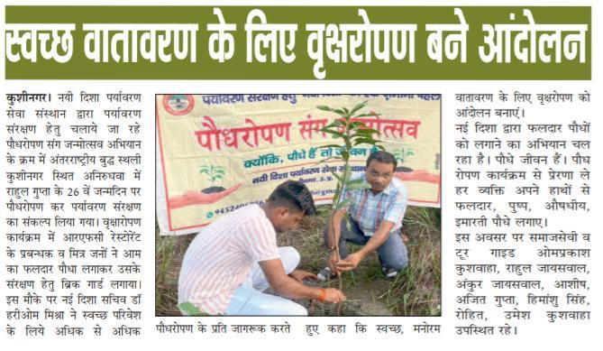 संस्थान द्वारा पर्यावरण संरक्षण हेतु चलाये जा रहे पौधरोपण संग जन्मोत्सव अभियान के क्रम में बुद्ध स्थली कुशीनगर के अनिरुधवा में आरएफसी रेस्टोरेंट कुशीनगर के संचालक श्री राहुल गुप्ता जी ने पौधरोपण कर पर्यावरण संरक्षण का संदेश देते हुए 26 वां जन्मोत्सव मनाया और ब्रिक गार्ड से पौधे को सुरक्षित किया।