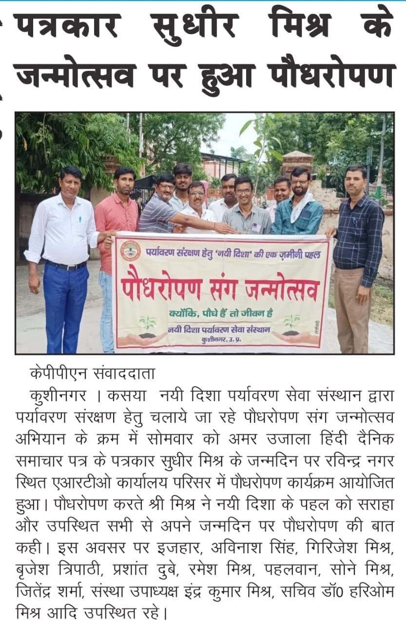 संस्थान द्वारा पर्यावरण संरक्षण हेतु चलाये जा रहे पौधरोपण संग जन्मोत्सव अभियान के क्रम में अमर उजाला हिंदी दैनिक समाचार पत्र के पत्रकार श्री सुधीर मिश्र के जन्मदिन पर रविन्द्र नगर स्थित एआरटीओ कार्यालय के परिसर में पौधरोपण कार्यक्रम आयोजित हुआ।