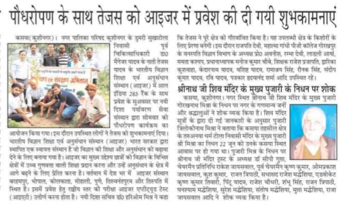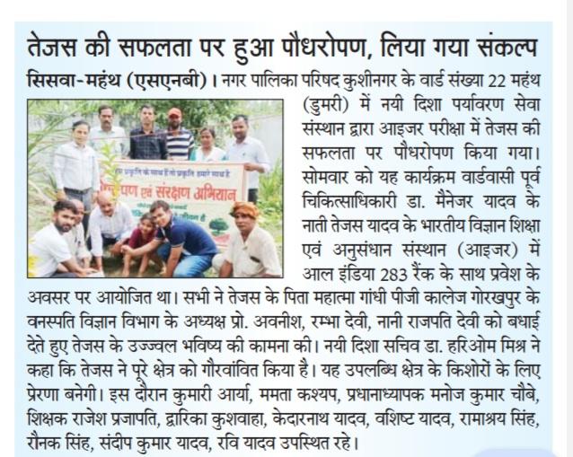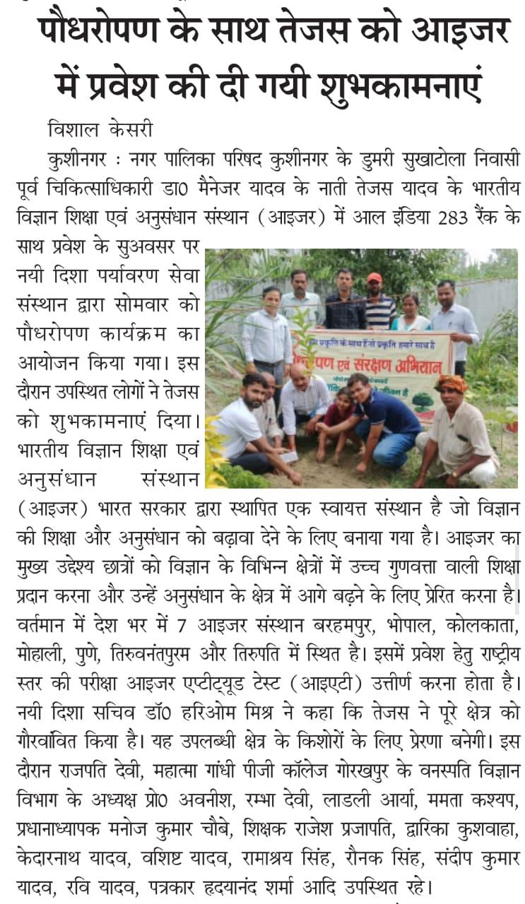 नगर पालिका परिषद कुशीनगर के डुमरी सुखाटोला निवासी पूर्व चिकित्साधिकारी डा0 मैनेजर यादव के नाती लाडले श्री तेजस यादव के भारतीय विज्ञान शिक्षा एवं अनुसंधान संस्थान (आइजर) में प्रवेश के सुअवसर पर नयी दिशा पर्यावरण सेवा संस्थान द्वारा सोमवार को पौधरोपण कार्यक्रम का आयोजन किया गया। इस दौरान उपस्थित लोगों ने तेजस को शुभकामनाएं दिया।