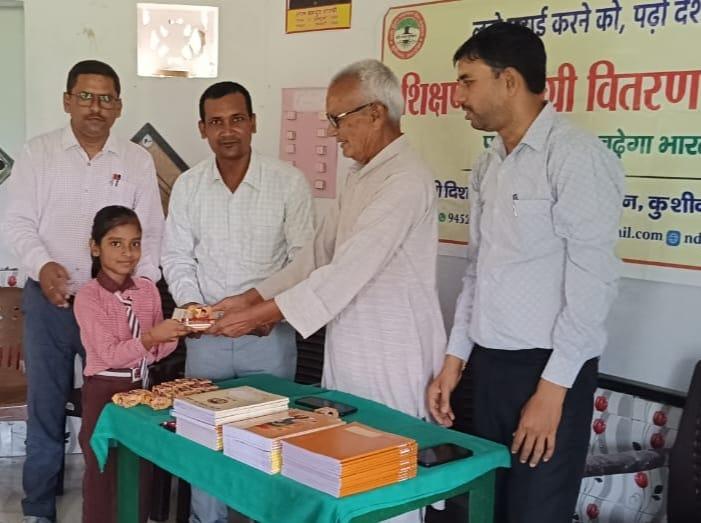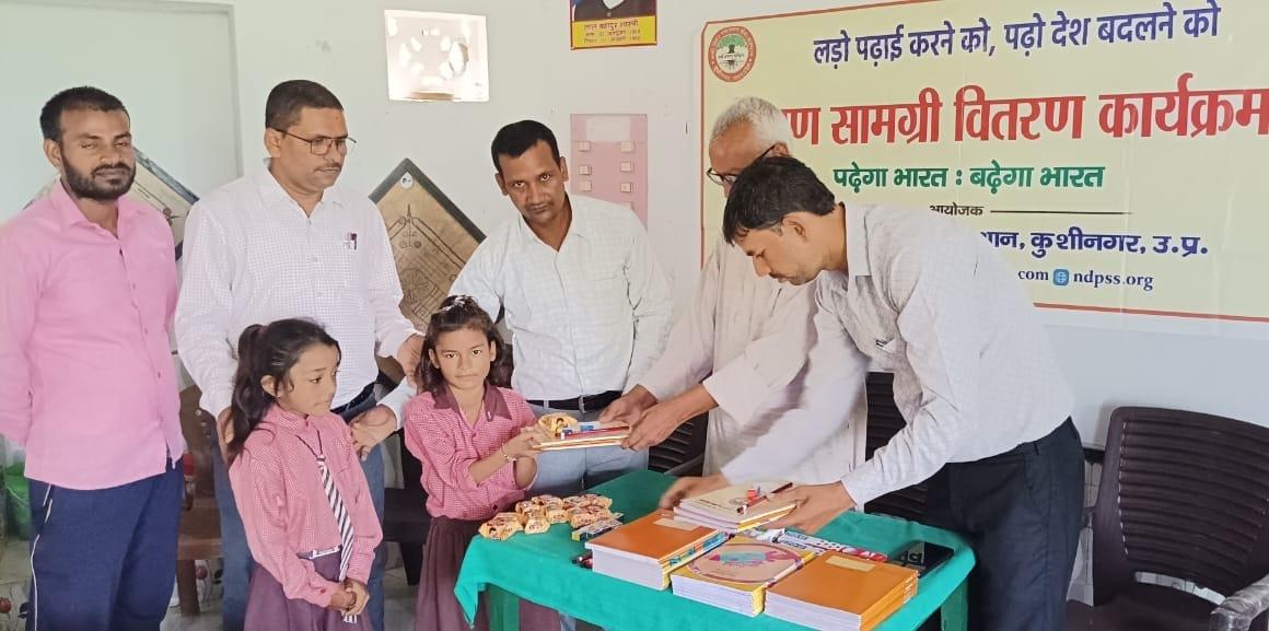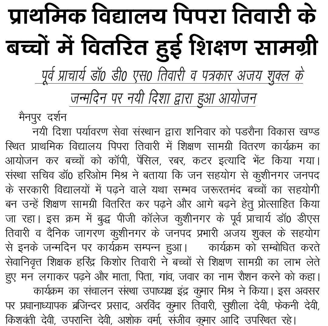 संस्थान द्वारा पडरौना विकास खण्ड स्थित प्राथमिक विद्यालय पिपरा तिवारी में बुद्ध पीजी कॉलेज कुशीनगर के पूर्व प्राचार्य डॉ0 डीएस तिवारी जी व दैनिक जागरण कुशीनगर के जनपद प्रभारी श्री अजय शुक्ल जी के सहयोग से आपके जन्मदिन पर शिक्षण सामग्री वितरण कार्यक्रम का आयोजन कर बच्चों को कॉपी, पेंसिल, रबर, कटर इत्यादि भेंट किया गया।