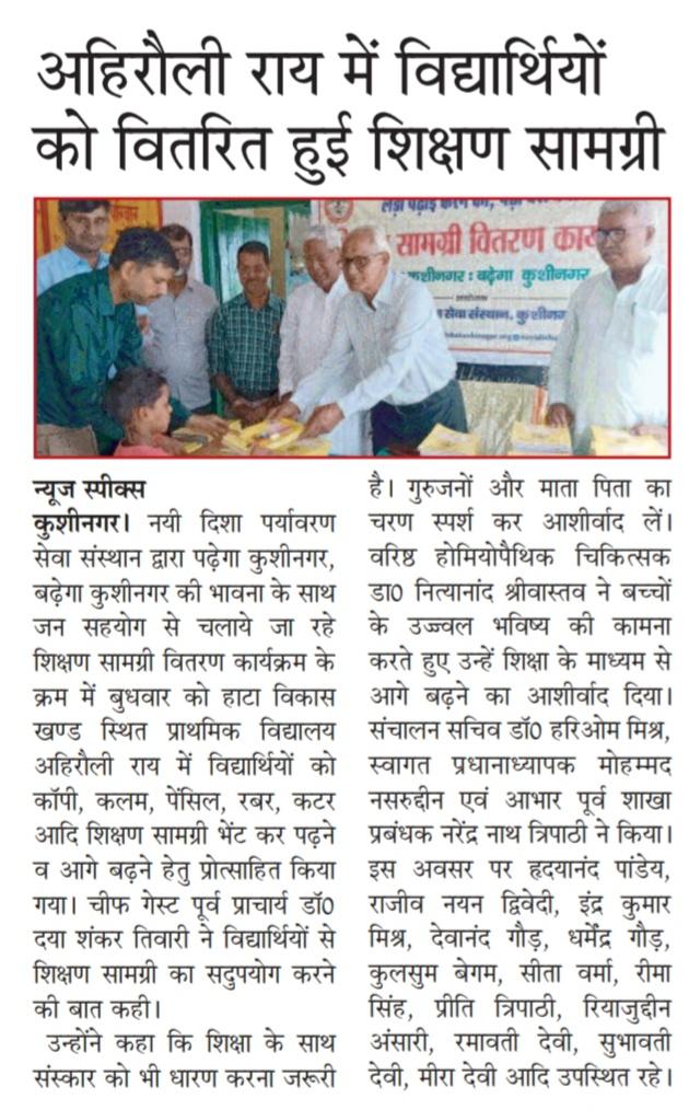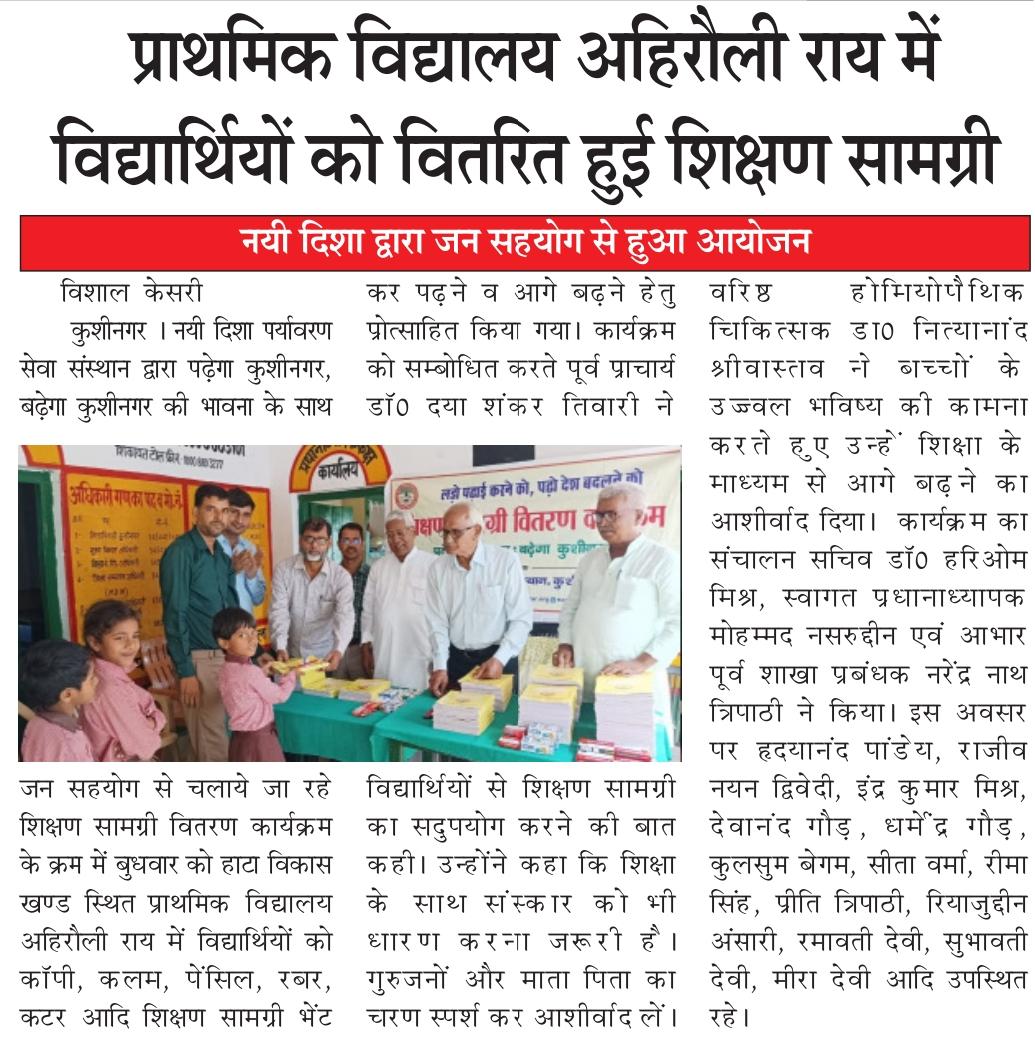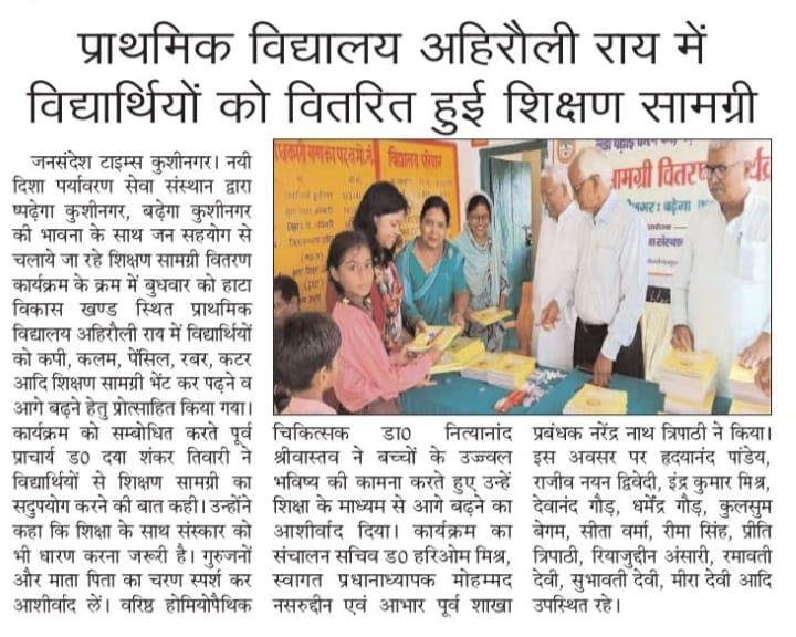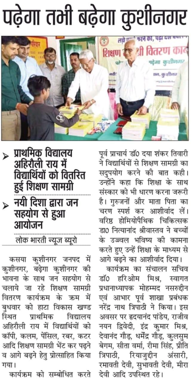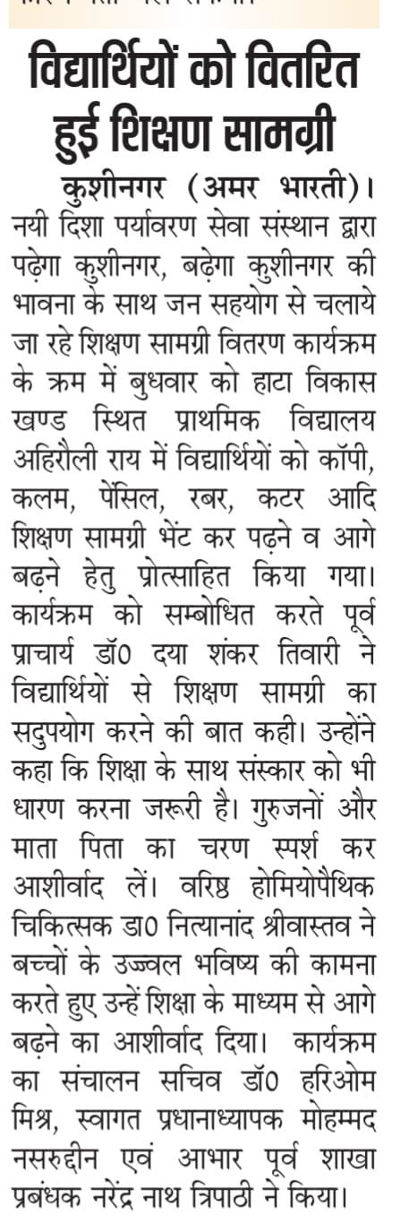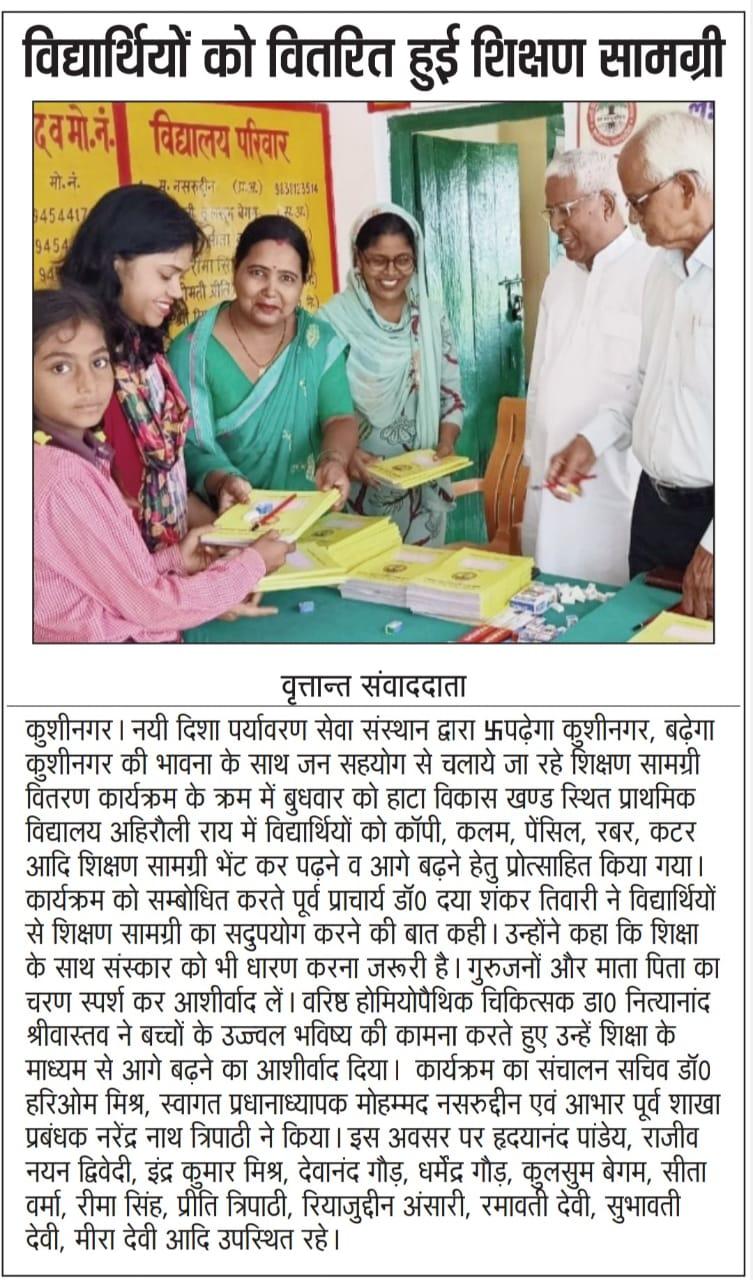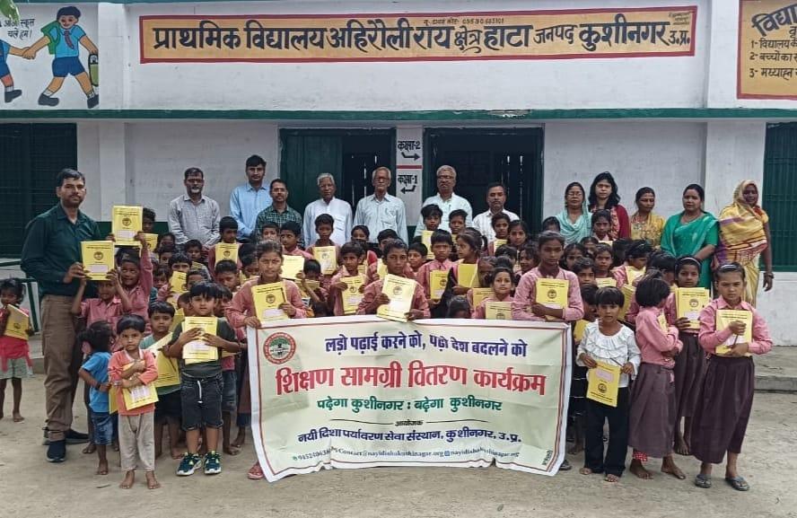 संस्थान द्वारा "पढ़ेगा कुशीनगर, बढ़ेगा कुशीनगर" की भावना के साथ जन सहयोग से चलाये जा रहे शिक्षण सामग्री वितरण कार्यक्रम के क्रम में हाटा विकास खण्ड स्थित प्राथमिक विद्यालय अहिरौली राय में विद्यार्थियों को कॉपी, कलम, पेंसिल, रबर, कटर आदि शिक्षण सामग्री भेंट कर पढ़ने व आगे बढ़ने हेतु प्रोत्साहित किया गया।