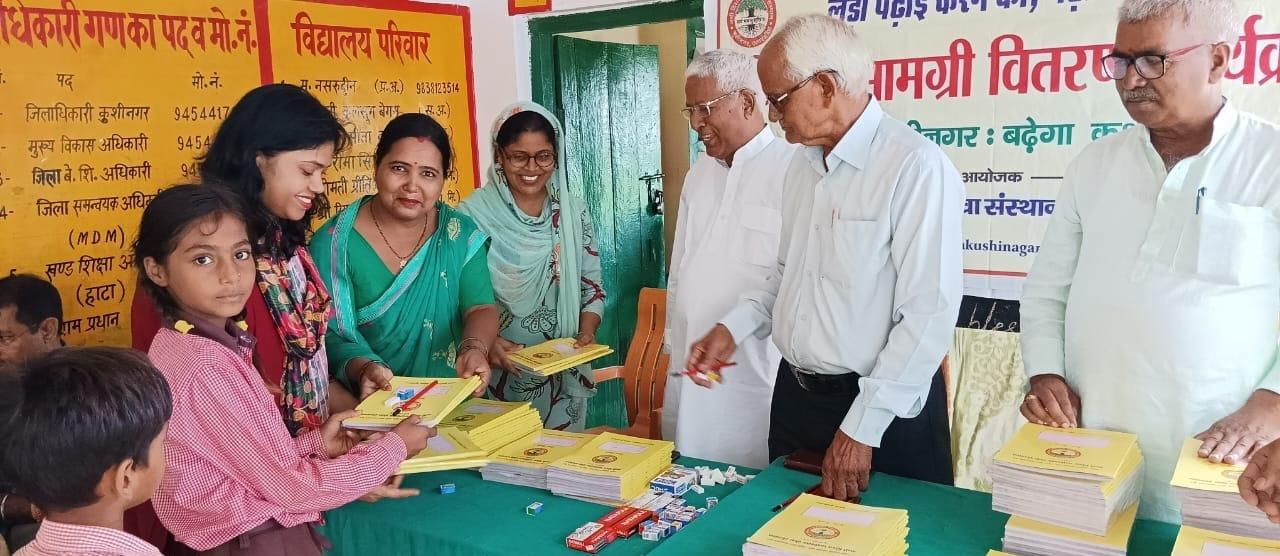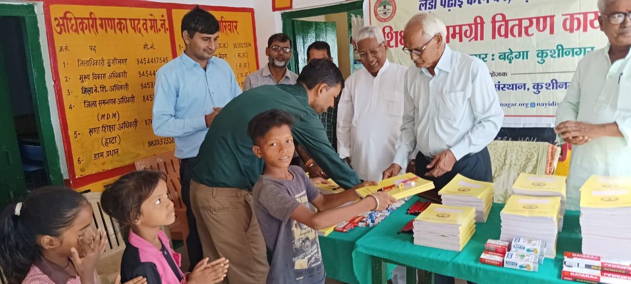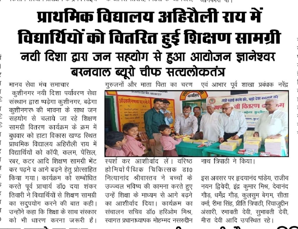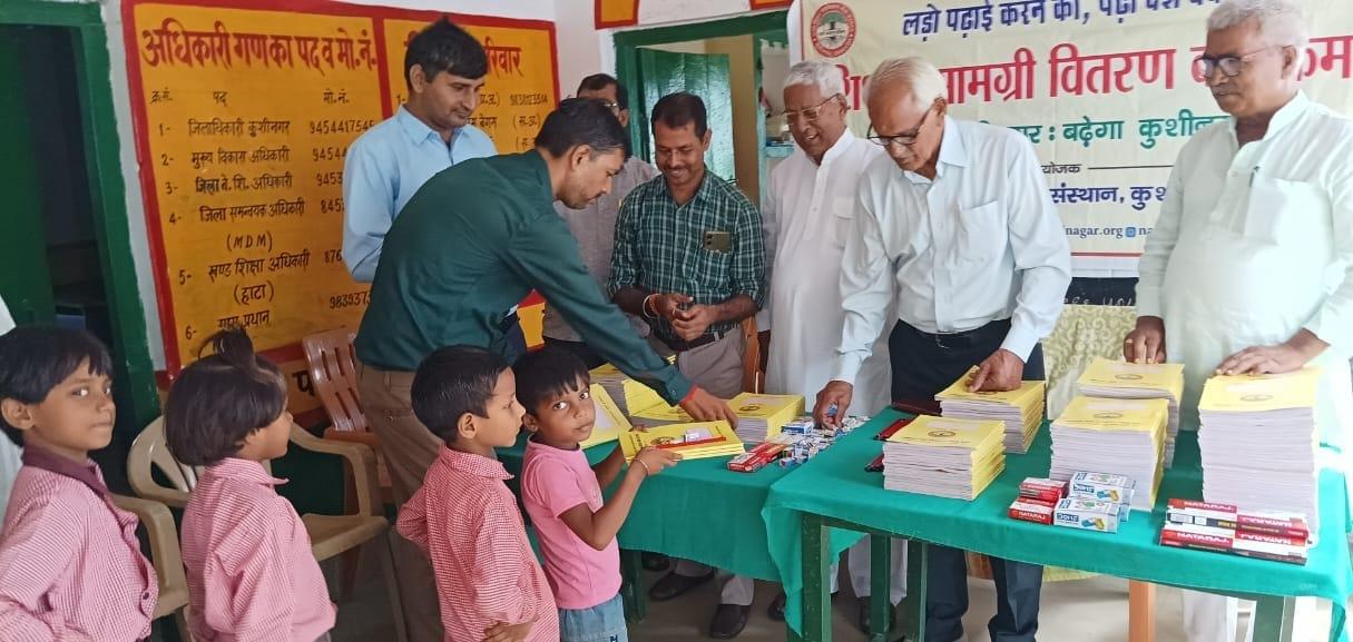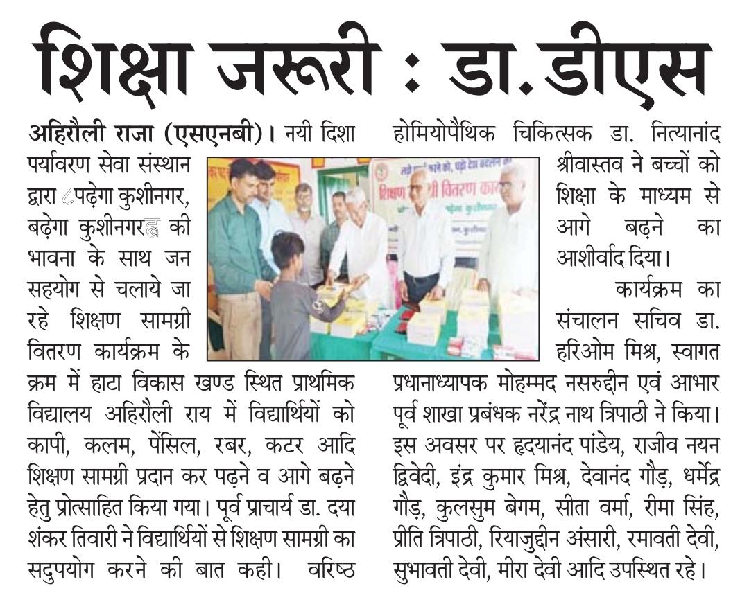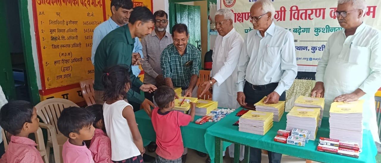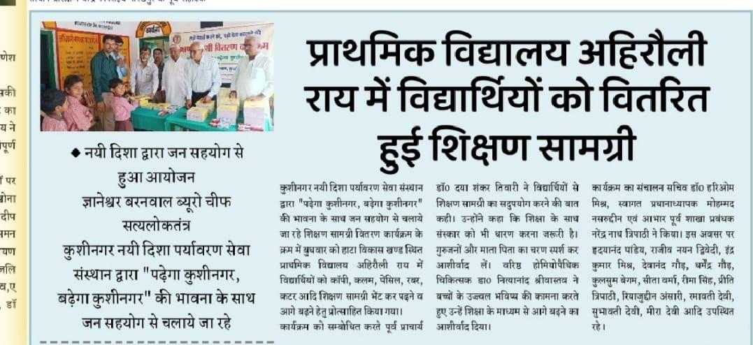 संस्थान द्वारा "पढ़ेगा कुशीनगर, बढ़ेगा कुशीनगर" की भावना के साथ जन सहयोग से चलाये जा रहे शिक्षण सामग्री वितरण कार्यक्रम के क्रम में हाटा विकास खण्ड स्थित प्राथमिक विद्यालय अहिरौली राय में विद्यार्थियों को कॉपी, कलम, पेंसिल, रबर, कटर आदि शिक्षण सामग्री भेंट कर पढ़ने व आगे बढ़ने हेतु प्रोत्साहित किया गया।