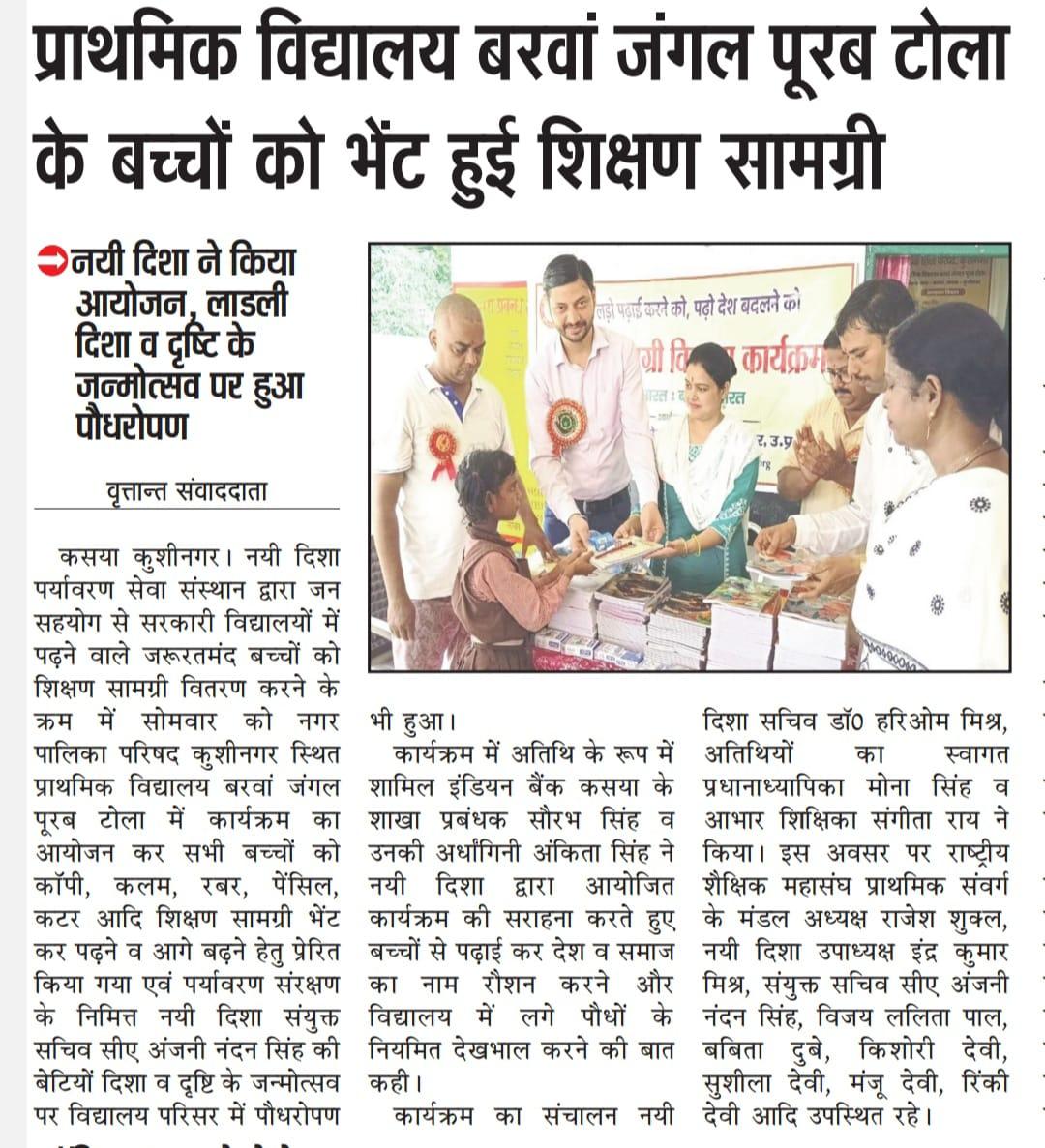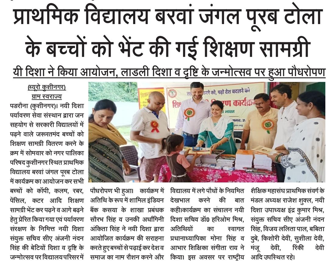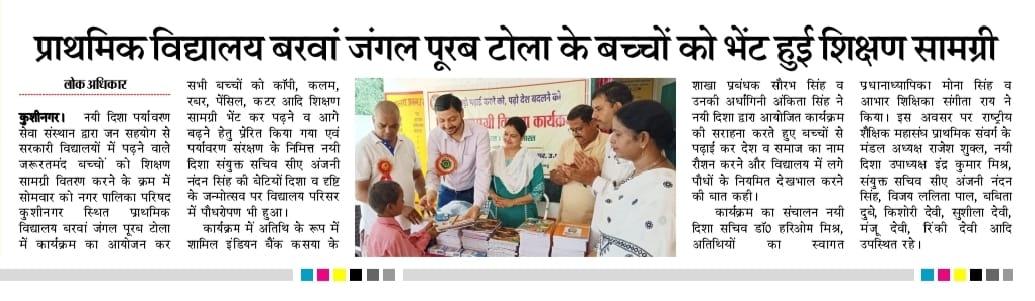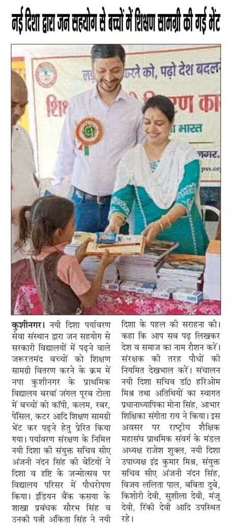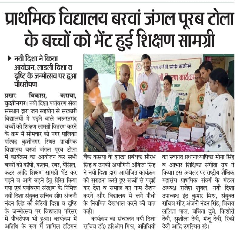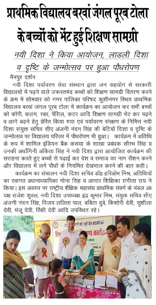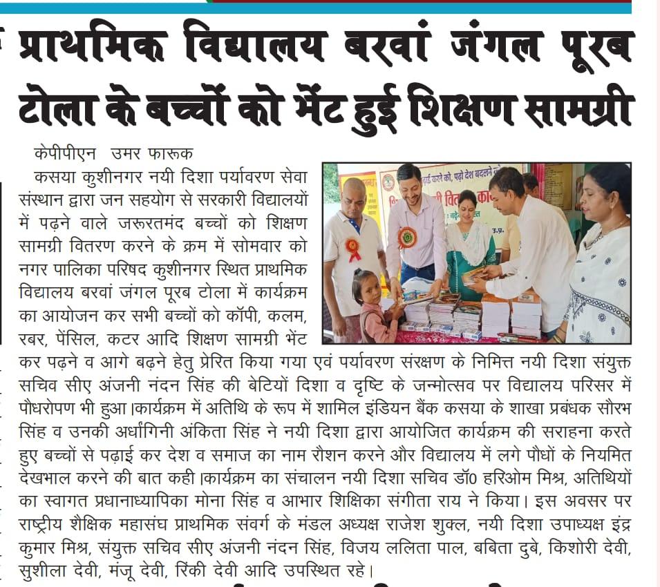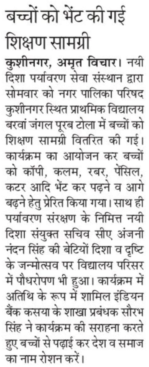 संस्थान द्वारा जन सहयोग से सरकारी विद्यालयों में पढ़ने वाले जरूरतमंद बच्चों को शिक्षण सामग्री वितरण करने के क्रम में नगर पालिका परिषद कुशीनगर स्थित प्राथमिक विद्यालय बरवां जंगल पूरब टोला में कार्यक्रम का आयोजन कर सभी बच्चों को कॉपी, कलम, रबर, पेंसिल, कटर आदि शिक्षण सामग्री भेंट कर पढ़ने व आगे बढ़ने हेतु प्रेरित किया गया एवं पर्यावरण संरक्षण के निमित्त नयी दिशा संयुक्त सचिव सीए श्री अंजनी नंदन सिंह की बेटियों दिशा व दृष्टि के जन्मोत्सव पर विद्यालय परिसर में पौधरोपण भी हुआ।